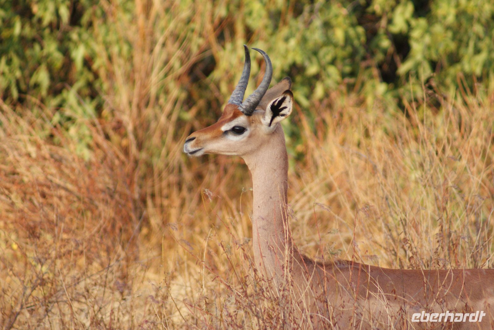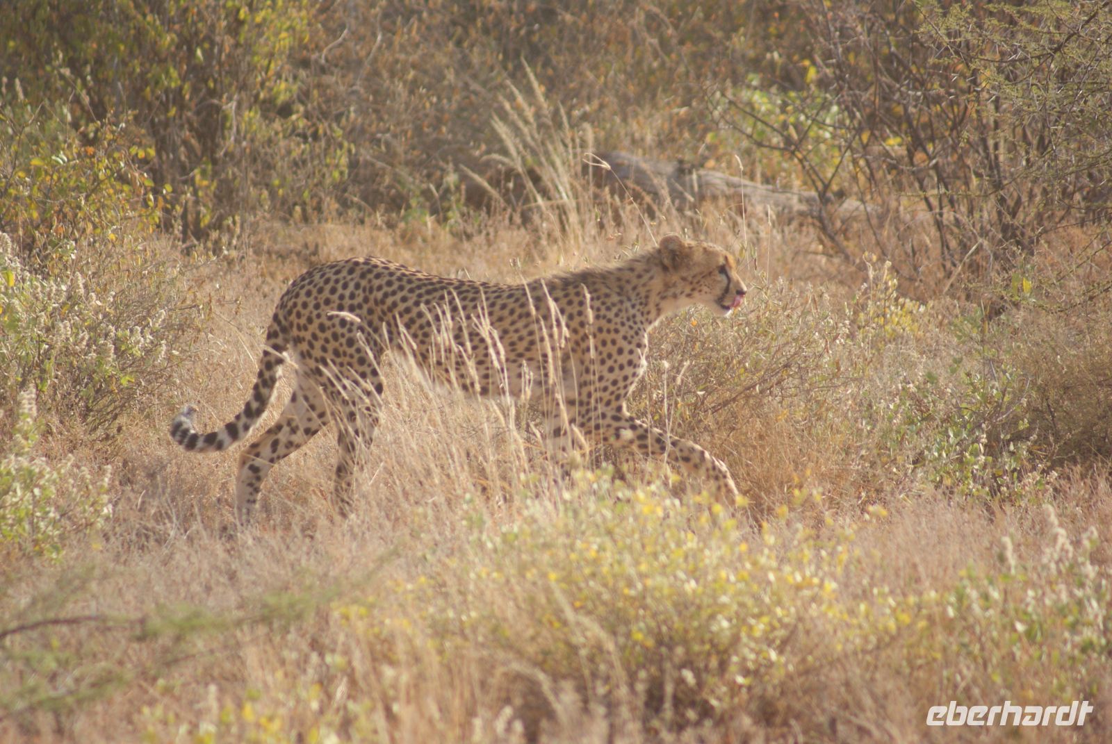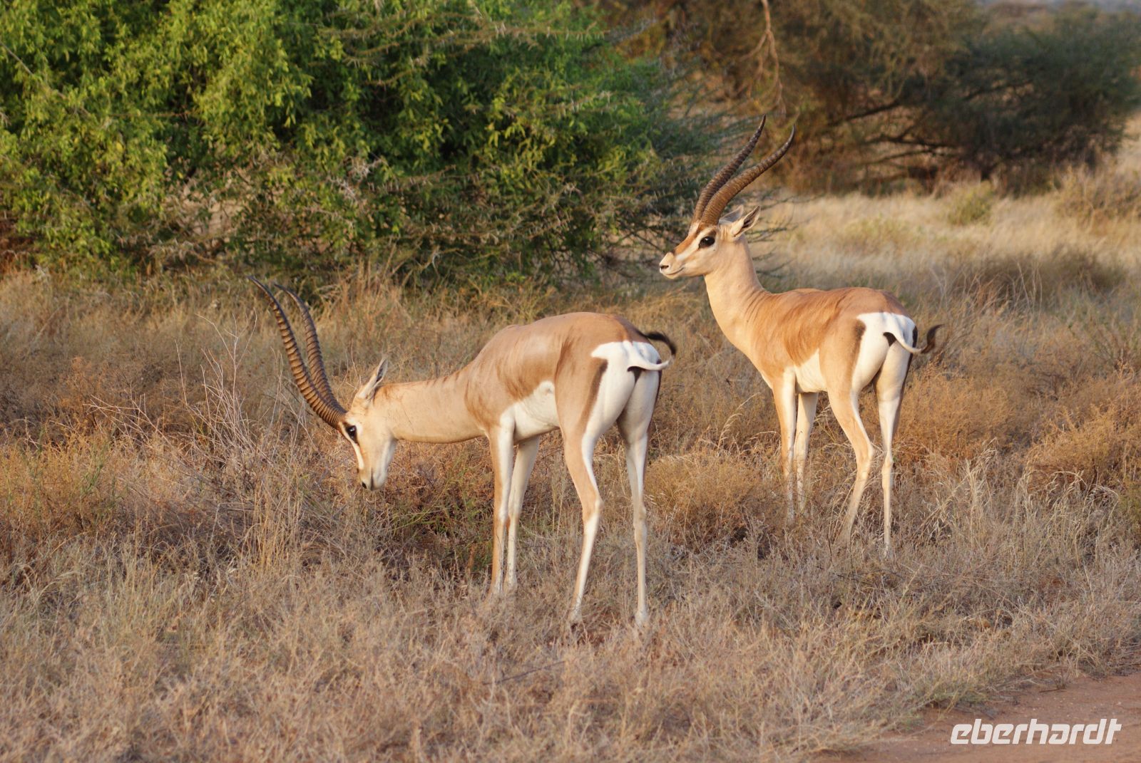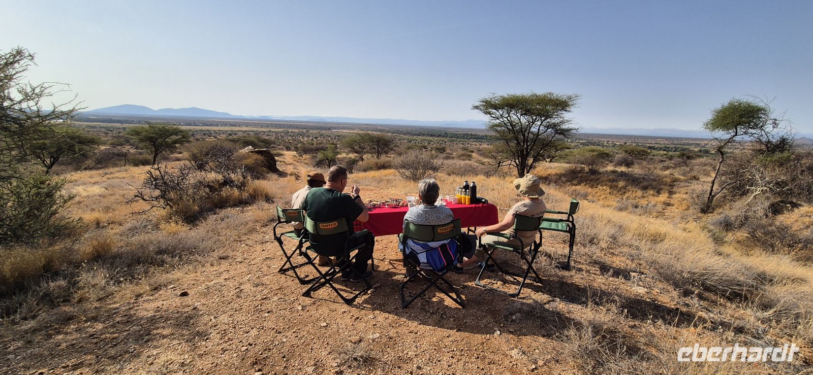 Mit einem sanften persönlichen Weckruf dazu ein Tablett mit duftendem Kaffee begrüßen uns die Campmitarbeiter am Zelt – durch eine kleine Schleuse wird der Kaffee ins Innere gereicht, so beginnt der Tag auf typisch afrikanische Weise: charmant, leise und mit Blick auf die Natur. Die kurz danach aufgehende Sonne taucht die trockene Savannenlandschaft in warmes Licht, als wir aufbrechen zu unserer morgendlichen Pirschfahrt. Das Frühstück ist im Gepäck – stilecht als „Bush Breakfast“, liebevoll vom Camp vorbereitet und in Taschen verpackt. Auch Tisch und Stühle reisen mit, denn wir haben uns für ein Frühstück mitten im Busch entschieden. Unsere Fahrt führt uns durch die wunderschöne Landschaft des Samburu National Reserve, einem der ursprünglichsten Parks Kenias. Das Reservat liegt nördlich des Mount Kenya und ist bekannt für seine besondere Tierwelt – viele Arten, die es nur nördlich des Äquators gibt, leben hier: darunter die endemische Rothschildgiraffe, das Grevyzebra und die Giraffengazelle, auch als Gerenuk bekannt. Schon am frühen Morgen zeigt sich das Reservat von seiner besten Seite. Wir beobachten zahlreiche Elefanten, die gemächlich durch das trockene Flussbett des Ewaso Nyiro ziehen. Kleine Dik Diks huschen durchs Unterholz – kaum größer als ein Hase und dabei so scheu wie possierlich. Ein majestätischer Raubadler kreist vor uns, während ein Graukopflist geduldig im Geäst sitzt. Höhepunkt der morgendlichen Fahrt sind ohne Frage drei Geparden, die sich mit gespitzten Ohren und fokussiertem Blick an ihre Beute heranpirschen. Die Spannung ist mit Händen zu greifen – ein echtes Safarierlebnis in freier Wildbahn. Später genießen wir unser Frühstück unter freiem Himmel – die Speisen haben wir am Vorabend gemeinsam mit dem Küchenchef ausgewählt, und sie schmecken so gut, wie sie uns angepriesen wurden. Ein kurzer „Busch-Stopp“ in sicherer Entfernung gehört natürlich dazu – Abenteuer mit Komfort, typisch Safari eben. Gegen Mittag kehren wir voller Eindrücke zurück ins Camp. Wir sind hungrig – nicht nur auf das nächste Abenteuer, sondern auch auf das köstliche Mittagessen, das schon auf uns wartet. Die Küche verwöhnt uns erneut mit liebevoll zubereiteten Gerichten. Nun noch ein wenig ruhen und schon ruft Nick und somit das nächste Safari-Kapitel – am Nachmittag geht es erneut hinaus in die weite Wildnis des Samburu-Nationalparks. Die Sonne taucht die Landschaft in warmes Licht, und schon bald begegnen wir den ersten scheuen Bewohnern: ein paar flinke Dik Diks huschen durchs trockene Buschland, kaum größer als ein Hase sind sie sehr possierlich anzusehen. Dann ein ganz besonderer Moment: Wir entdecken erneut Gerenuks! Die grazilen Antilopen mit den langen Hälsen geben einen Anblick, der uns schmunzeln lässt. Sie sehen aus wie eine Mischung aus Antilope und Giraffe – skurril, aber wunderschön.