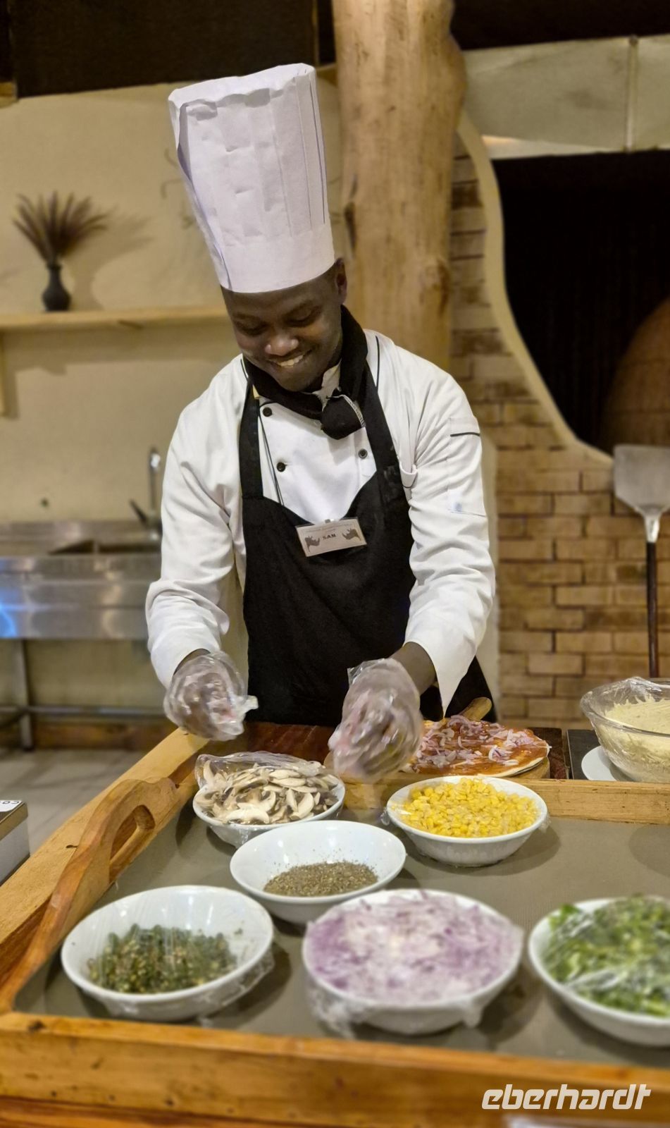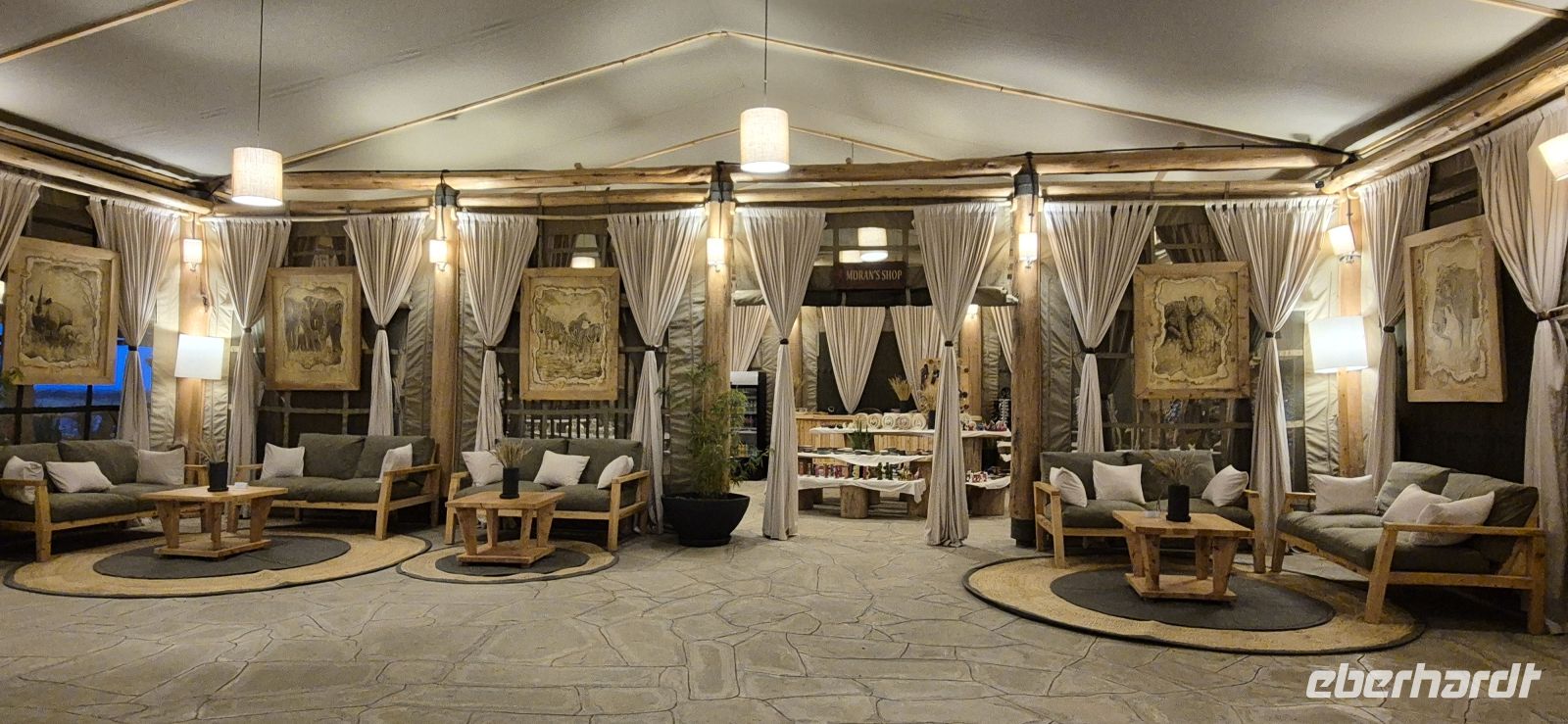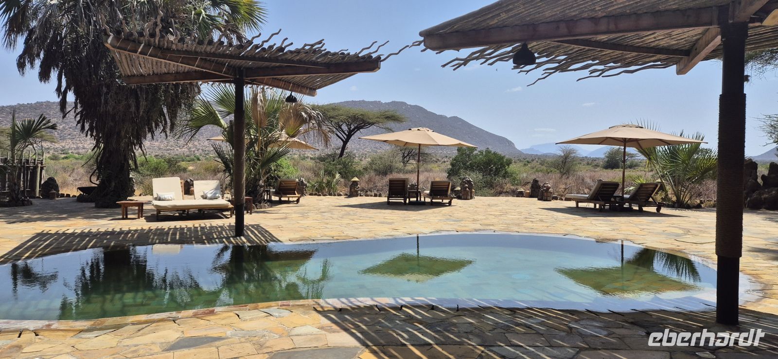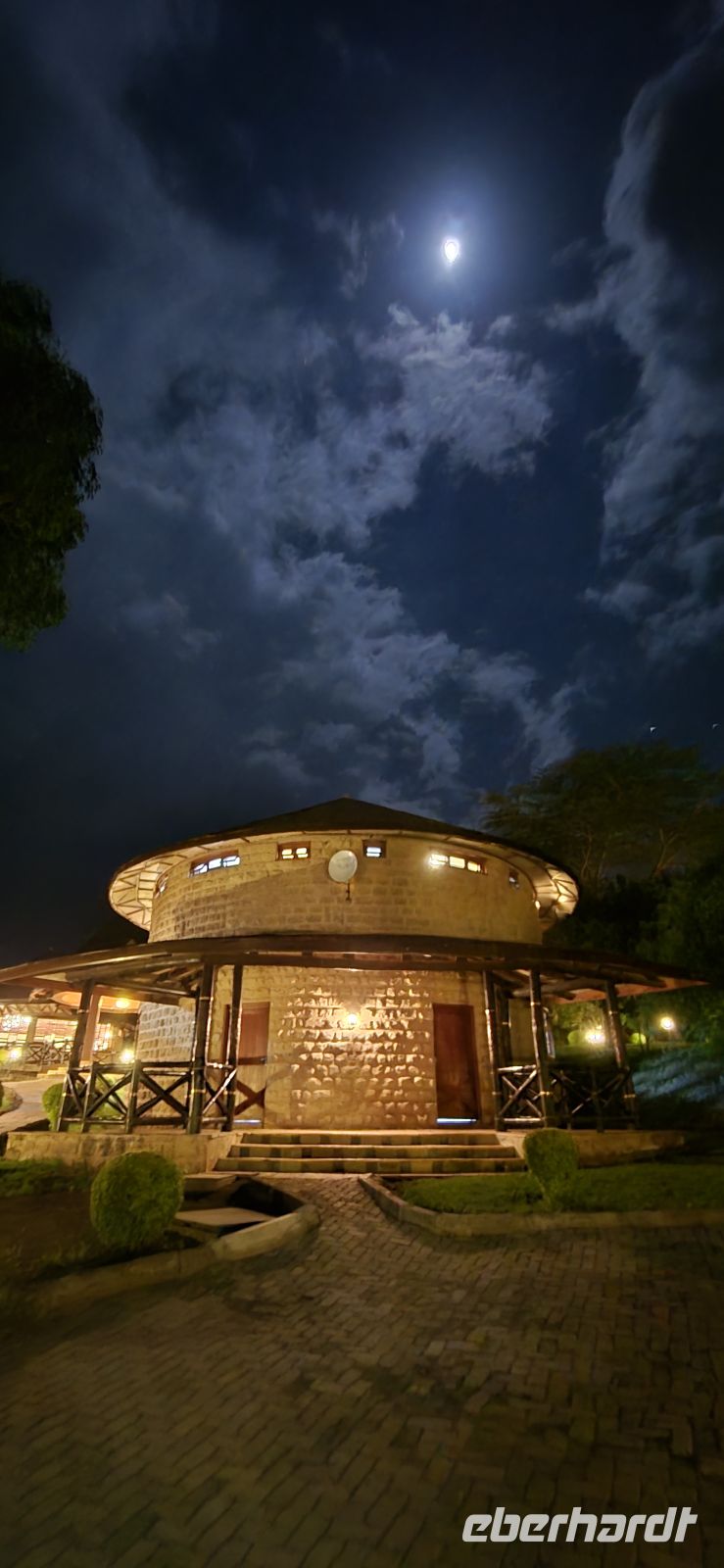 In der Lodge angekommen, begrüßt uns Campmanager Harrison mit einem herzlichen Lächeln, kühlem Drink und einer kurzen Einführung. Die luxuriösen Zelte, die wir kurz darauf beziehen, sind ein Traum – geräumig, stilvoll, mit allem Komfort. Es gibt einen kostenfreien Waschservice, Kaffee auf Wunsch den ganzen Tag, einen Safe im Zelt und Trinkwasser aus dem Spender. Somit fehlt es hier an nichts und wir sind schon gespannt, die ganze Anlage bei Tageslicht zu erkunden. Zum Abendessen erwartet uns ein stimmungsvolles Open-Air-Buffet unter dem Sternenhimmel: Suppe, Vorspeise und Desserts am Buffet, dazu Showcooking mit Pasta und frisch gebackener Pizza direkt aus dem Steinofen. Ein kulinarischer Genuss inmitten der Wildnis! Zum krönenden Abschluss begeistert uns eine Samburu-Tanzgruppe mit rhythmischen Klängen und energiegeladenen Tänzen – ein farbenfrohes Willkommen im Norden Kenias. Ein gelungener Tag voller erster Eindrücke zu Land und Leuten entlang unseres Weges, dazu Geschmackserlebnisse und erster Safari-Gefühle.