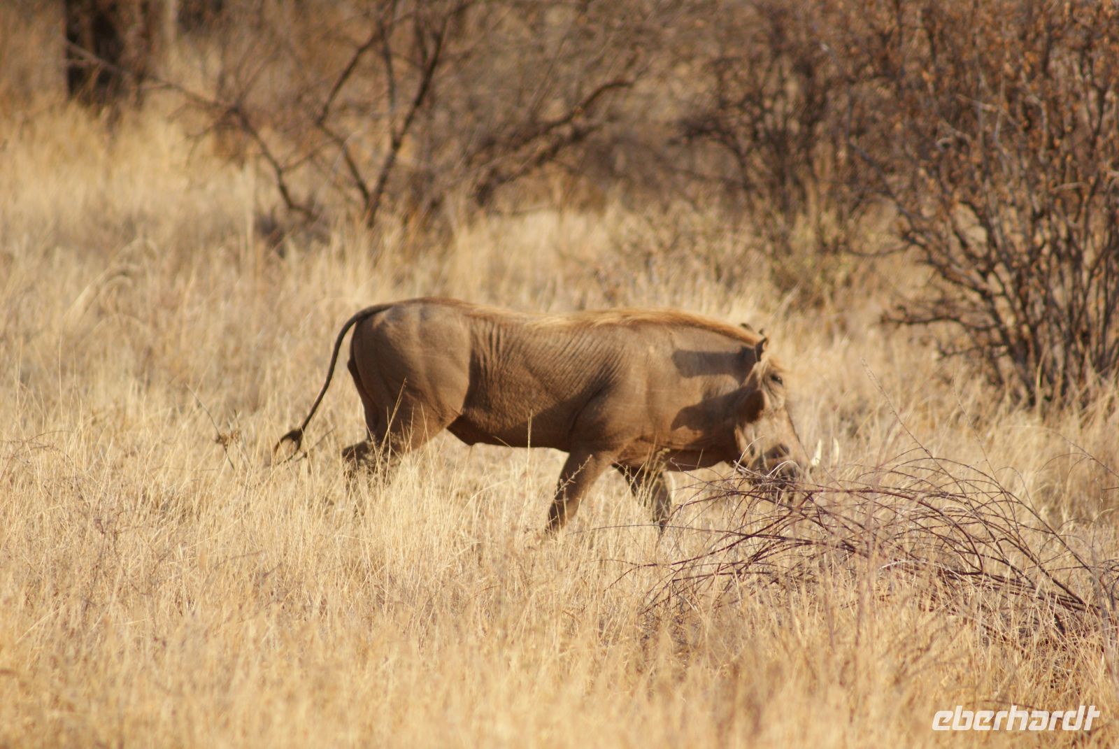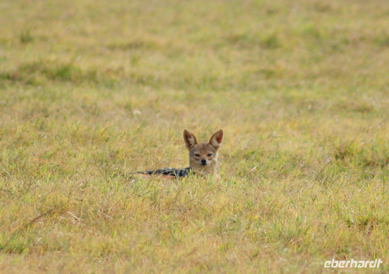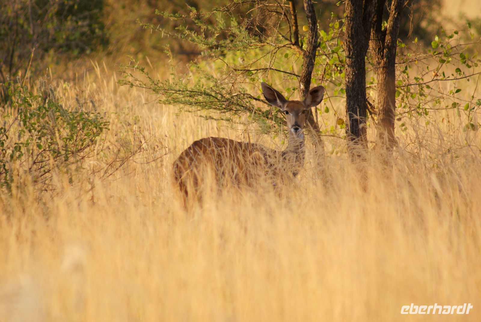 Nach einer geruhsamen Nacht treffen wir uns mit dampfendem Kaffee in der Hand und starten in den Tag – vor uns erwacht die Savanne und wir hören bereits leises Plätschern an unseren beiden Wasserlöchern. Schon beim ersten Blick entdecken wir Bewegung: Eine Antilope huscht durchs hohe Gras, Vögel flattern aufgeregt von Ast zu Ast. Pünktlich um 06:15 Uhr brechen wir mit unserem Guide und Reisefamilienmitglied Nick zur Morgenpirsch auf. Die Sonne schiebt sich gerade über den Horizont, das Licht ist weich, golden – die Savanne erwacht. Und dann – ein Moment zum Innehalten: Ein Caracal! Eine wahre Safari-Sensation! Der schlanke Wildkatzenjäger mit den markanten schwarzen Pinselohren läuft direkt vor uns durch das dichte Gras. Selbst Nick, der schon unzählige Pirschfahrten hinter sich hat, ist völlig aus dem Häuschen. Caracals sind extrem scheu und nachtaktiv – sie zu Gesicht zu bekommen, ist ein echter Glückstreffer. Wir halten die Luft an, staunen, fotografieren, schweigen vor Ehrfurcht.