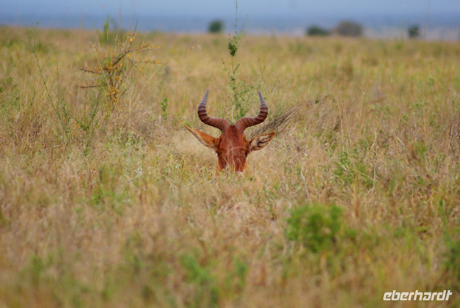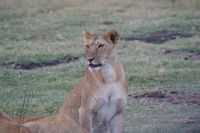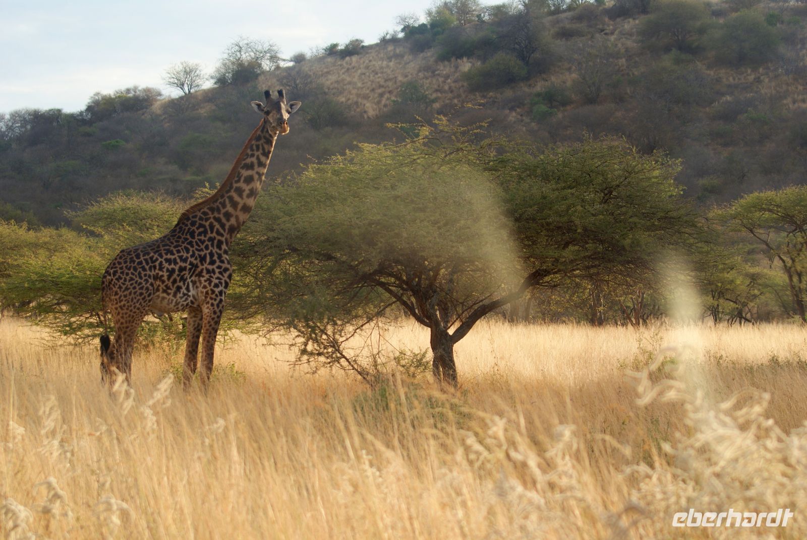 Sofort fällt uns auf, wie anders diese Region ist – sanfte Hügellandschaft, dichteres Grün, ein Gefühl von Weite. Die Tierwelt präsentiert sich eindrucksvoll: Wir begegnen drei Nashörnern, die gemächlich durchs Gras ziehen, sehen vier Löwen, die wir über längere Zeit beobachten dürfen – majestätisch und vollkommen unbeeindruckt von unserer Anwesenheit. Eine Hyäne taucht in der Abenddämmerung auf, neugierig und scheu zugleich. Wir entdecken außerdem Rothschildgiraffen mit ihren markanten, hellen Fellzeichnungen und eine elegante Thompsongazelle, die fast schwerelos durch das Gras huscht. Zufrieden kehren wir ins Camp zurück. Die Abendstimmung senkt sich langsam über das Land, die Geräusche der Wildnis begleiten uns in den Abend. Zwei Nächte dürfen wir hier verbringen – und wir freuen uns auf alles, was noch vor uns liegt.
