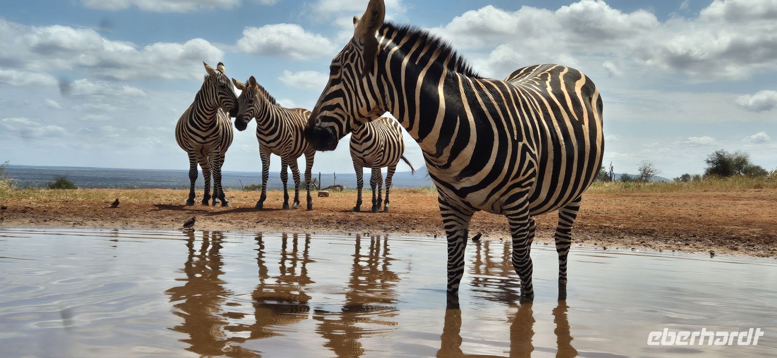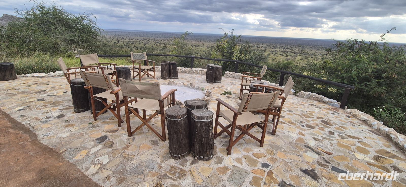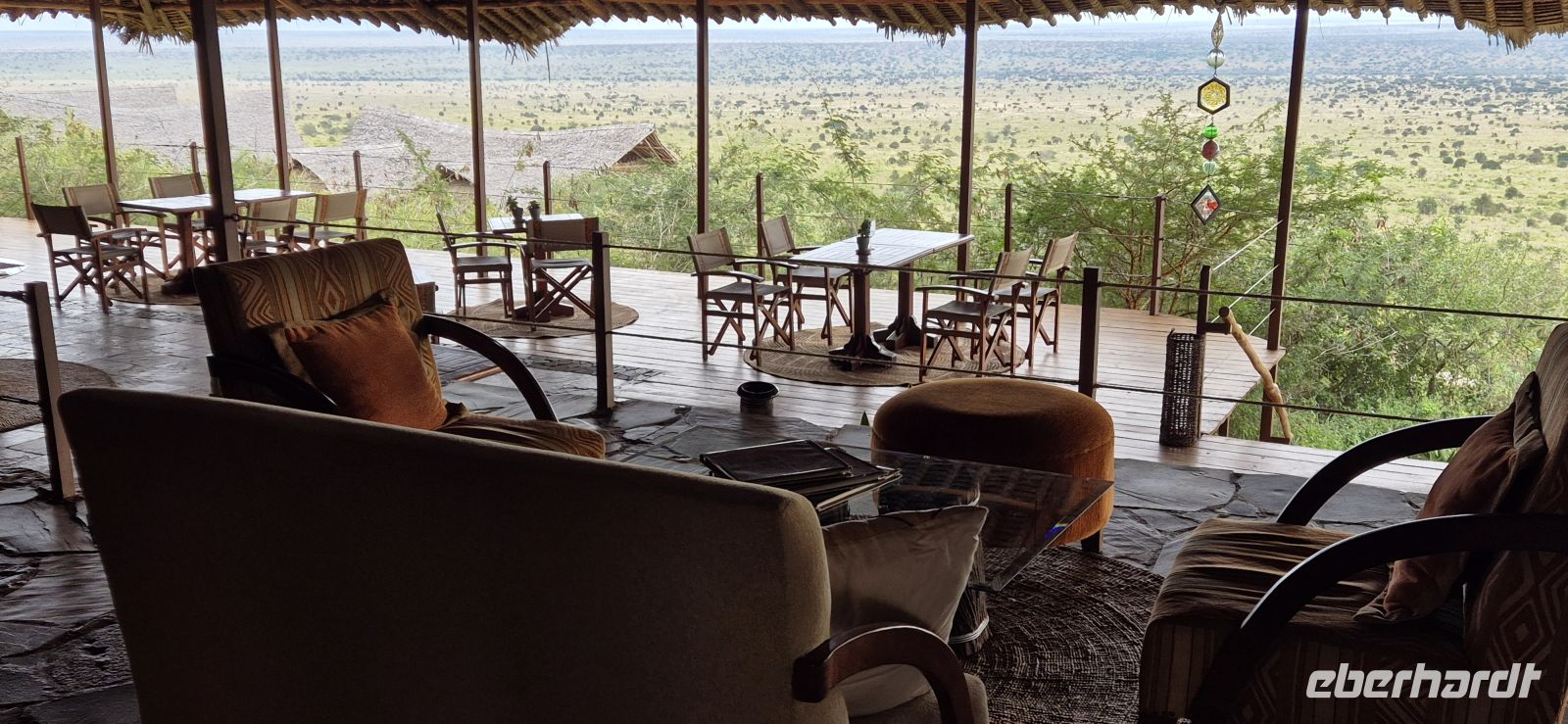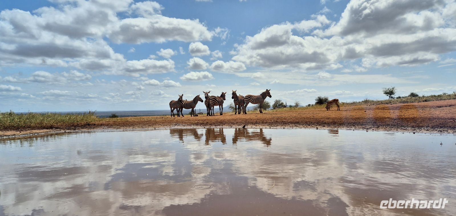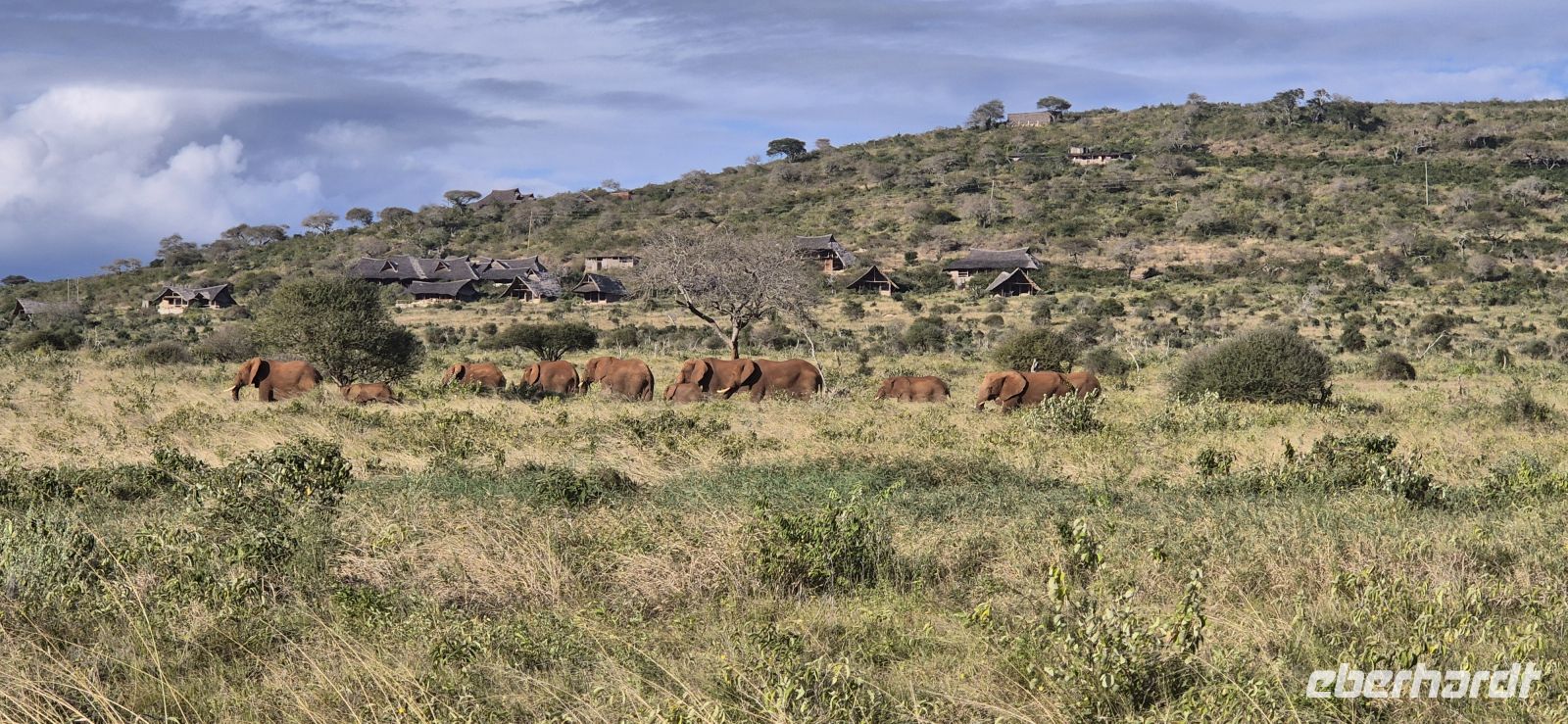 Ein freudiges Wiedersehen: „Welcome back!“ – Wir werden mit offenen Armen empfangen, denn als Eberhardt-Stammgäste sind wir hier längst keine Fremden mehr. Die Lodge liegt traumhaft eingebettet in der Weite des Tsavo – mit freiem Blick auf zwei Wasserlöcher direkt vor der Terrasse. Wir nehmen unseren Platz zum Abendessen ein – ein Tisch mit Aussicht. Doch bevor wir die ersten Bissen kosten können, stockt uns der Atem: Über zwanzig Elefanten haben sich am Wasserloch versammelt! Ein gewaltiges Getümmel aus Rüsseln, Ohren und Staubwolken – spielende Jungtiere, mächtige Matriarchinnen, alle vereint um die Gunst des kühlen Nasses. Dazu kommen Zebras, die zum Trinken erscheinen, und eine Hyäne, die sich vorsichtig heranschleicht. Die Stimmung: fast irreal. Wie in einem Naturdokumentarfilm – nur dass wir mittendrin sind.
