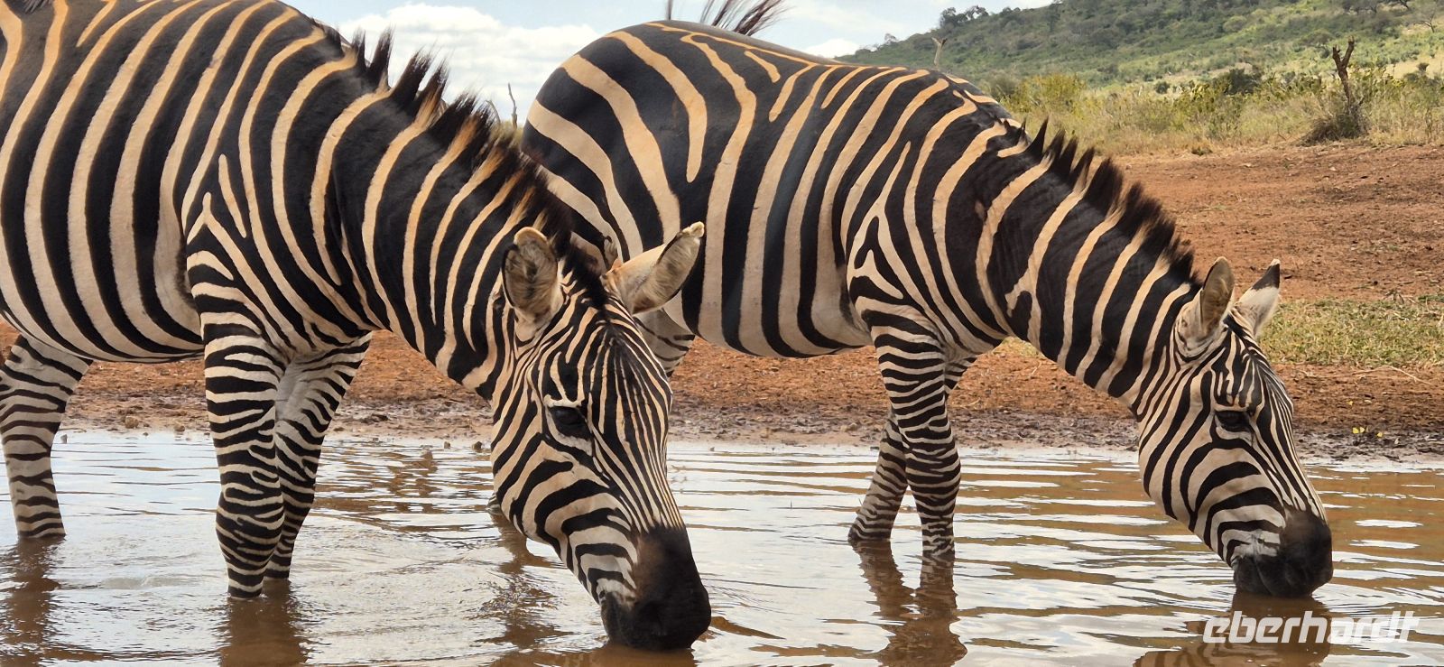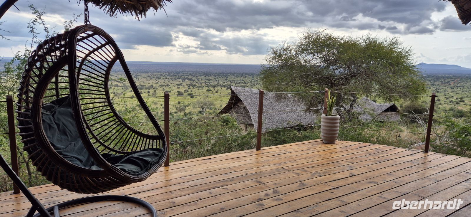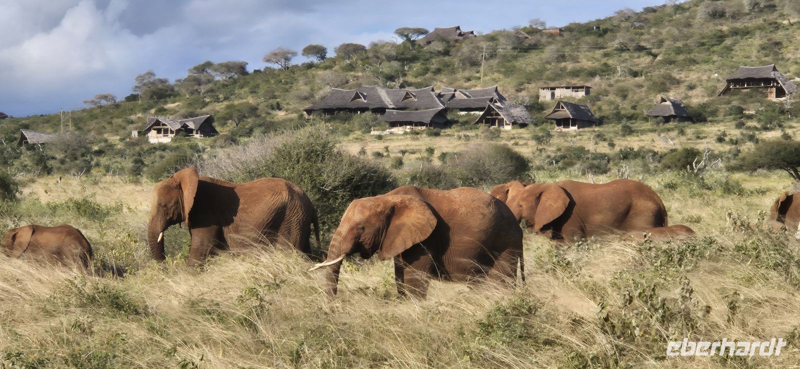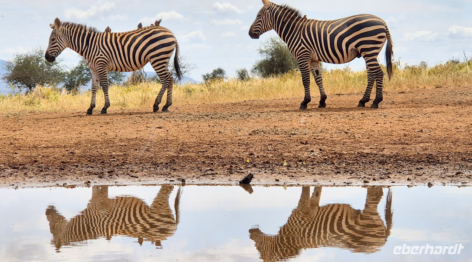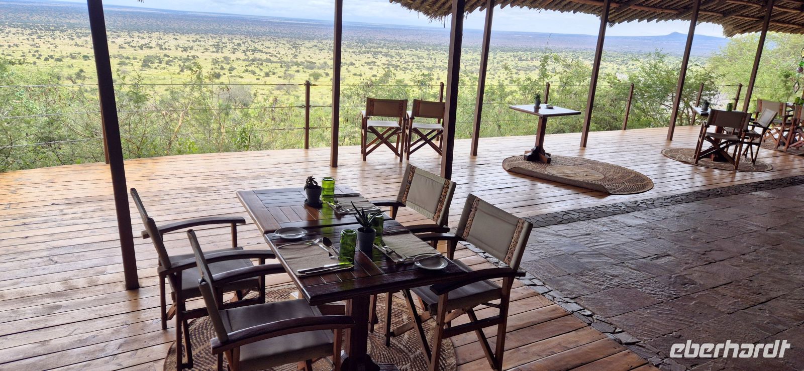 Ein freudiges Wiedersehen: „Welcome back!“ – Wir werden mit offenen Armen empfangen, denn als Eberhardt-Stammgäste sind wir hier längst keine Fremden mehr. Die Lodge liegt traumhaft eingebettet in der Weite des Tsavo – mit freiem Blick auf zwei Wasserlöcher direkt vor der Terrasse. Wir nehmen unseren Platz zum Abendessen ein – ein Tisch mit Aussicht. Doch bevor wir die ersten Bissen kosten können, stockt uns der Atem: Über zwanzig Elefanten haben sich am Wasserloch versammelt! Ein gewaltiges Getümmel aus Rüsseln, Ohren und Staubwolken – spielende Jungtiere, mächtige Matriarchinnen, alle vereint um die Gunst des kühlen Nasses. Dazu kommen Zebras, die zum Trinken erscheinen, und eine Hyäne, die sich vorsichtig heranschleicht. Die Stimmung: fast irreal. Wie in einem Naturdokumentarfilm – nur dass wir mittendrin sind.