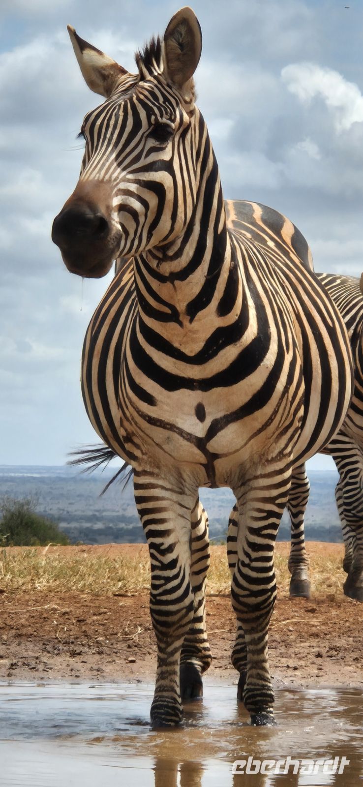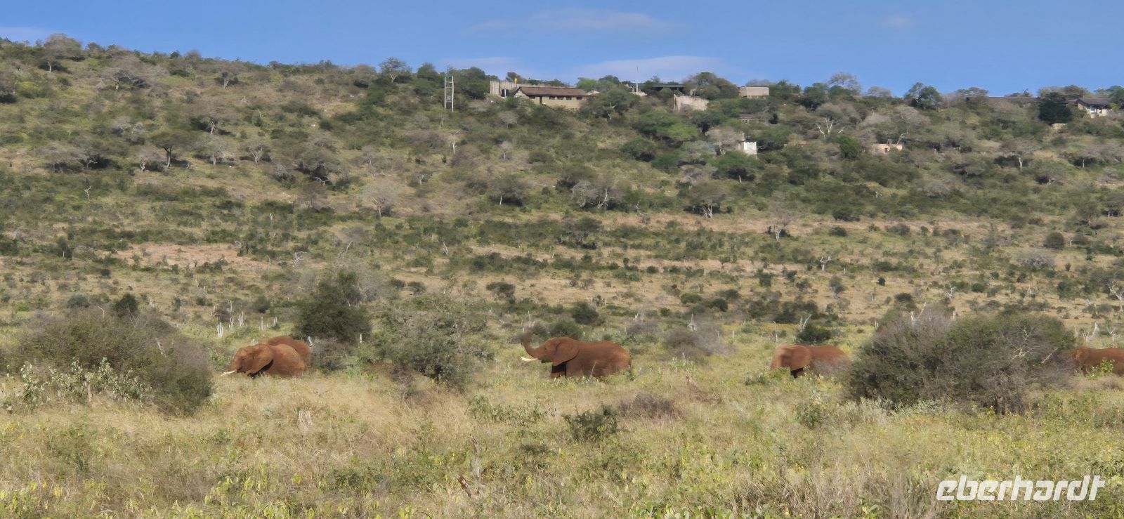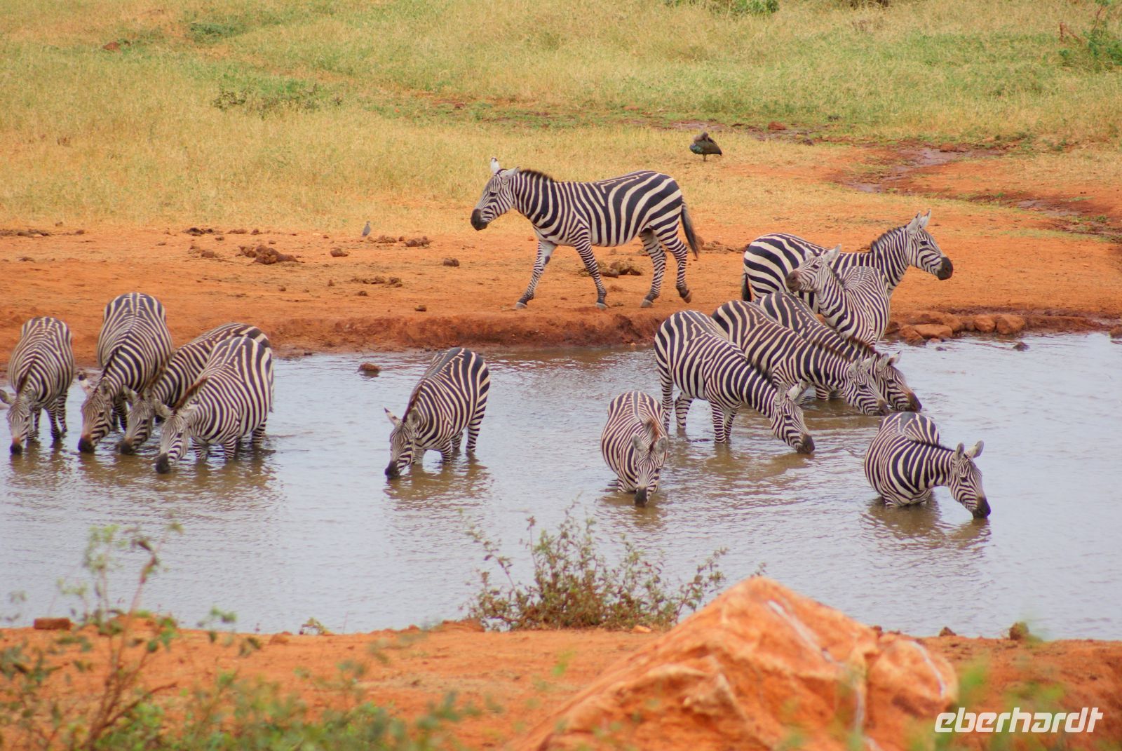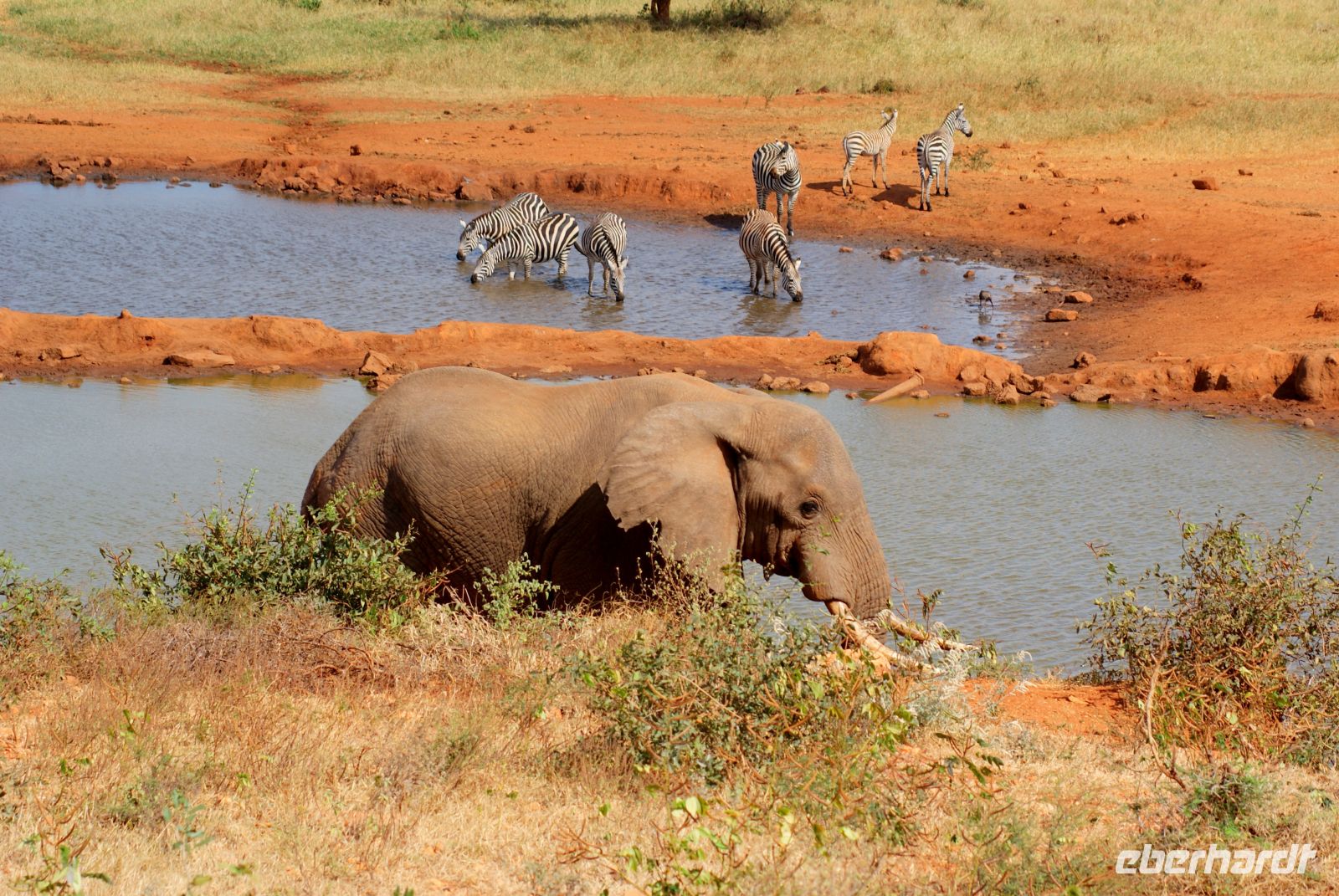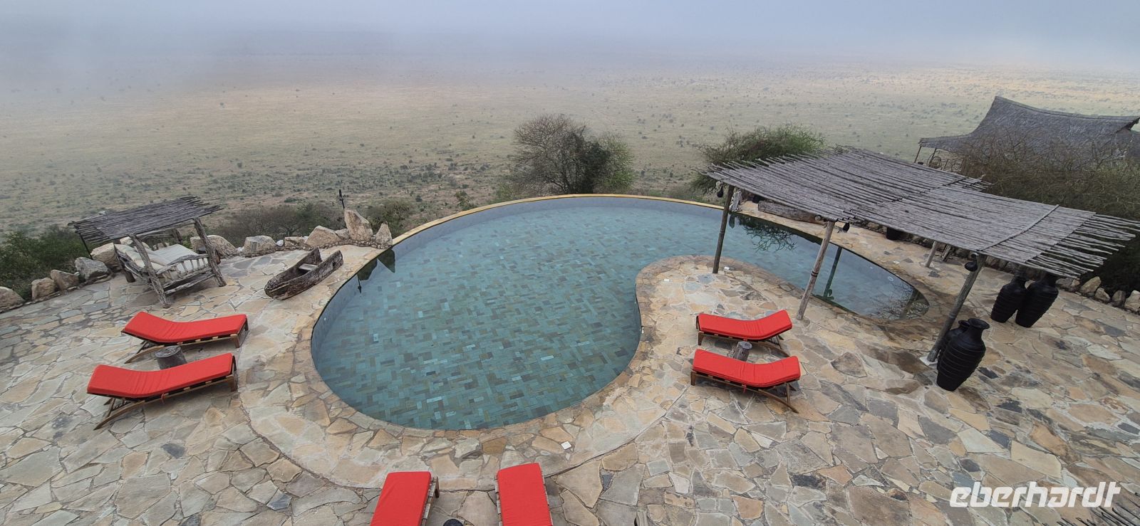 Ein freudiges Wiedersehen: „Welcome back!“ – Wir werden mit offenen Armen empfangen, denn als Eberhardt-Stammgäste sind wir hier längst keine Fremden mehr. Die Lodge liegt traumhaft eingebettet in der Weite des Tsavo – mit freiem Blick auf zwei Wasserlöcher direkt vor der Terrasse. Wir nehmen unseren Platz zum Abendessen ein – ein Tisch mit Aussicht. Doch bevor wir die ersten Bissen kosten können, stockt uns der Atem: Über zwanzig Elefanten haben sich am Wasserloch versammelt! Ein gewaltiges Getümmel aus Rüsseln, Ohren und Staubwolken – spielende Jungtiere, mächtige Matriarchinnen, alle vereint um die Gunst des kühlen Nasses. Dazu kommen Zebras, die zum Trinken erscheinen, und eine Hyäne, die sich vorsichtig heranschleicht. Die Stimmung: fast irreal. Wie in einem Naturdokumentarfilm – nur dass wir mittendrin sind.
