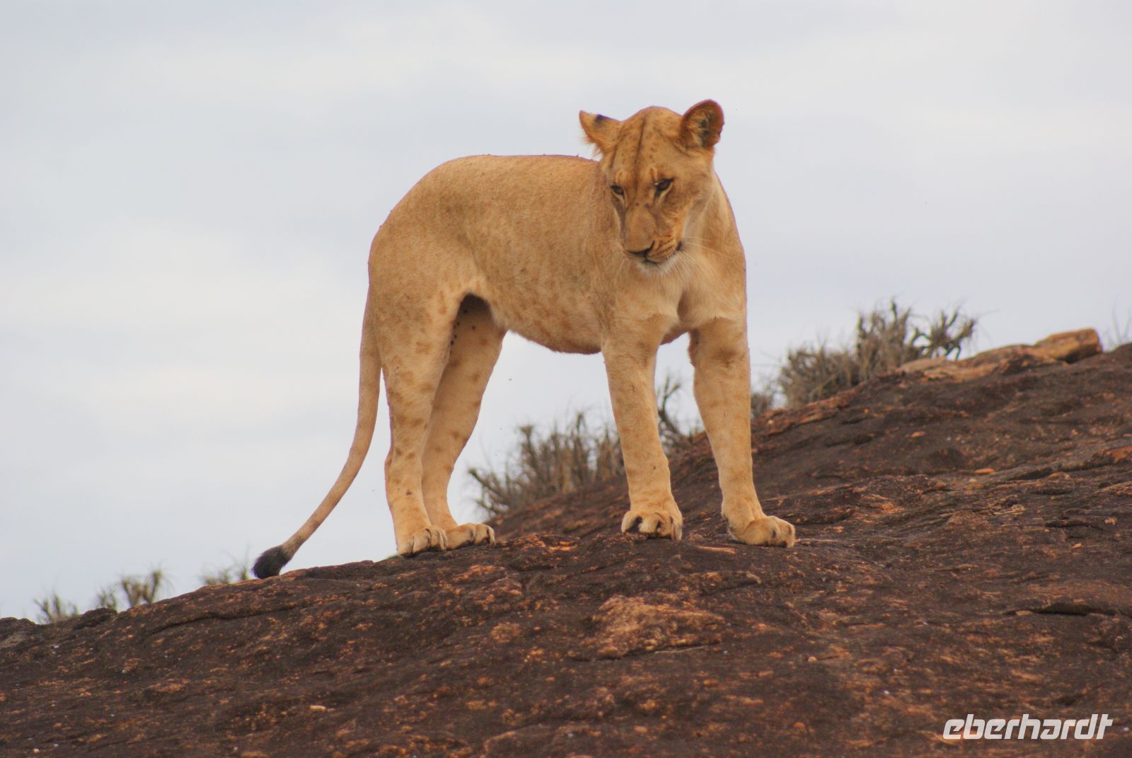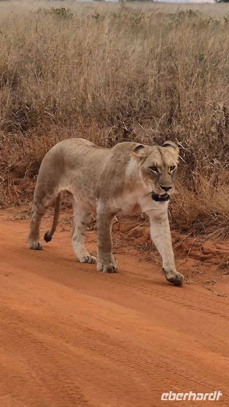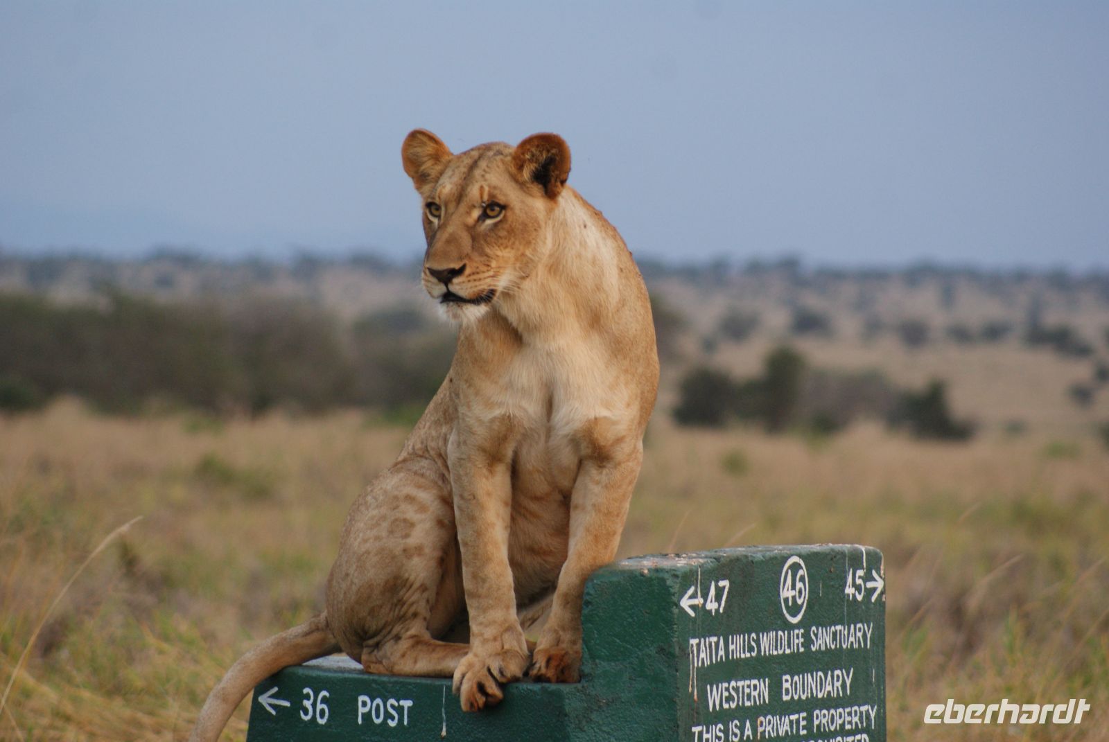 Aber das Beste kommt am Nachmittag: gemeinsam starten wir zu einer spannenden Pirschfahrt im Lumo Community Wildlife Sanctuary, das von lokalen Gemeinden betrieben wird und ein wichtiges Schutzgebiet zwischen Tsavo-West und Tsavo Ost bildet. Und was für eine Safari das wird! Gleich mehrere Löwen lassen sich blicken – einige dösen im hohen Gras, andere spazieren seelenruhig direkt vor oder an unserem Fahrzeug vorbei. Ein majestätischer Anblick! Es ist beeindruckend zu sehen, wie gelassen und selbstbewusst diese Großkatzen durch ihr Revier streifen. Die Nachmittagssonne taucht die Szene in warmes Goldlicht – die Krönung bildet eine Löwin, die es sich auf einem Wegweiser gemütlich gemacht hat! Zum Einbruch der Dunkelheit kehren wir zurück ins Camp, wo das Abendessen heute etwas früher serviert wird. Da das Camp nicht eingezäunt ist, werden wir im Dunkeln von einem freundlichen Wächter begleitet. Ein beruhigendes Gefühl – denn hier draußen in der Wildnis gehört die Nacht den Tieren.