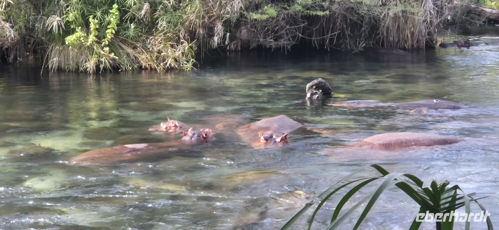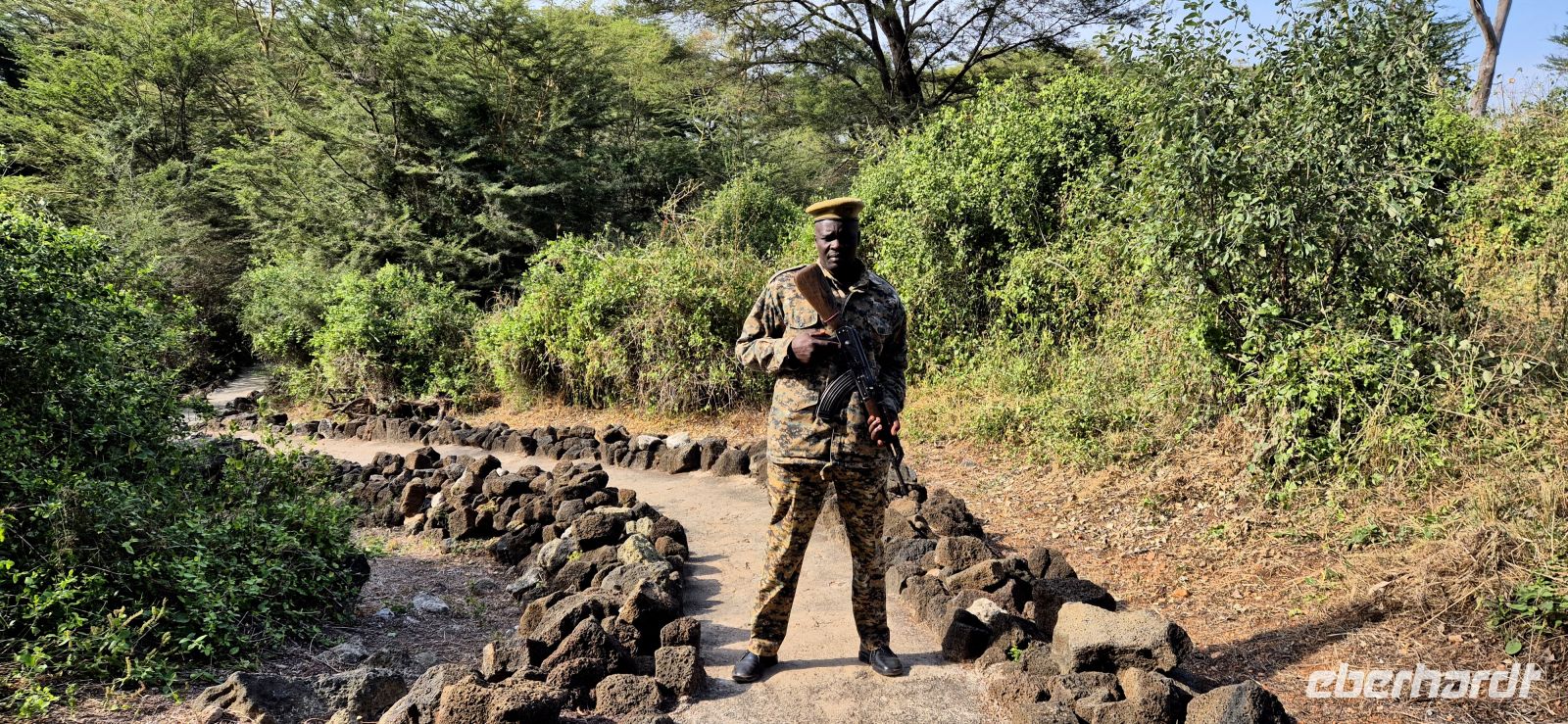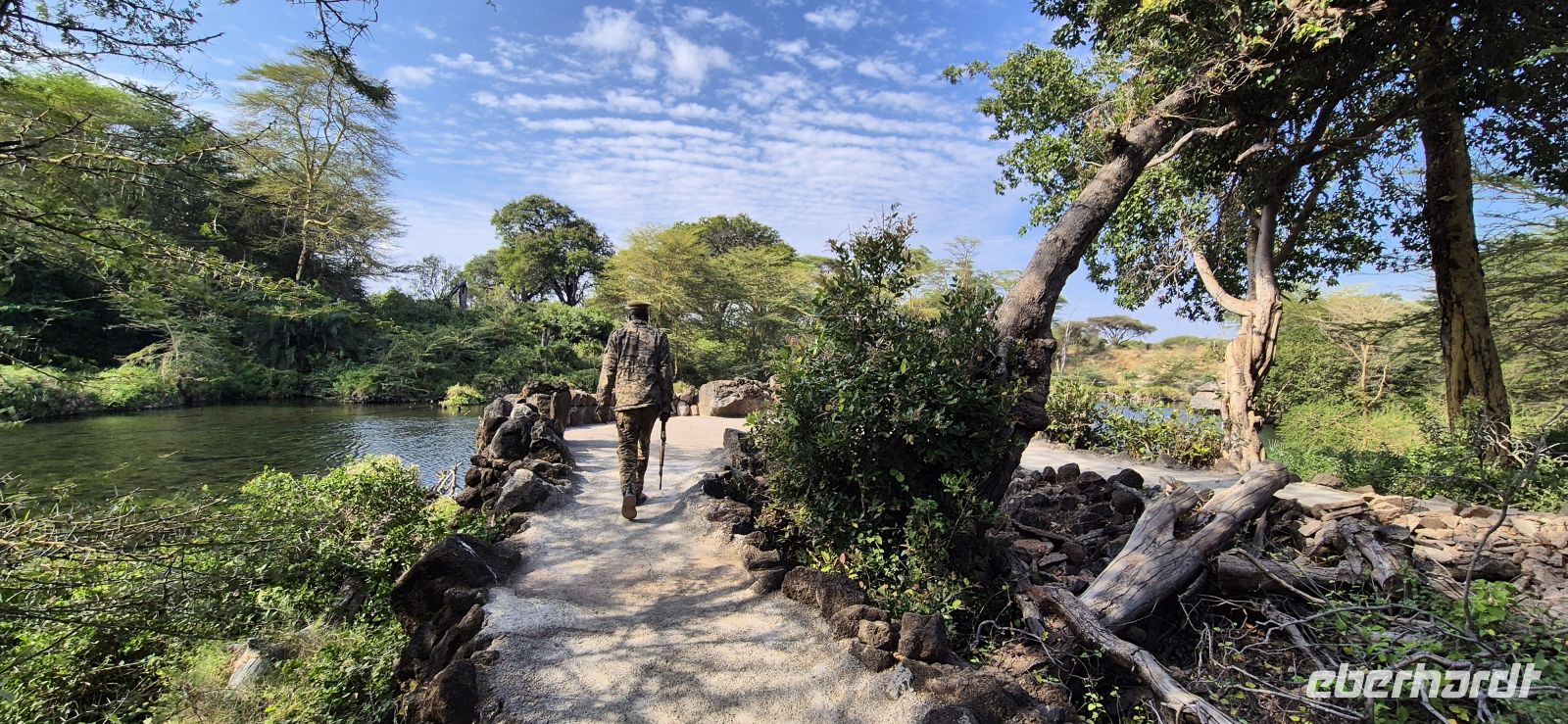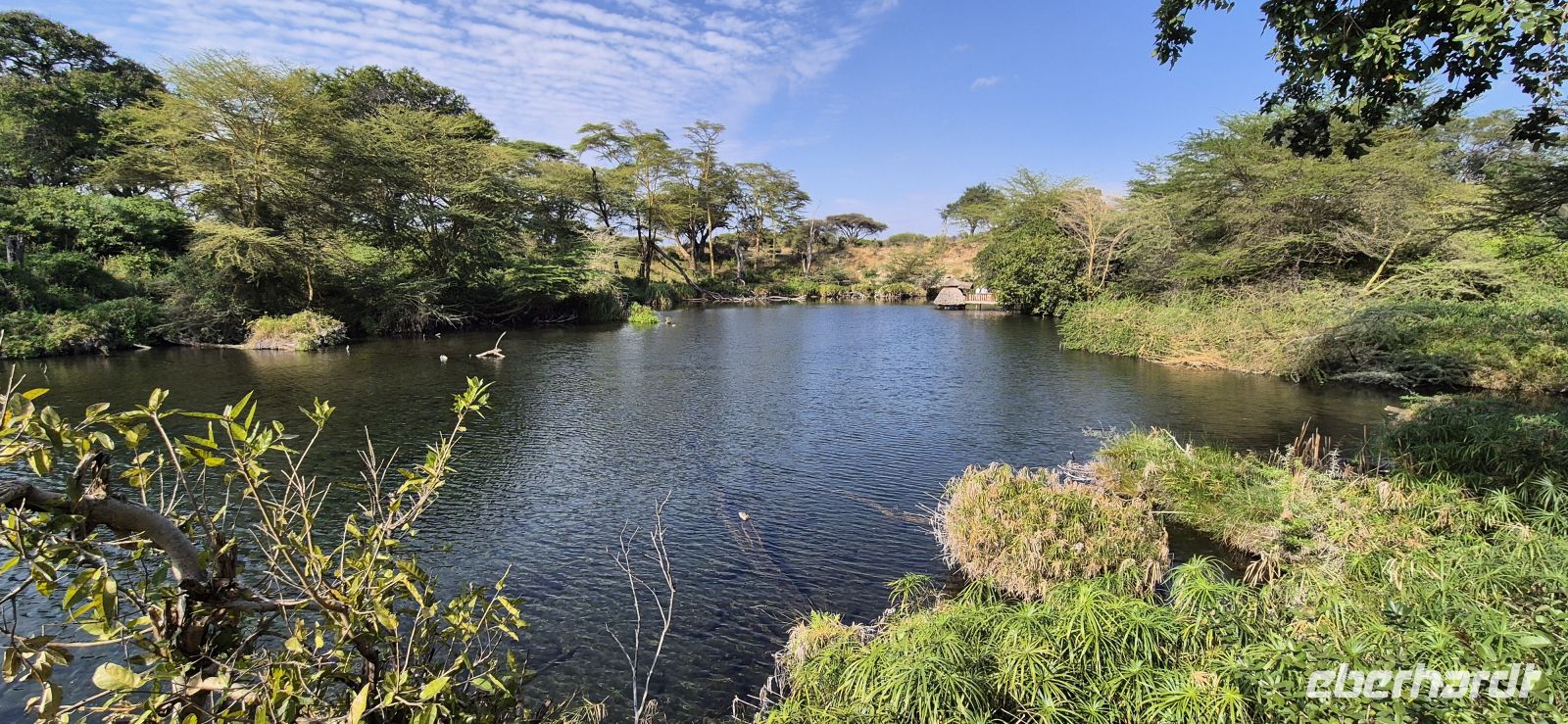 Schon früh am Morgen wird es bei uns geschäftig. Wir treffen uns zu einem letzten Frühstück mit grandioser Aussicht und genießen noch einmal den Blick in die Savanne. Nun heißt es sich hier zu verabschieden und der schönen Lodge Kwaheri sagen. Wir machen uns auf den Weg ins Lumo Community Wildlife Sanctuary. Unser erster Stopp lässt nicht lange auf sich warten, wir erreichen die Mzima Springs, eine der bekanntesten Wasserquellen in Tsavo-West. Ein bewaffneter Ranger begleitet uns auf einem kleinen Spaziergang durch das grüne Paradies. Hier sprudelt kristallklares Quellwasser, das aus dem vulkanischen Chyulu-Gebirge stammt – bis zu 250 Millionen Liter täglich! Nilpferde, Krokodile und allerlei Vögel fühlen sich in diesem feuchten Refugium sichtlich wohl. Wir spazieren über schattige Pfade, bestaunen einen Unterwasser-Beobachtungsbunker – und genießen einfach das satte Grün.