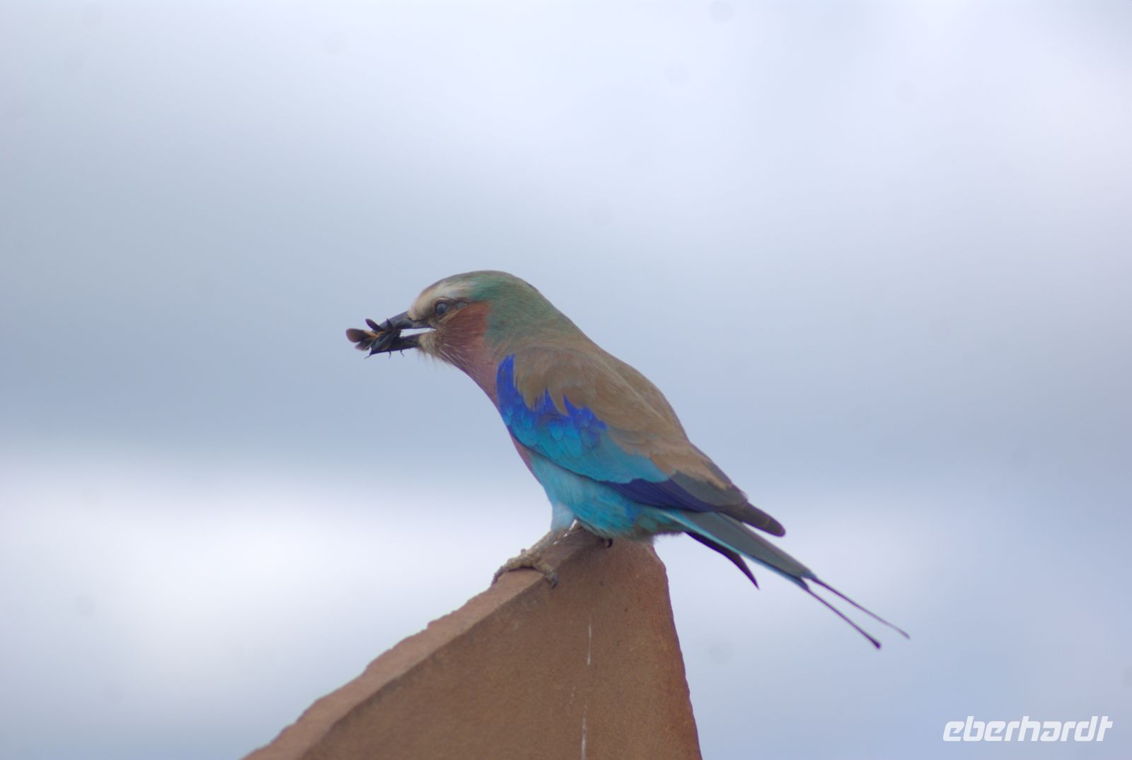 Früh am Morgen, noch bevor die Sonne über die Savanne klettert, treffen wir uns um 6 Uhr in der Lobby unserer Kilaguni Serena Safari Lodge. Ein duftender Kaffee in der Hand lassen wir den Blick auf das beleuchtete Wasserloch schweifen – und werden sofort belohnt. Schon jetzt tummeln sich zahlreiche Tiere am Wasser: Zebras, Giraffen, Paviane und sogar ein paar Elefanten statten uns einen morgendlichen Besuch ab. Die Szenerie ist so faszinierend, dass wir noch ein wenig verweilen und ganz in dieses stille Schauspiel eintauchen. Dann starten wir zu unserer Fahrt in den Tsavo West Nationalpark, einem der ältesten und größten Schutzgebiete Kenias. Mit rund 9.000 Quadratkilometern bietet der Park eine unglaubliche Vielfalt an Landschaften – von Vulkankegeln und Lavafeldern bis hin zu dichten Akazienwäldern und grünen Oasen. Schon bald entdecken wir die ersten Tiere: Eine Herde Gnus zieht gemächlich über die Ebene und nutzt den Weg vor uns. Wenig später begegnen wir einem Kudu mit seinem Jungtier – majestätisch und graziel ziehen beide an uns vorbei. Eine bunte Gabelracke flattert über die Straße, ihre türkisfarbenen Flügel leuchten im Morgenlicht. Auch eine sogenannte Cokes Kuhantilope – typisch für die ostafrikanischen Grasländer – lässt sich blicken und zeigt sich von ihrer besten Seite. Wir genießen die Stille, die nur vom Zwitschern der Vögel durchbrochen wird. Zurück in der Lodge wartet ein spätes, aber reichhaltiges Frühstück auf uns. Danach lassen wir den Tag in gemächlichem Tempo weiterfließen. Von der Terrasse aus beobachten wir, wie sich an den beiden Wasserlöchern ein wahres Kommen und Gehen abspielt. Zebras, Giraffen, Büffel, Paviane und sogar Hyänen erscheinen nach und nach, um ihren Durst zu stillen. Immer wieder trotten Elefanten vorbei – ganze Herden mit Jungtieren, die sich neugierig beschnuppern. Am Nachmittag brechen wir erneut zur Pirschfahrt auf. Diesmal bekommen wir eine besonders flinke Truppe zu Gesicht: Zebramangusten flitzen über die Fahrbahn und posieren beinahe fotogen aufrecht im Busch gegenüber. Wir erspähen Mausvögel, Tokos mit ihren charakteristischen Schnäbeln und die eigenwilligen „Go-away-birds“, deren Name tatsächlich von ihrem klagenden Ruf herrührt. Ein Wiedehopf mit auffälliger Federhaube vollendet das Bild. Als besonderes Highlight entdecken wir zwei Löwen, die tiefenentspannt im Dickicht dösen. Die Szene ist so friedlich wie eindrucksvoll – ein krönender Abschluss unserer Safari.