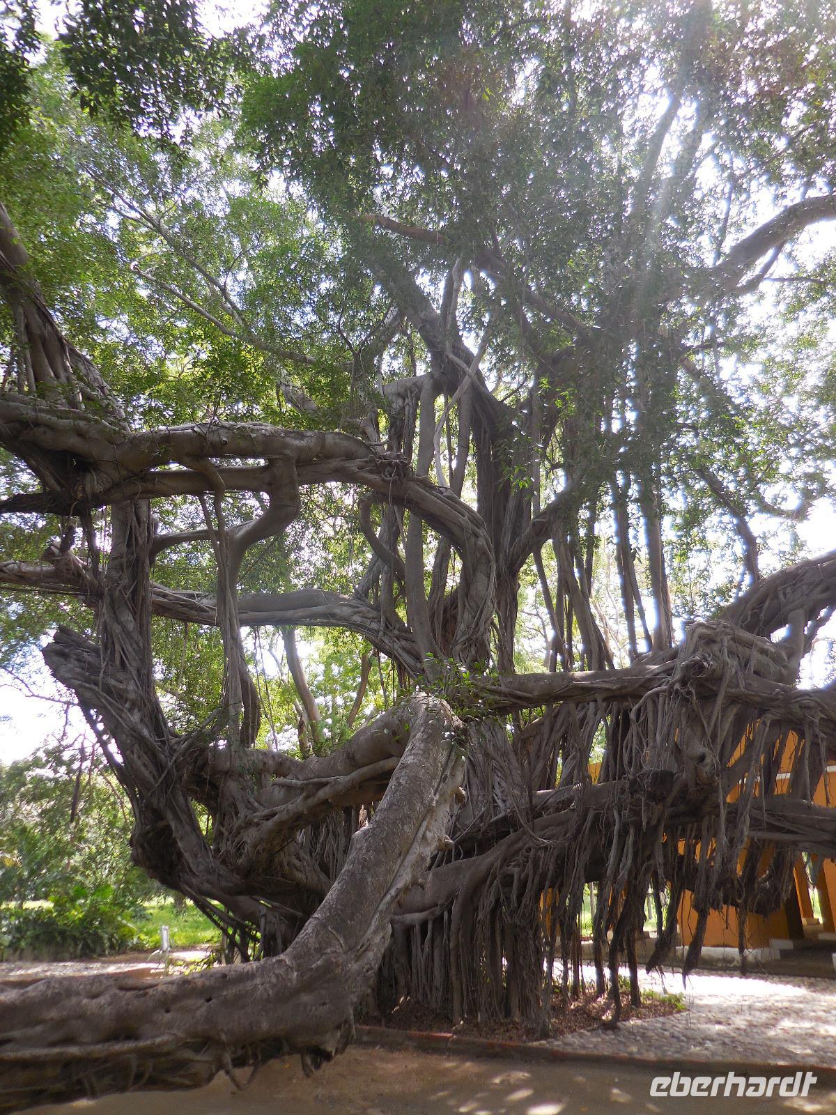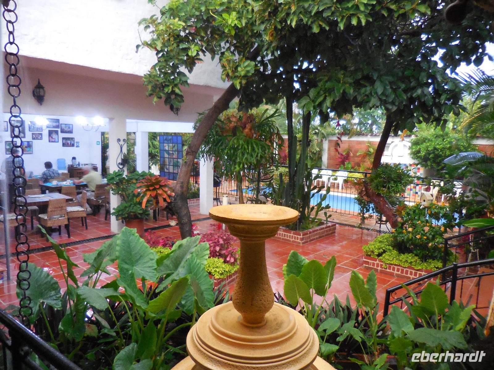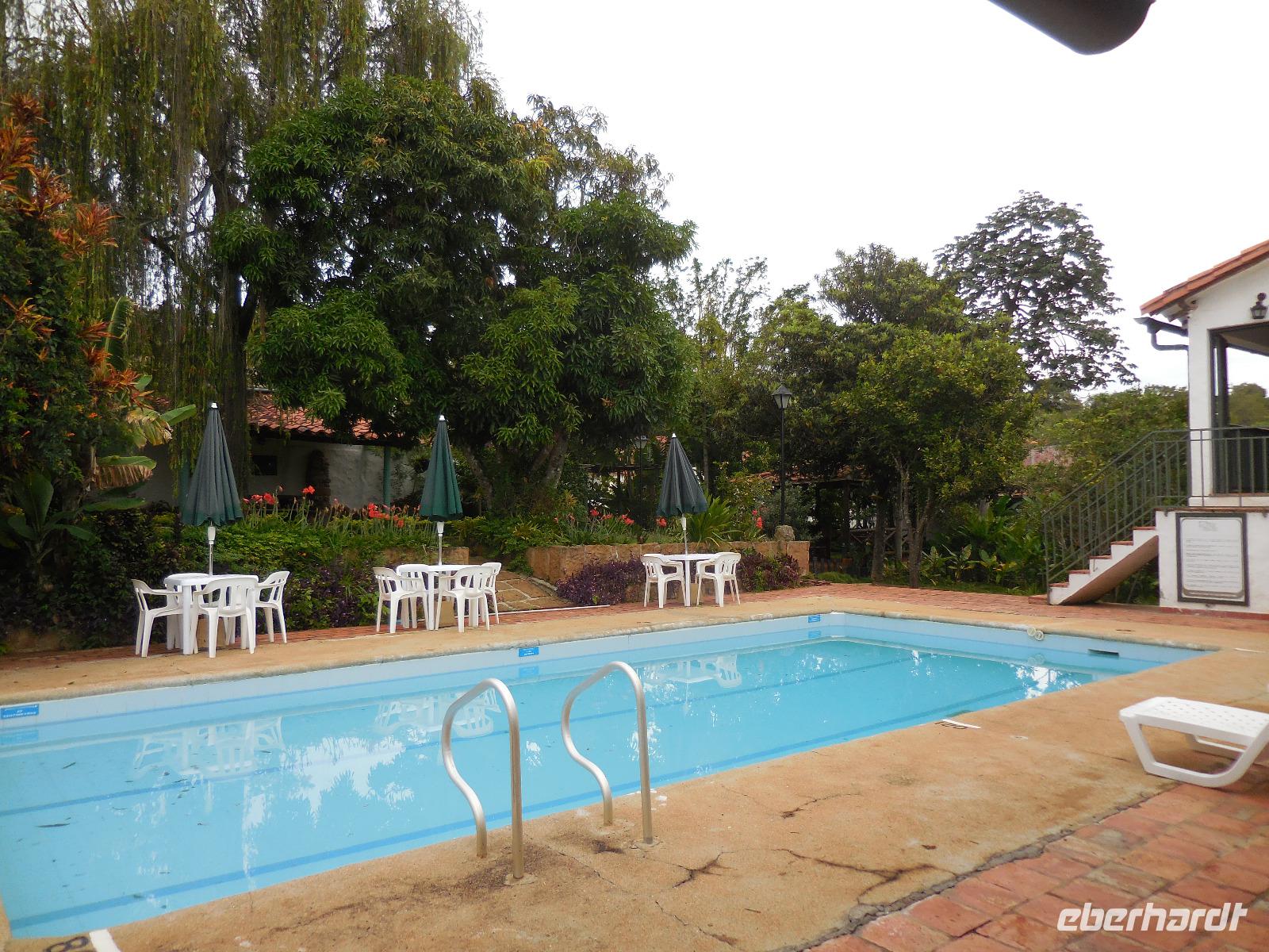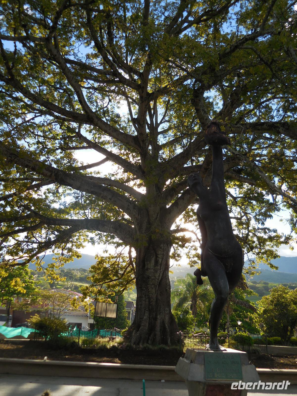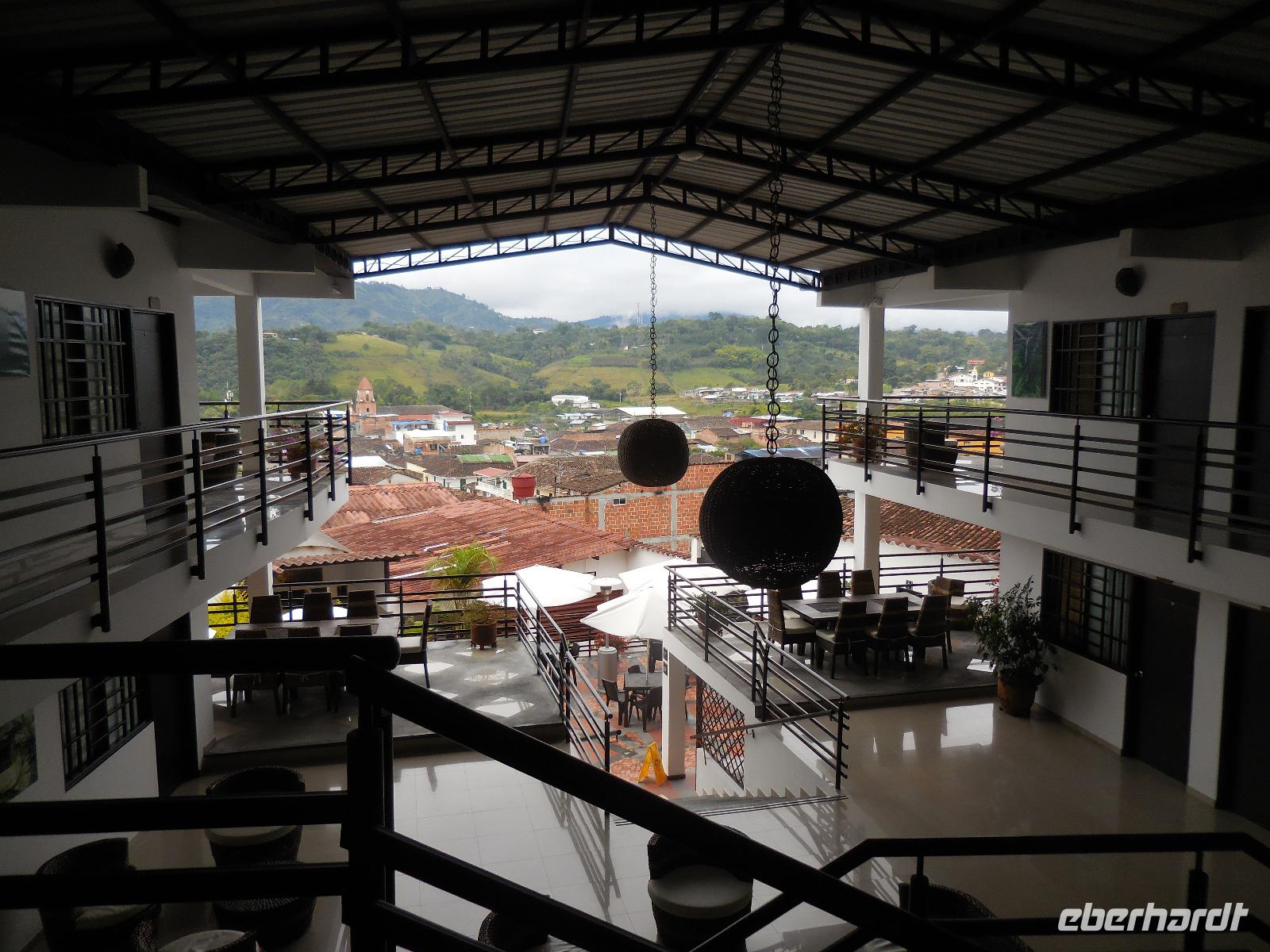 Nun hieß es: weitere 300 Kilometer Fahrt in Richtung Süden nach San Augustin. Damit uns die Fahrt nicht zu lang wurde, hielten wir ab und zu an. So zum Mittagessen, wo wir sehr lecker und für keine 4 € pro Person gut gespeist haben. Ein weiterer Stopp war im Dorf Timana, wo wir die Kirche am Hauptplatz besuchten und den riesengroßen Ceibabaum (deutsch: Kapockbaum) betrachteten und fotografierten. Wir fuhren immer am Magdalenfluss entlang bis wir gegen 18:30 Uhr unser Hotel Las Terrazzas in San Augustin erreichten zu Abend aßen und ins Bett gingen.