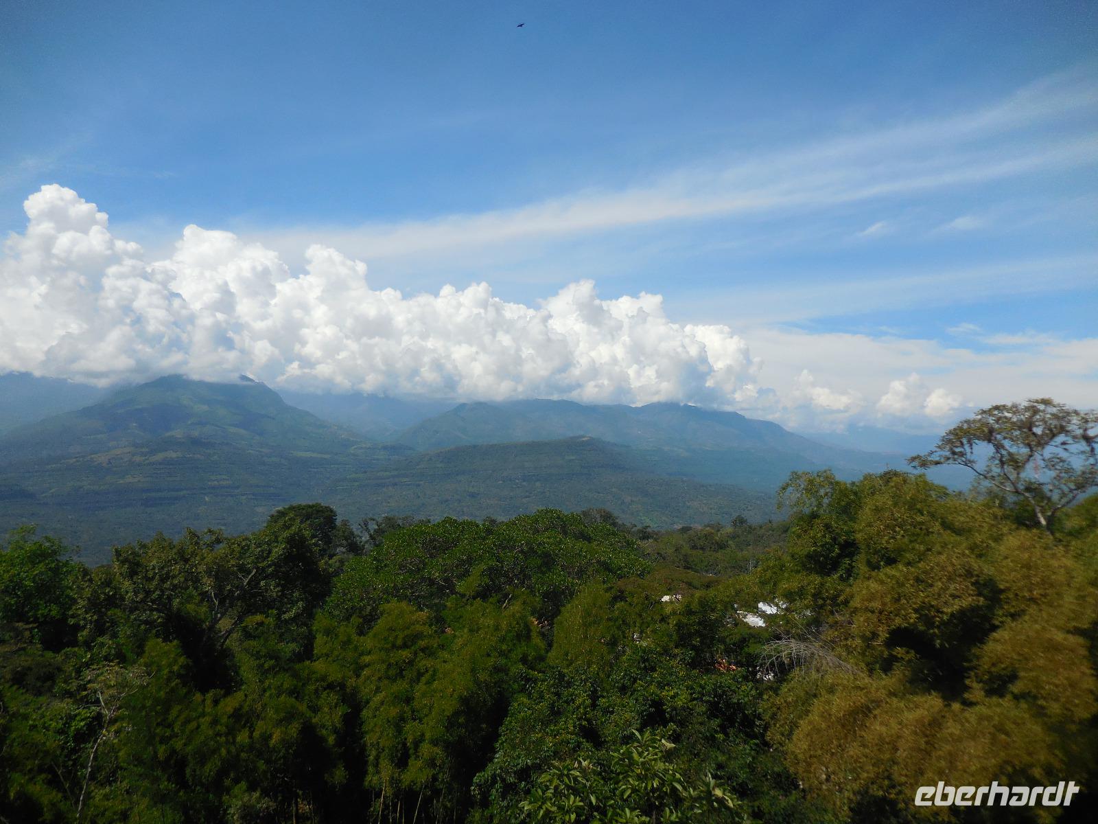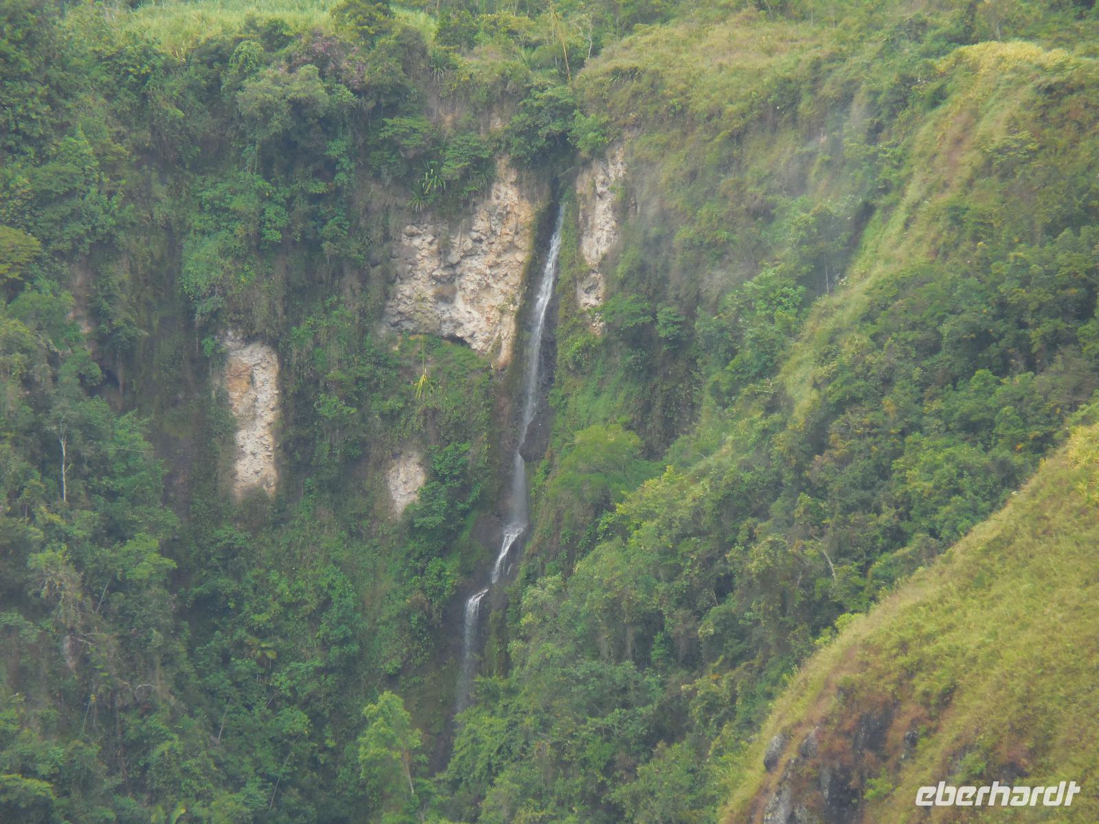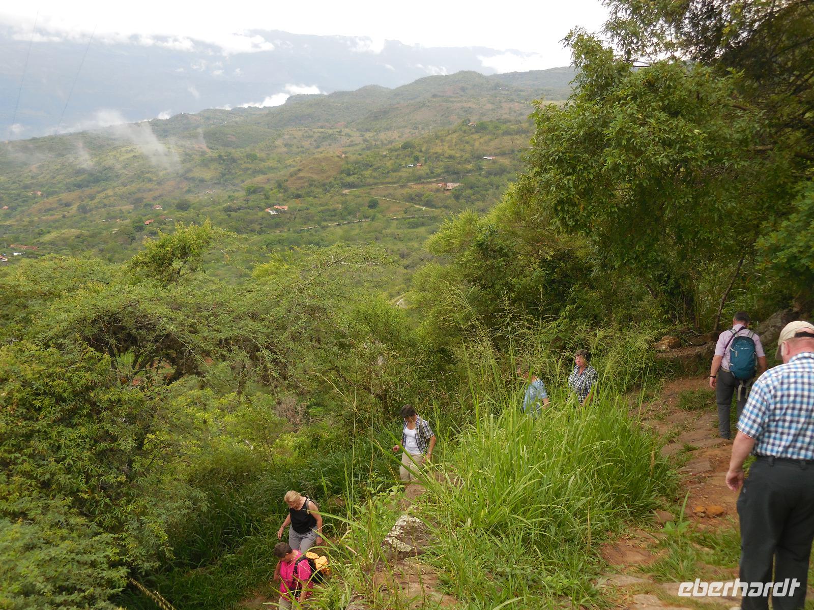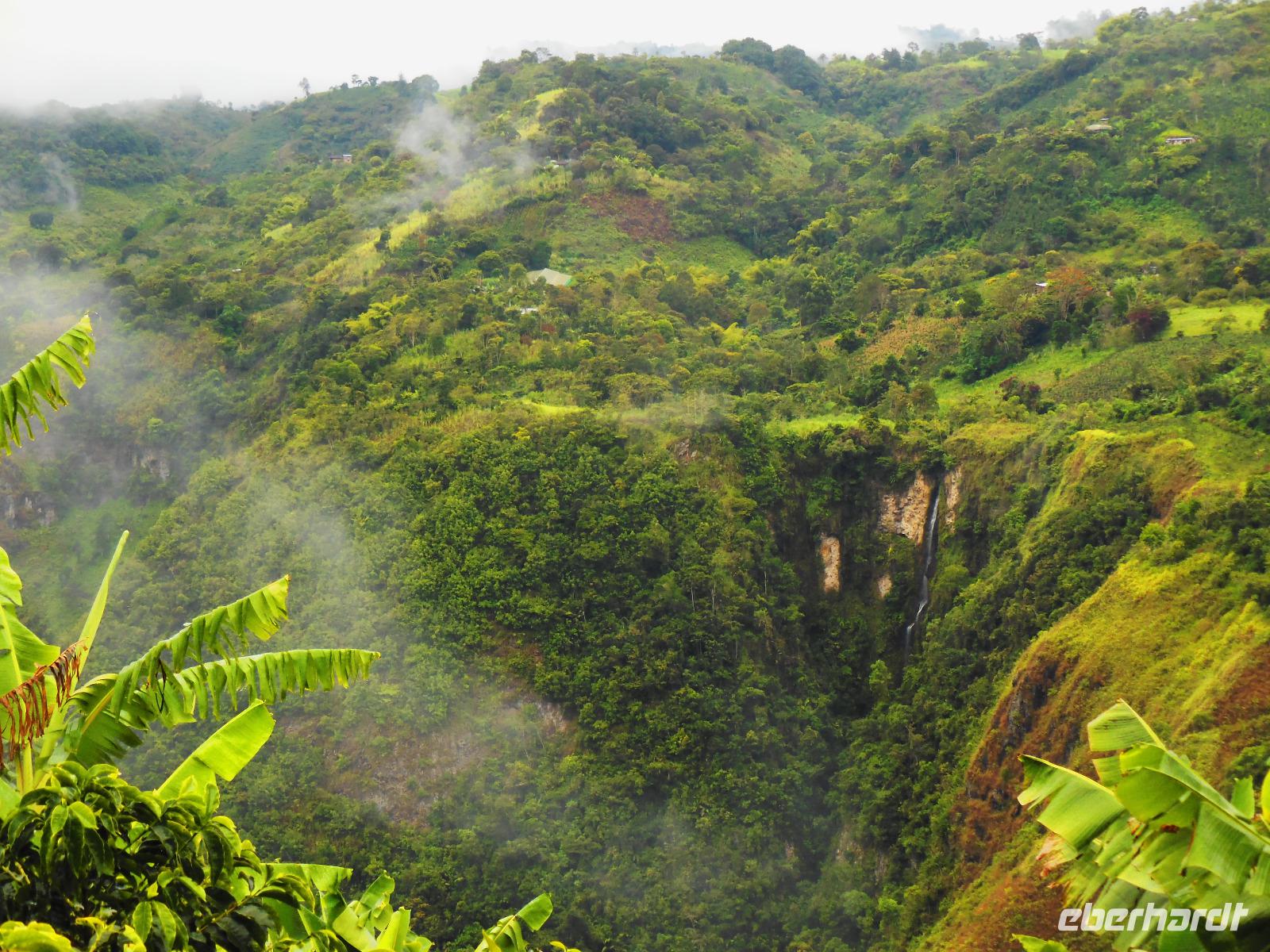 Das heutige Mittagessen nahmen wir erneut gemeinsam mit Kolumbianern an der Straße ein und es schmeckte wieder super. Anschließend kehrten wir kurz zum Hotel zurück, zogen uns um und machten uns erneut auf den Weg zur nächsten Wanderung. Drei mutige Reiseteilnehmer absolvierten den Weg auf dem Pferd. Der Rest ging zu Fuß nach Chakira (nicht zu verwechseln mit der kolumbianischen Sängerin Shakira :-)). Hier bestaunten wir die beeindruckend schhöne Landschaft hoch über der Magdalena-Schlucht. Und da es geregnet hatte, sahen wir auch etliche Wasserfälle. 18 Uhr waren wir zurück im Hotel, machten uns frisch und genossen unser Abendessen bei einem Italiener nicht weit vom Dorf entfernt