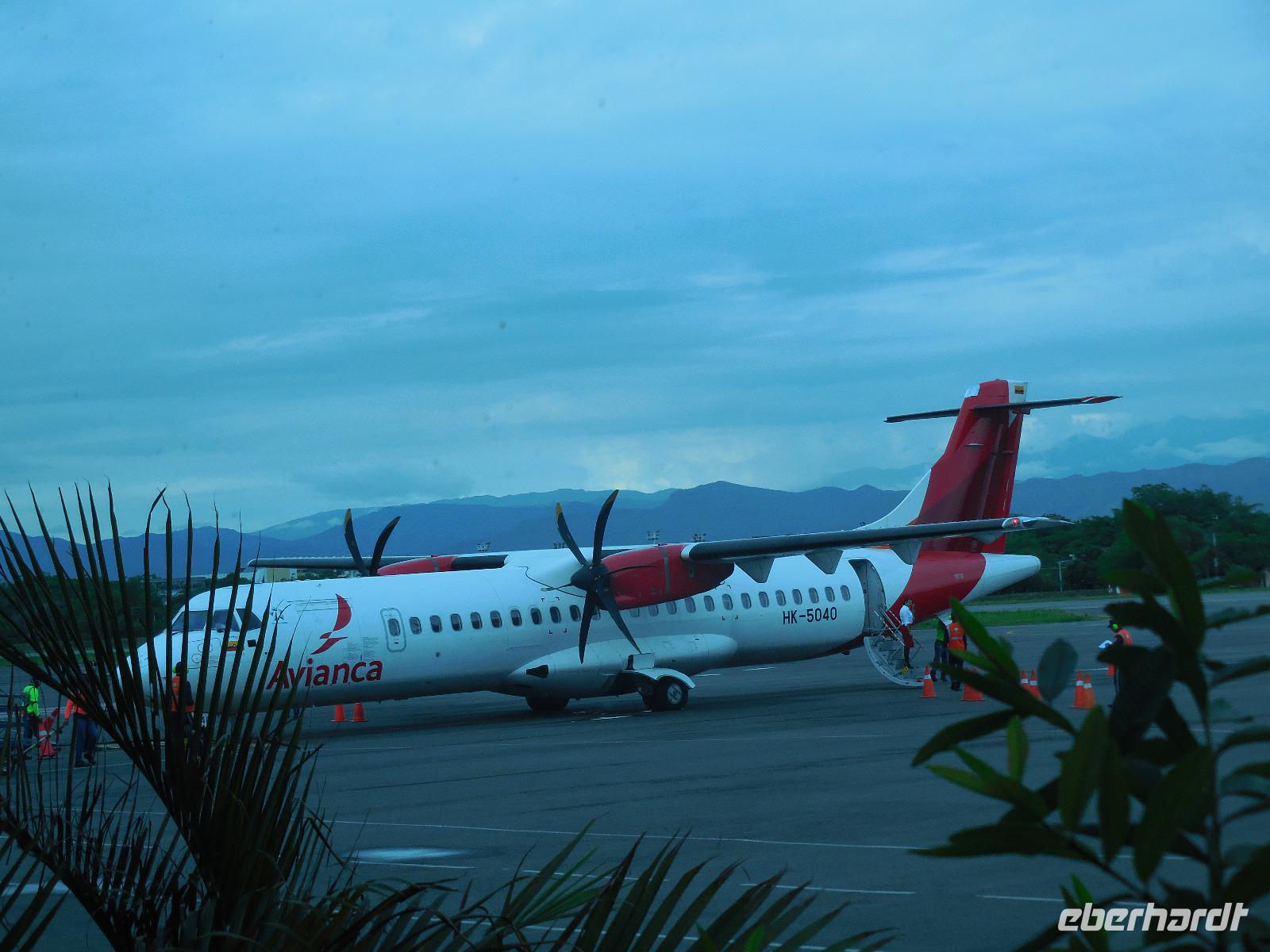 Die Nacht war kurz, denn niemand konnte lange schlafen. Einige lagen ab 3 Uhr wach in ihren Betten und warteten auf das bevorstehende Frühstück. Dieses nahmen wir um 7 Uhr im Innenhof des Hotels im Freien ein und verließen um 8 Uhr mit Luis das Hotel. Er brachte uns zu einem anderen Terminal für Inlandsflüge am großen Flughafen von Bogota und wir checkten ein. Danach wechselten wir alle unser Geld (Euros oder Dollar), damit wir als Millionäre angesehen werden konnten :-) und hoben um 11:15 Uhr ab nach Neiva im Süden von Kolumbien. Nur knappe 45 Minuten dauerte der Flug und hier nahm uns Holger bei 22 Grad, schwüler Luft und Sonne in 400 Höhenmeter in Empfang.