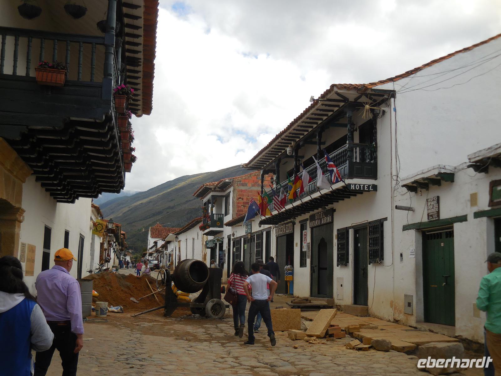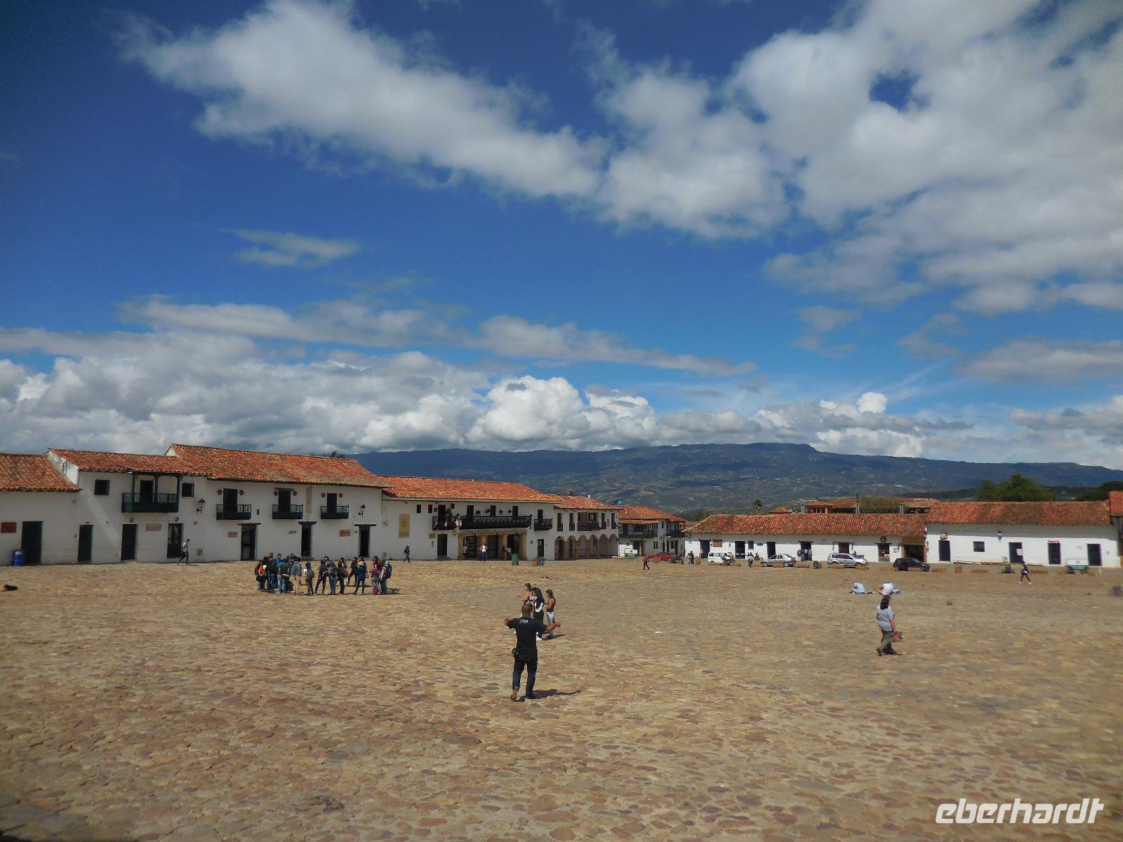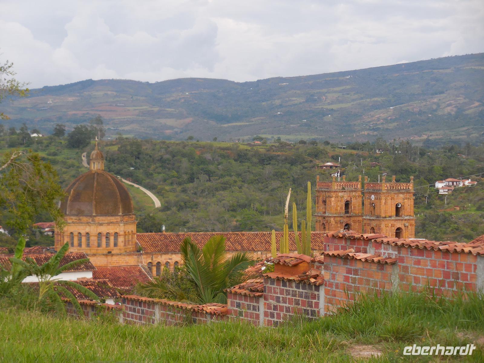 Mit fertig gepackten Koffern verließen wir heute Morgen Villa de Leyva und fuhren weiter in Richtung Norden. Etwa 200 Kilometer mussten heute geschafft werden, aber auch diese zogen sich aufgrund der Strassenverhältnisse sehr in die Länge. Daran gewöhnten wir uns aber in den folgenden Tagen. Unterwegs legten wir zwei kleinere Stopps ein und fuhren durch ein Dorf, welches sich Berlin nennt. 15 Uhr erreichten wir unseren heutigen Zielort Barichara, wo wir die nächsten zwei Tage verbrachten. Der Bus brachte uns soweit er die schmalen Straßen hinauf und den Rest erledigten wir zu Fuß zum Hotel. Die Straßen sind eng und die Bordsteine hoch. Eine Stunde später trafen wir uns zum gemeinsamen Ortsrundgang mit Luis. Wir liefen ganz hinauf zum Ende des Dorfes. Von hier hatten wir einen super Blick über das Dorf mit seinen 7.000 Einwohnern und in die andere Richtung weite Tallandschaft. Nicht umsonst wird es das schönste Dorf Kolumbiens genannt. Davon sind wir nun überzeugt. Der Rundgang nahm zwei Stunden in Anspruch und wir sahen außer den tollen Ausblicken in das Umland auch den Friedhof, die wunderschönen Gassen und den Hauptplatz mit der Kirche.