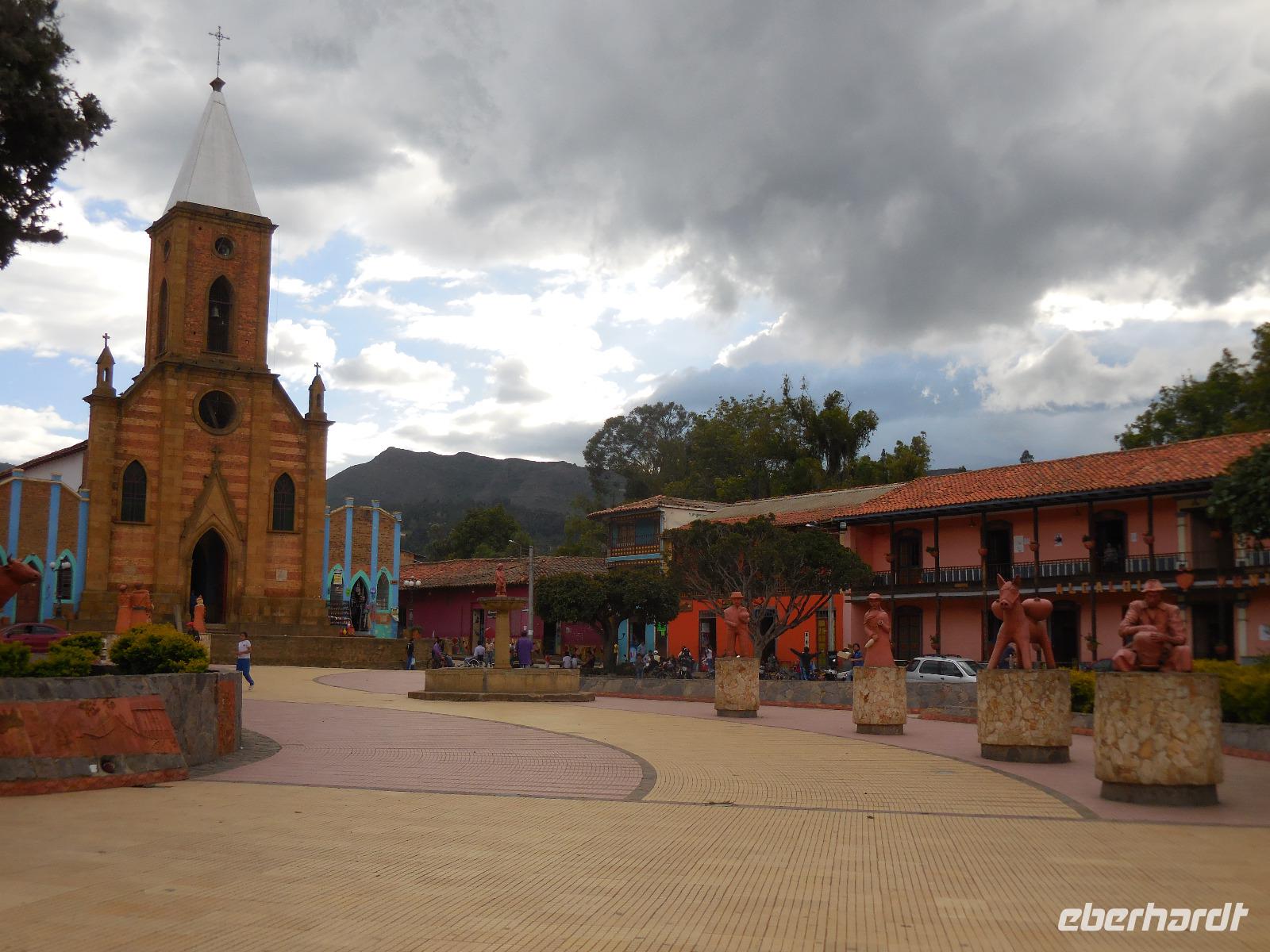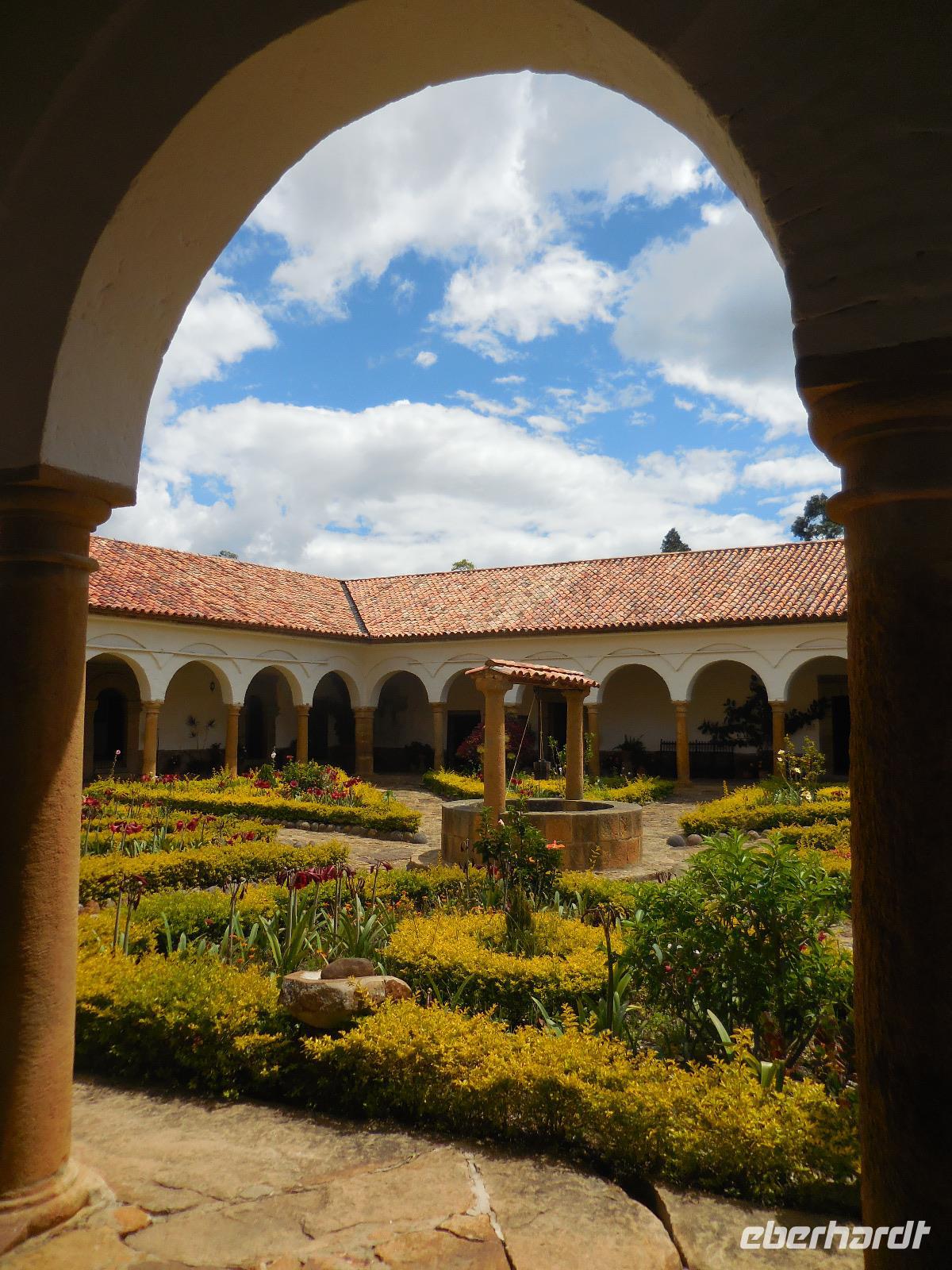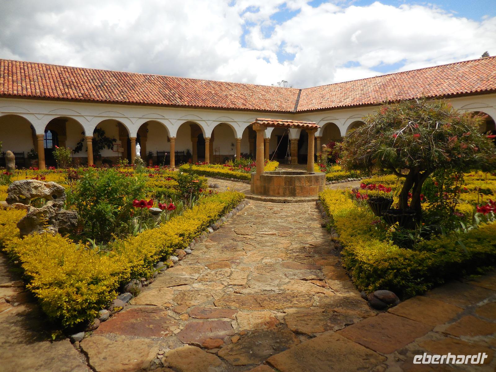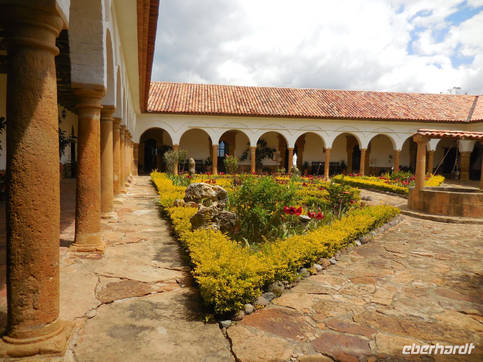 Nach einem ausgiebigen Frühstück im Hotel starteten wir um 9 Uhr zu Fuß vom Hotel zum Stadtrundgang der kleinen 12.000 Einwohner-Metropole. Wir liefen zum riesengroßen Hauptplatz (Plaza Mayor), der zu den größten Plätzen der Welt zählt und ca. 14.000 m² misst. Klaus Kinski hat auf diesem Platz im Jahr 1987 den Film Cobra Verde gedreht und zu früheren Zeiten wurde dieser auch für Hinrichtungen von Freiheitskämpfern benutzt. Der Kirche oberhalb des Platzes statteten wir ebenfalls einen Besuch ab und schlenderten gemütlich durch die vielen kleinen Gassen der Stadt. Gegen 11 Uhr waren wir zurück am Hotel und stiegen hier kurze Zeit später in den Bus ein, der uns zunächst zu einem Haus fuhr, welches ganz aus Terrakotta gebaut wurde. Einzigartig schön! Auf der Weiterfahrt kamen wir am Infernito vorbei, dem Muisca-Observatorium. Hier machten wir nur ein kurzes Foto-Päuschen und fuhren weiter zum Kloster Ecce Homo. Mit Luis gingen wir in die zahlreichen Räume und er erklärte uns alles dazu. Da die ersten schon wieder hungrig wurden, gab es für diejenigen ein süßes Stück Kuchen. Im Anschluss brachte uns der Bus zum Weingut in der Nähe. Hier probierten wir von Rot- und Weißwein auf Kosten von Eberhardt. Wer mochte bestellte sich dazu etwas Käse, Kräcker und Wurst. Die letzte Etappe für heute war das Töpferdorf Raquira. Jedes Geschäft hier verkauft Ton in jeglichen Farben, Größen und Formen.