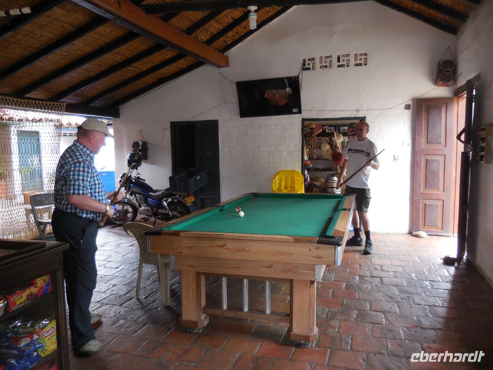 Zu Fuß starteten wir heute um 8:30 Uhr mit Sonnen- und Mückenschutz ausgerüstet direkt von unserer Unterkunft in knapp 1.300 Meter Höhe entlang des Wanderweges Camino Real ins nächste Dorf Guane. Der Wanderweg war etwa 6 Kilometer lang und wir liefen fast ausschließlich 400 Höhenmeter bergab. Dazu kam noch, dass das Wetter es gut mit uns meinte, denn wir brauchten heuter weder Sonnen- noch Regenschutz. Es war bewölkt und angenehm warm. Nur die Mücken waren ein wenig lästig. Der Weg führte uns zunächst nur auf Stufen und unebenem Weg bergab. Aber für jeden war dies gut zu bewerkstelligen. Wir schauten nach links und nach rechts und erspähten allerlei interessante Bäume, Pflanzen, Vögel und Ziegen. Der Weg war zwar insgesamt nur 6 Kilometer lang, aber wir brauchten knappe drei Stunden dafür, weil wir sehr gemütlich gingen und immer wieder stehen blieben um zu schauen und zu fotografieren. In Guane auf ca. 830 Höhenmeter angekommen holten wir uns zunächst eine Erfrischung wie Eis oder Bier. Danach schauten wir uns das Dorfmuseum an, welches sehr viele Fossilienfunde, alte Münzen und Traditionskleidung der indigenen Völker des Ortes führt. Carlos, unser Fahrer holte uns hier mit einem kleineren Bus wieder ab und brachte uns zurück zum Hotel. Hier ruhten wir uns ein wenig aus oder gingen in den Pool schwimmen. 13:30 Uhr starteten wir erneut zu Fuß zum Mittagslokal in der Posada La Nube. Hier wurden wir herzlich von einer Einheimischen empfangen, die etliche Zeit in der Schweiz gelebt hatte und dadurch sehr gutes Deutsch sprach. Sie führt eine Initiative von mehreren Familien, denen wir nach dem Mittagessen einen Besuch abstatteten. Mit einem kleinen Bus brachte man uns ins 13 Kilometer entfernte Nachbardorf. Hier wurden wir von zwei Familien empfangen und wir schauten uns zunächst den einen Hof mit der zugehörigen Kaffeeplantage an und danach die zweite. Wir liefen bergab und bergauf bis wir wieder schnauften. Man erklärte uns, wie man die Kaffeebohnen pflückt, von der Schale trennt, die Guten von den Schlechten unterscheidet und noch etliches mehr. 40-50 kg schafft ein Mann am Tag zu pflücken. Danach werden die Bohnen gewaschen und getrocknet. Zum Rösten allerdings bringt man sie bis nach Bogota und nach dem Rösten bekommt man sie zurück.