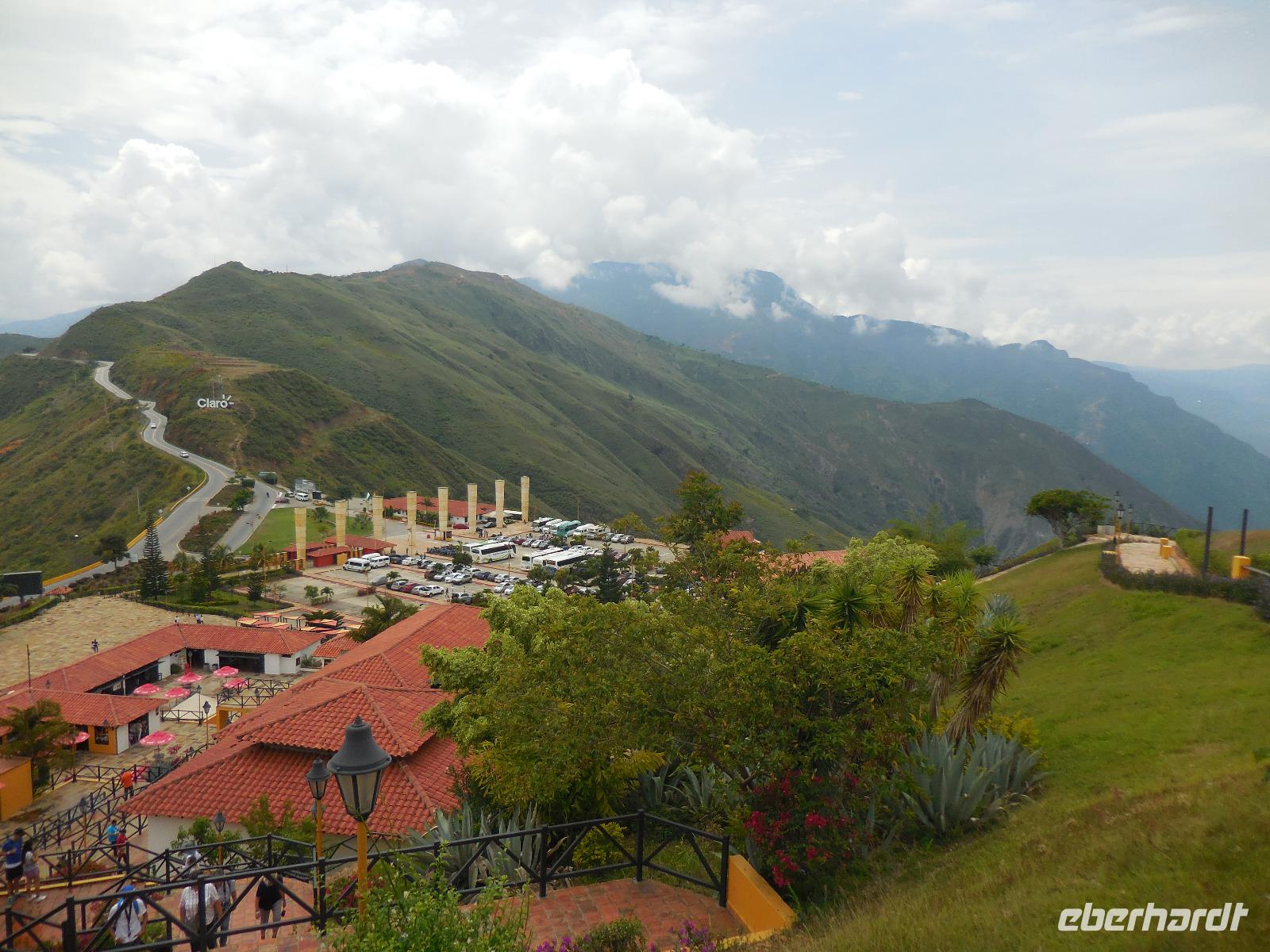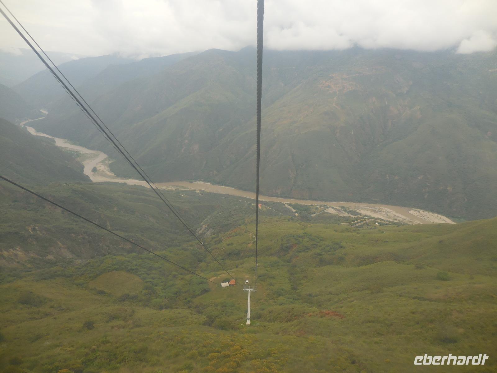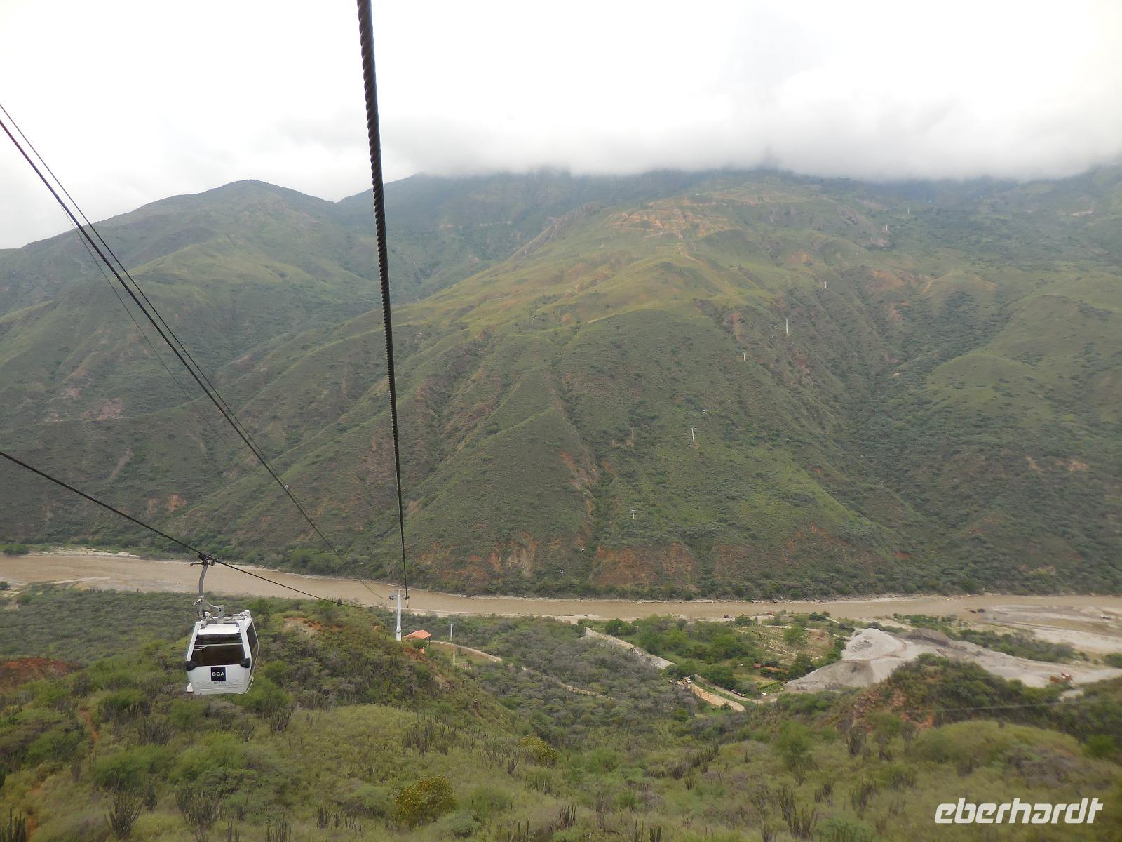 Ein frühes Frühstück war heute erneut an der Reihe, denn wir mussten uns wieder einmal an den Flugplan halten und konnten nicht trödeln. Um 7:30 verließen wir Barichara und Carlos brachte uns zur Chicamocha-Schlucht wo der gleichnamige Fluss fliesst und dann in den Rio Umpala mündet. Nach Aratoca beginnt der Chicamocha-Nationalpark und wir erreichten wir eine Art Vergnügungspark mit einer Seilbahn. Die 1. Station, wo wir die Seilbahn bestiegen, liegt auf einer Höhe von 1.100 Meter und geht hinab in die Schlucht auf 600 Meter. Dann überquert sie unten den Fluss und führt auf der anderen Seite der Schlucht wieder bis 1.600 Meter hinauf. Leider war das Wetter nicht so optimal, aber schon die Fahrt allein war spektakulär und dauerte pro Strecke etwa 20 Minuten. Als wir wieder zurück waren, konnten wir noch schnell auf die Aussichtsplattform hoch laufen (damit wir nicht aus der Übung kamen mit den ganzen Treppen :) ) oder man entschied sich lieber für einen Teller mit Suppe oder Fleisch.