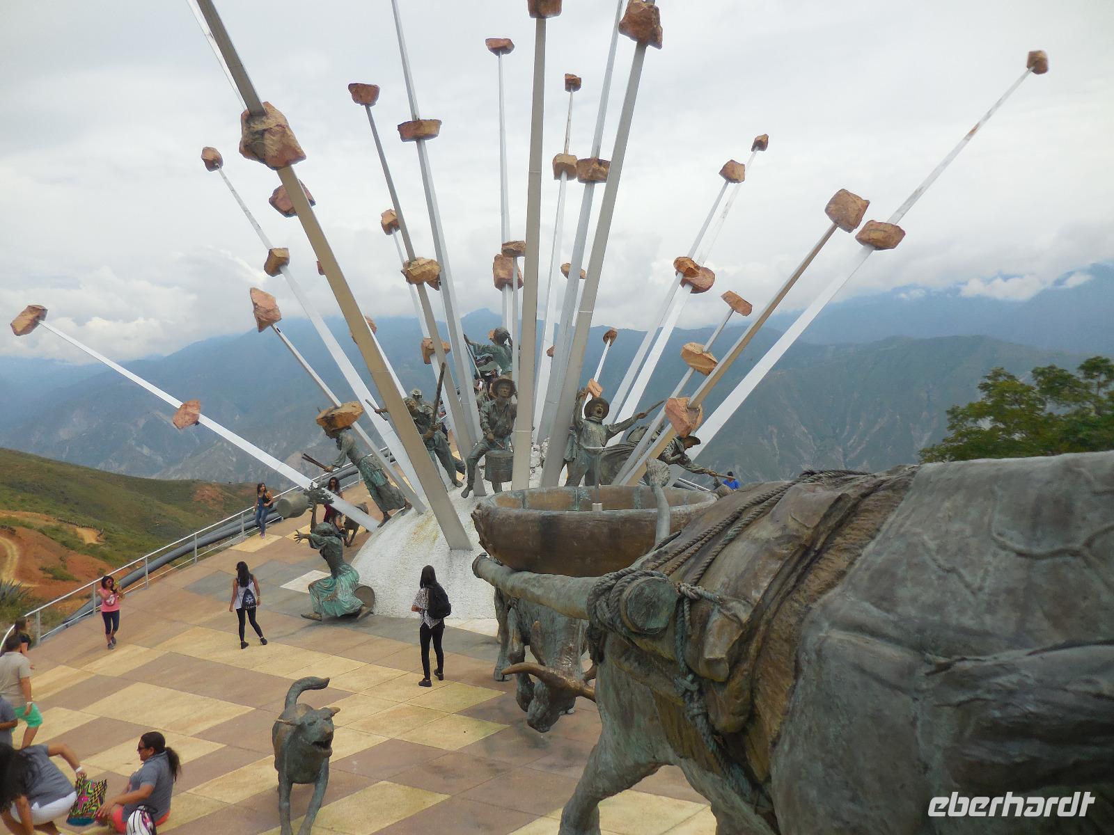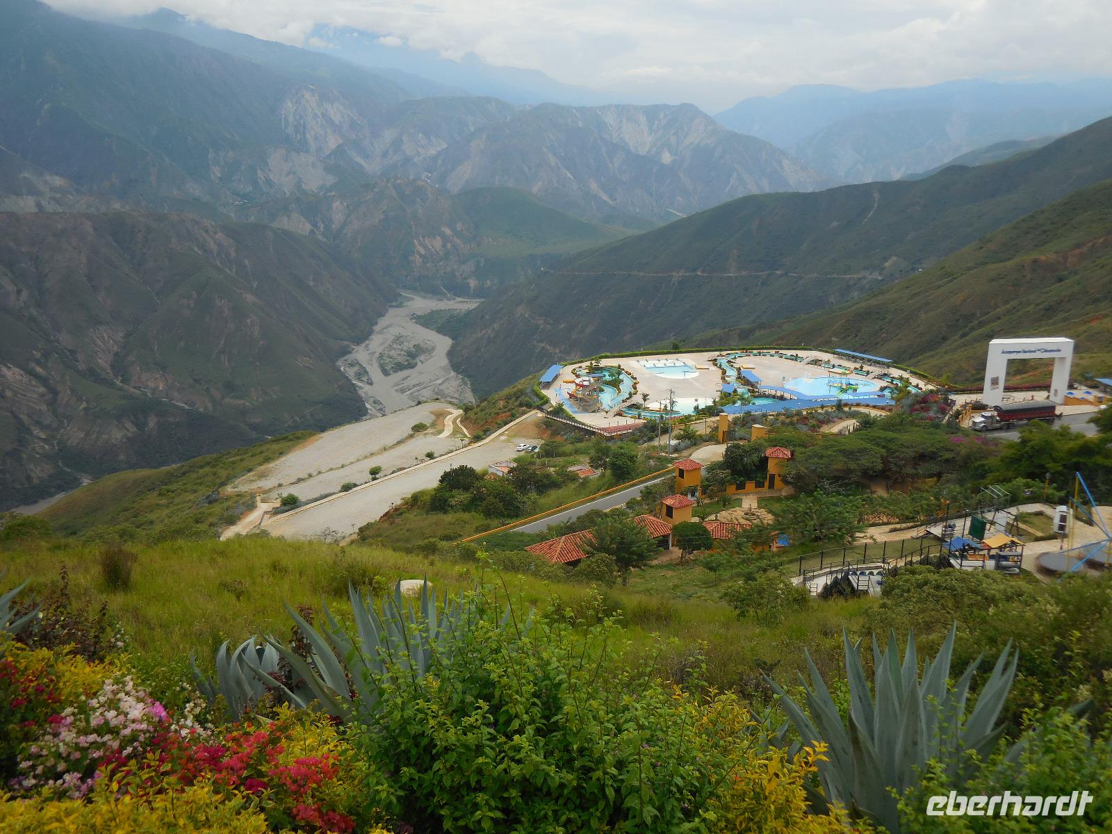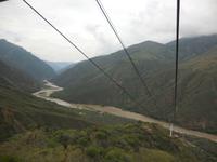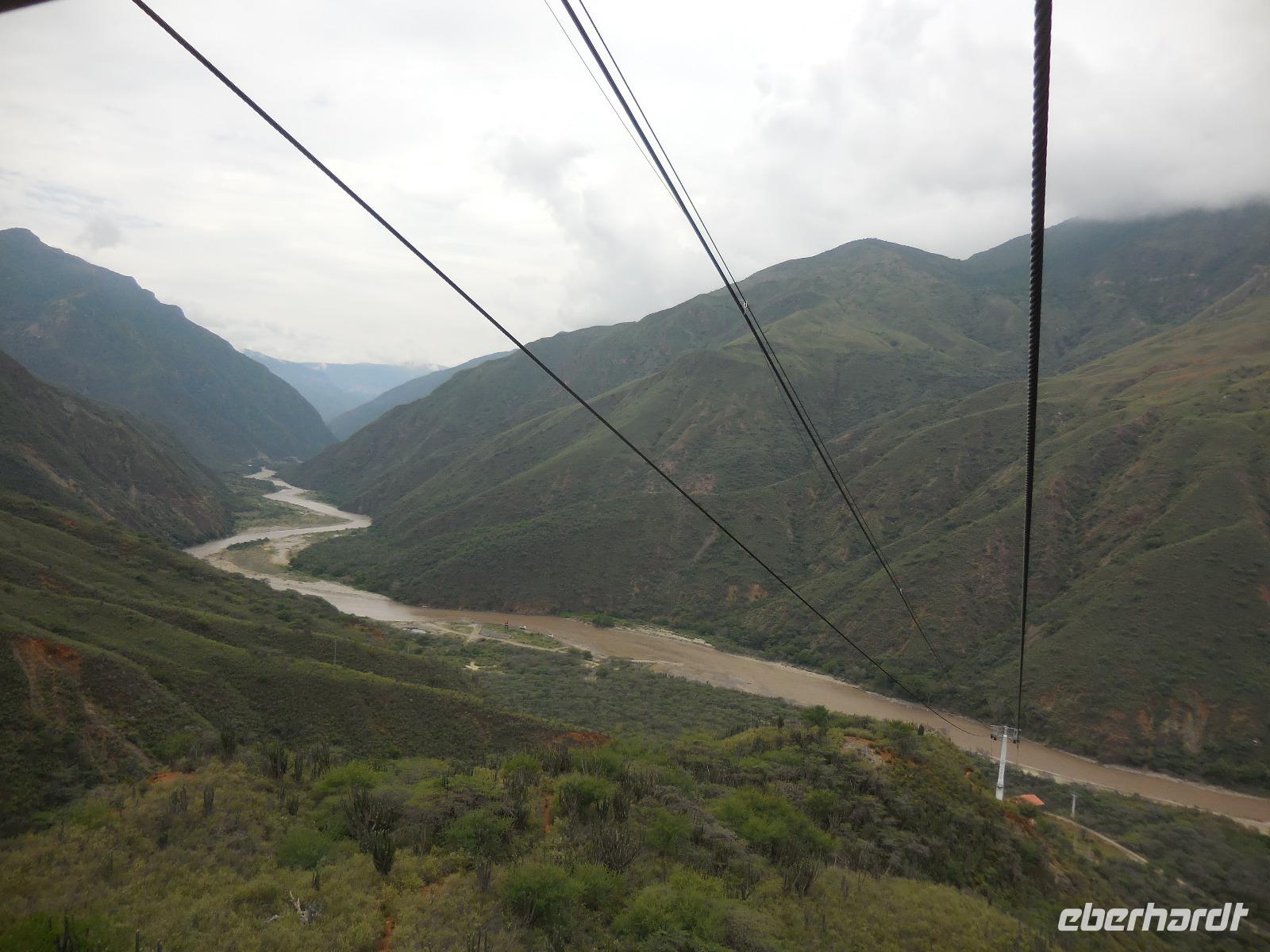 Ein frühes Frühstück war heute erneut an der Reihe, denn wir mussten uns wieder einmal an den Flugplan halten und konnten nicht trödeln. Um 7:30 verließen wir Barichara und Carlos brachte uns zur Chicamocha-Schlucht wo der gleichnamige Fluss fliesst und dann in den Rio Umpala mündet. Nach Aratoca beginnt der Chicamocha-Nationalpark und wir erreichten wir eine Art Vergnügungspark mit einer Seilbahn. Die 1. Station, wo wir die Seilbahn bestiegen, liegt auf einer Höhe von 1.100 Meter und geht hinab in die Schlucht auf 600 Meter. Dann überquert sie unten den Fluss und führt auf der anderen Seite der Schlucht wieder bis 1.600 Meter hinauf. Leider war das Wetter nicht so optimal, aber schon die Fahrt allein war spektakulär und dauerte pro Strecke etwa 20 Minuten. Als wir wieder zurück waren, konnten wir noch schnell auf die Aussichtsplattform hoch laufen (damit wir nicht aus der Übung kamen mit den ganzen Treppen :) ) oder man entschied sich lieber für einen Teller mit Suppe oder Fleisch.
