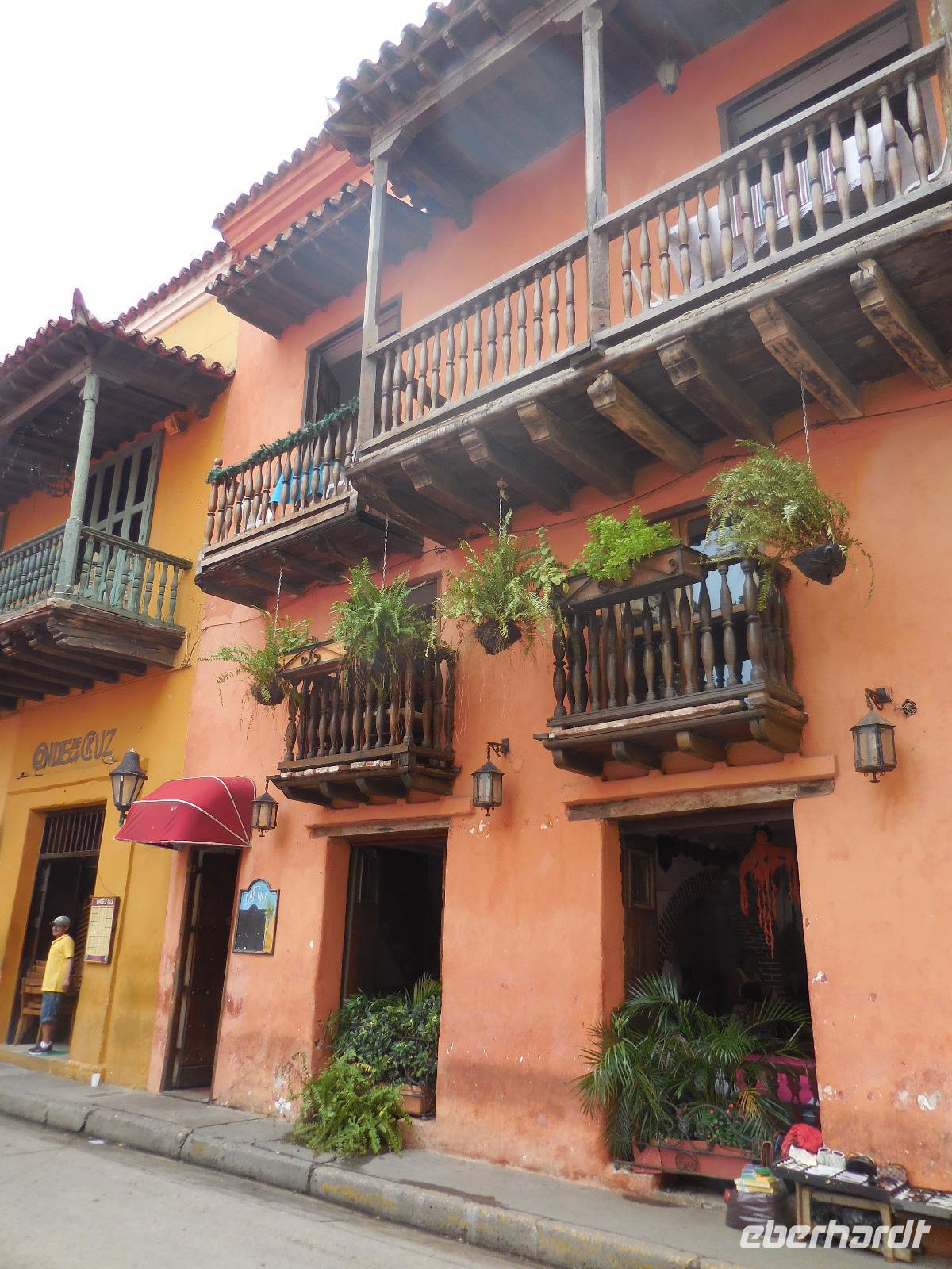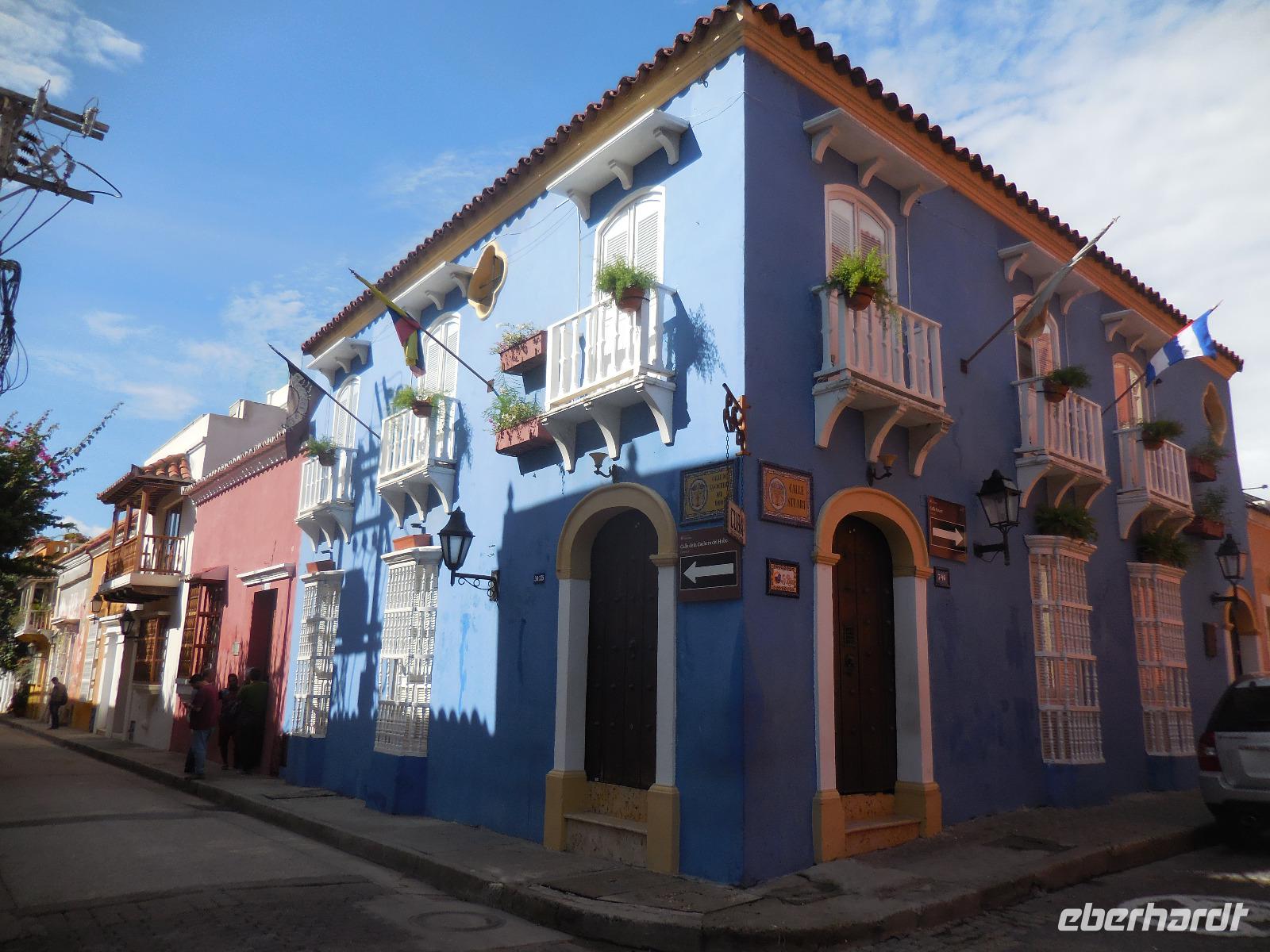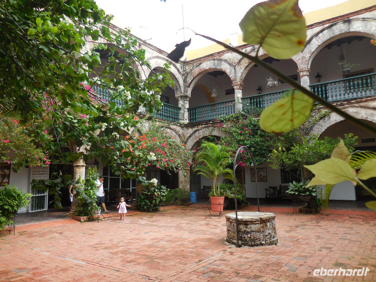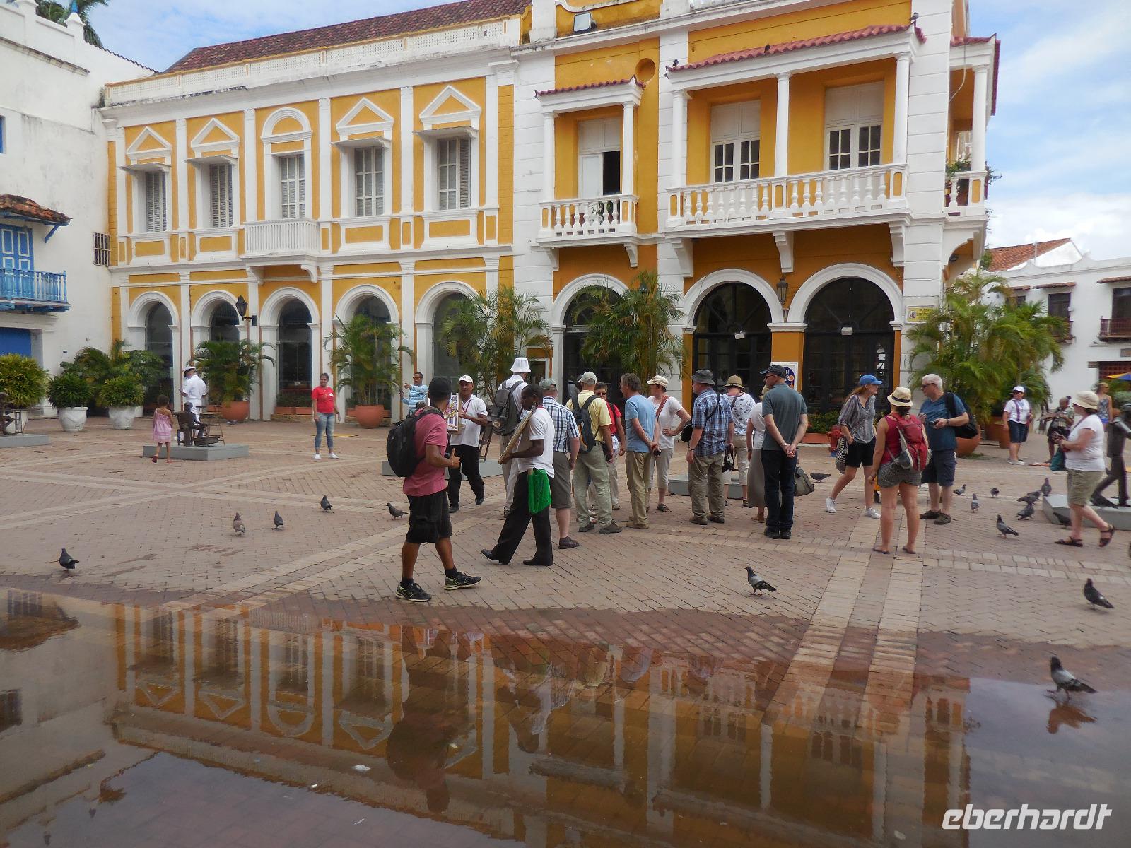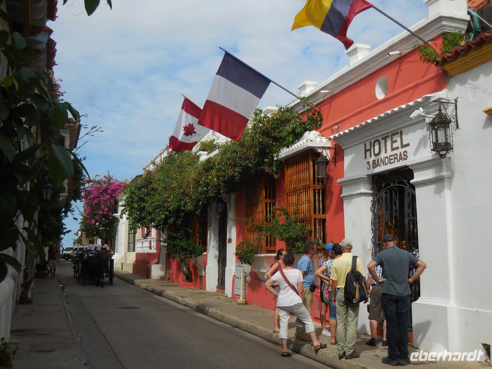 Der Morgen begann mit einem Geburtstagsständchen für eine unserer Mitreisenden vor dem Frühstück. Anschließend brachte man unsere Koffer hinauf zur Straße. Von Palomino aus fuhren wir mit Fahrer Saul zurück in westliche Richtung nach Santa Marta, wo wir zwei Tage zuvor mit dem Flieger angekommen sind. Hier besichtigten wir zunächst die Finca, in der Simon Bolivar 1830 elf Tage lang gelebt und dann verstorben ist. Der lokale Guide Daniela führte uns durch das Areal und erklärte uns alles. Sie ist Schülerin in Santa Marta und bessert mit den Führungen für Touristen ihr Taschengeld auf. Raffaela übersetzte für uns. In der Stadt Santa Marta schauten wir anschließend an der Kathedrale vorbei, die mit der Grundsteinlegung die älteste des Landes ist und die Überreste des Stadtgründers beherbergen. In der Altstadt schauten wir uns das Zollamt, das Denkmal des Stadtgründers Rodrigo de Bastidas und die Uferpromenade an. Im Vorort von Santa Marta, Rodadero, aßen wir in einem Strandrestaurant zu Mittag und hatten dann noch knapp 200 km Fahrtweg vor uns bis Cartagena. Dazwischen liegt Barranquilla, die viertgrößte Stadt von Kolumbien mit 1,5 Mio. Einwohnern. Hier mündet der Rio Magdalena ins Meer und hier wird der zweitgrößte Karneval der Welt gefeiert. Kurz vor 19 Uhr erreichten wir unser schönes Hotel direkt in der Altstadt von Cartagena. Das heutige Abendessen nahmen wir in einem gemütlichen Restaurant nicht weit entfernt ein. Zum Tagesabschluss lud uns das Geburtstagskind auf eine Runde Wein und Chips im gemütlichen Hotel am späten Abend ein und so konnten alle gut schlafen :-)