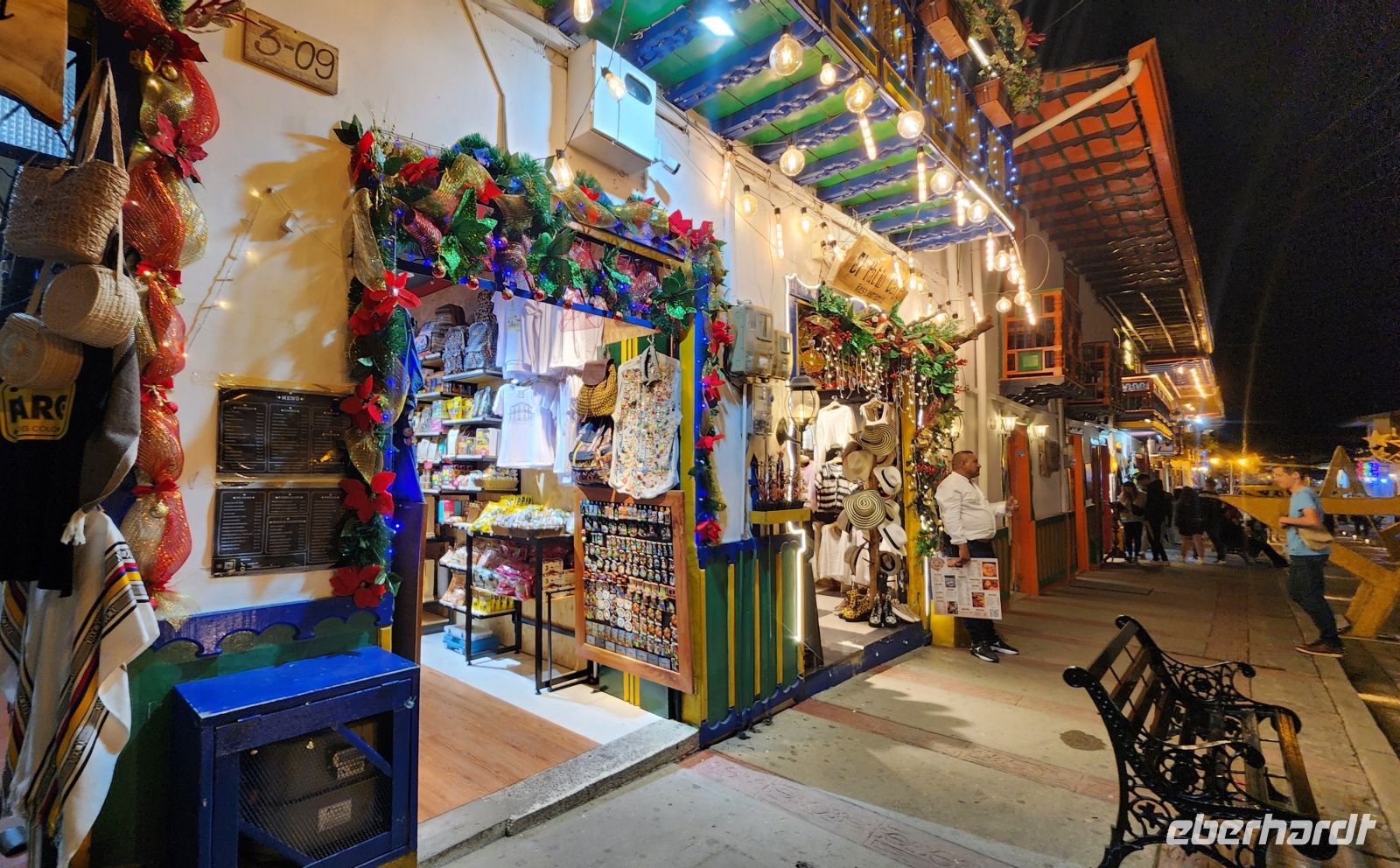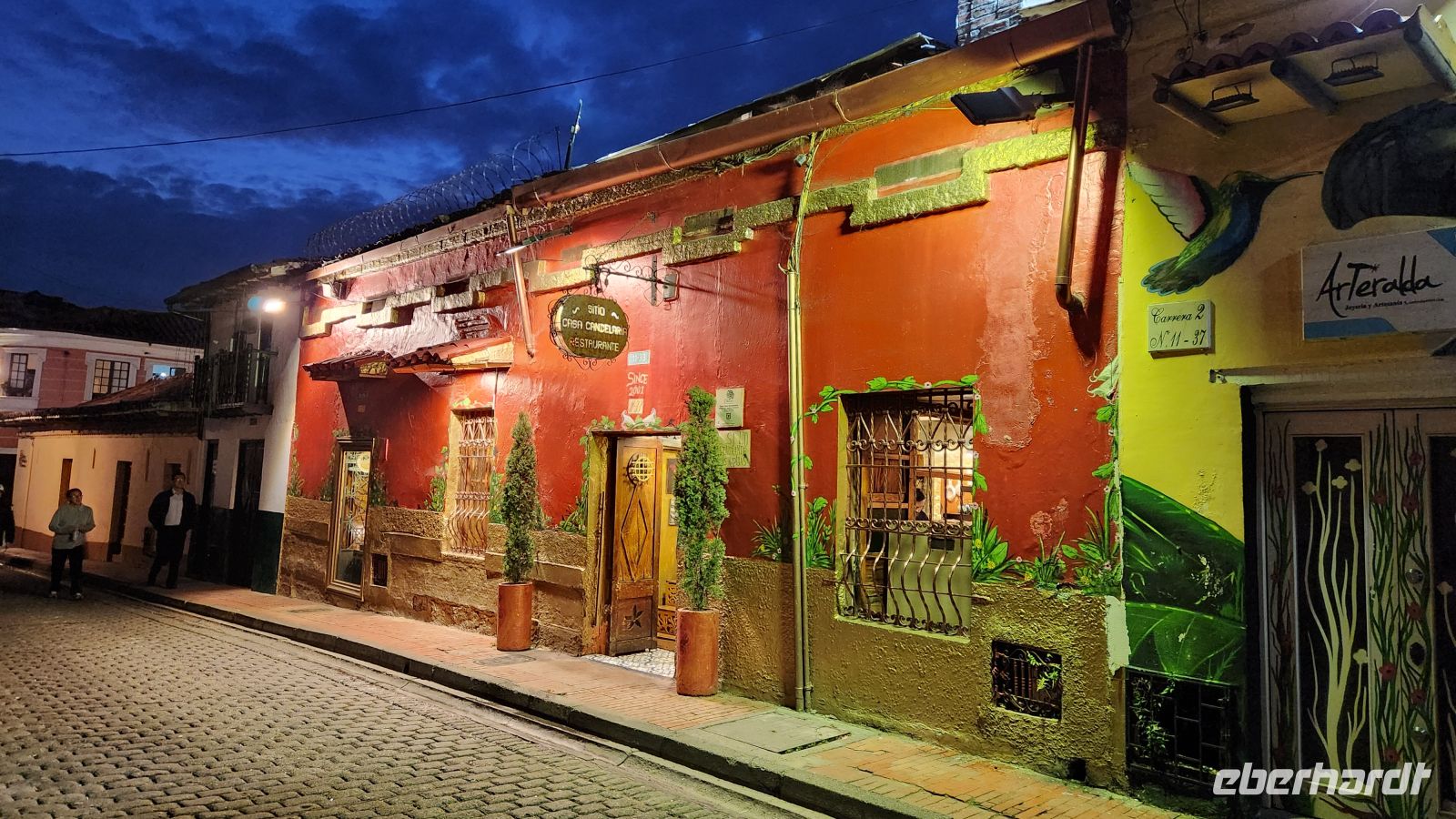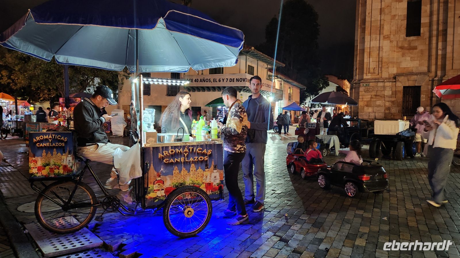 Zuerst sitzen wir in der Abendsonne in einem Straßenlokal und trinken einen Canelazo – ein traditionelles, warmes Getränk aus Agua de Panela (gekochter Zuckerrohrsirup), Zimt und Aguardiente. Danach bummeln wir durch kleine Läden und besuchen später noch ein Lokal mit Livemusik.