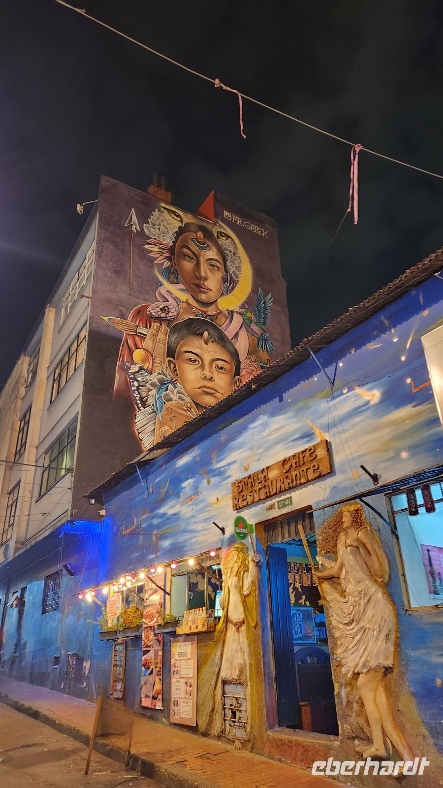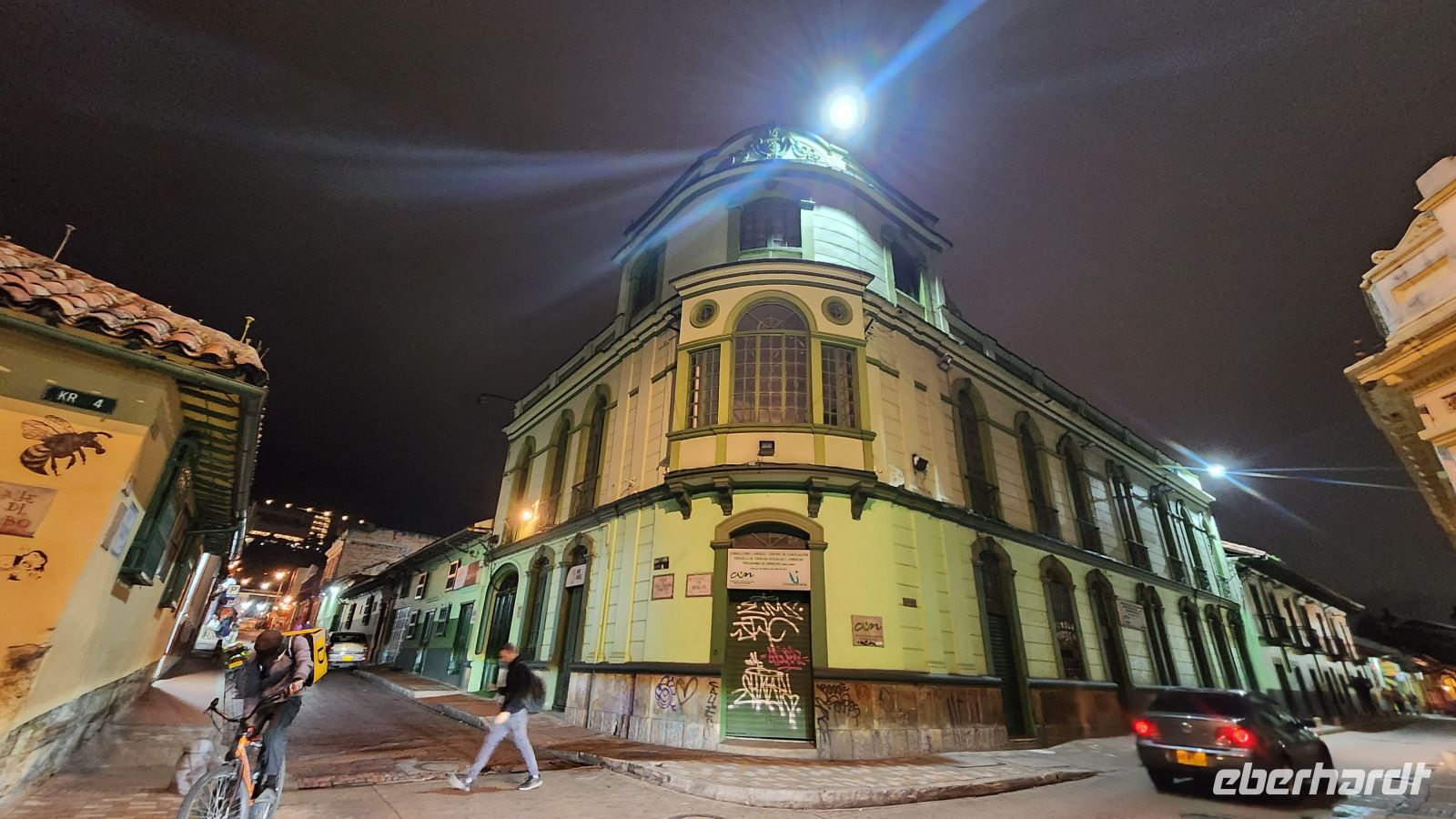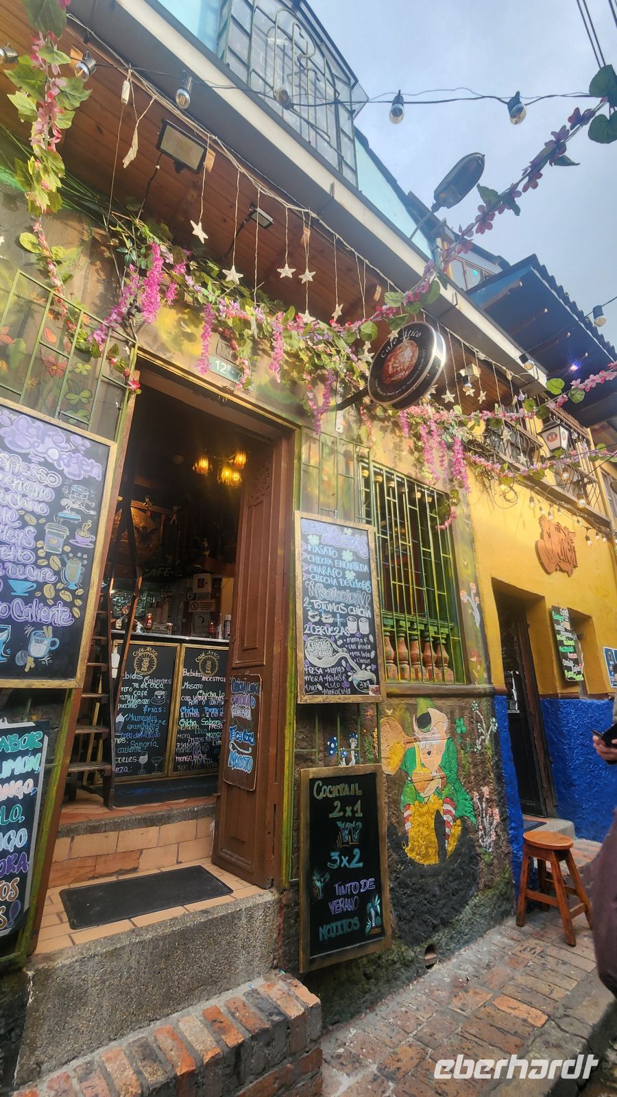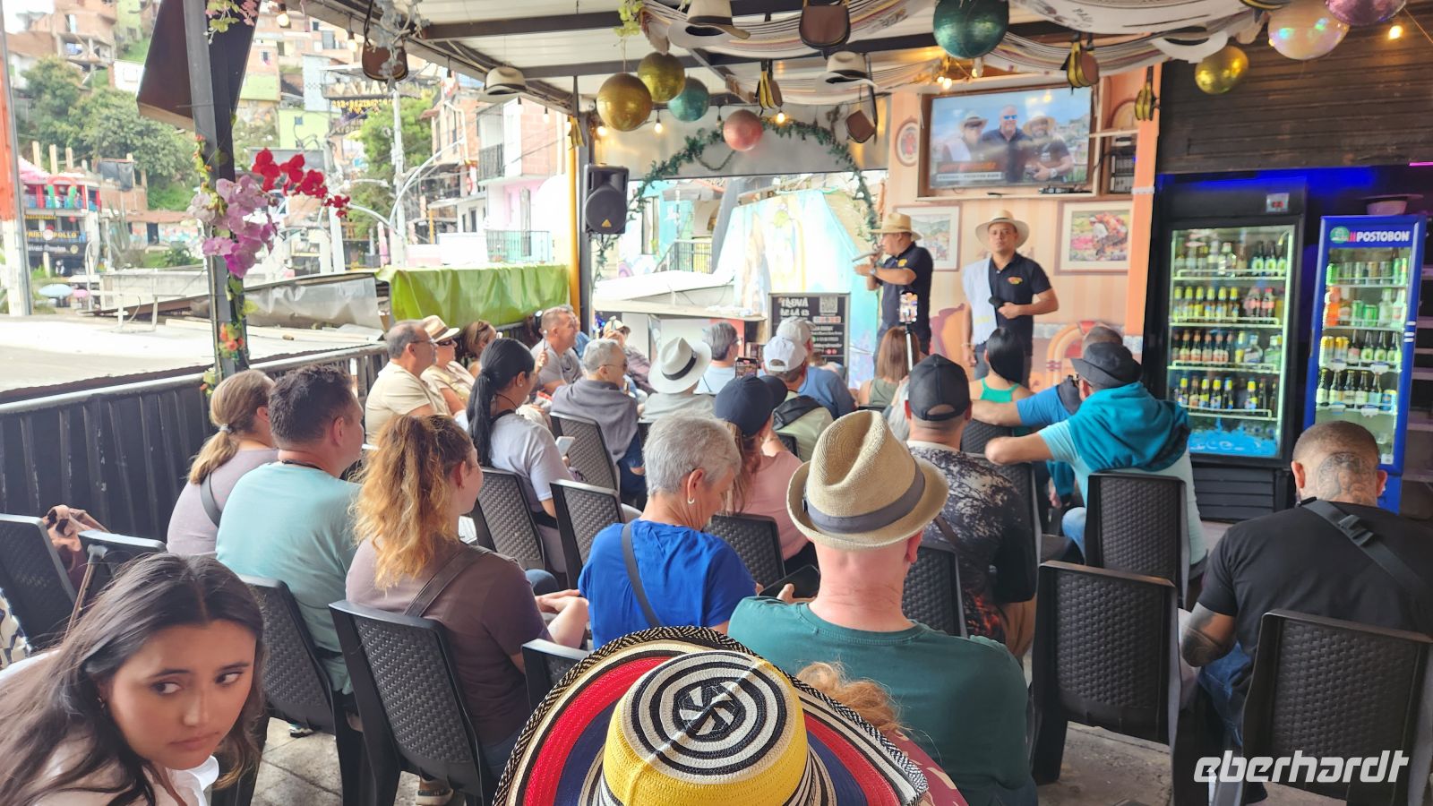 Zuerst sitzen wir in der Abendsonne in einem Straßenlokal und trinken einen Canelazo – ein traditionelles, warmes Getränk aus Agua de Panela (gekochter Zuckerrohrsirup), Zimt und Aguardiente. Danach bummeln wir durch kleine Läden und besuchen später noch ein Lokal mit Livemusik.