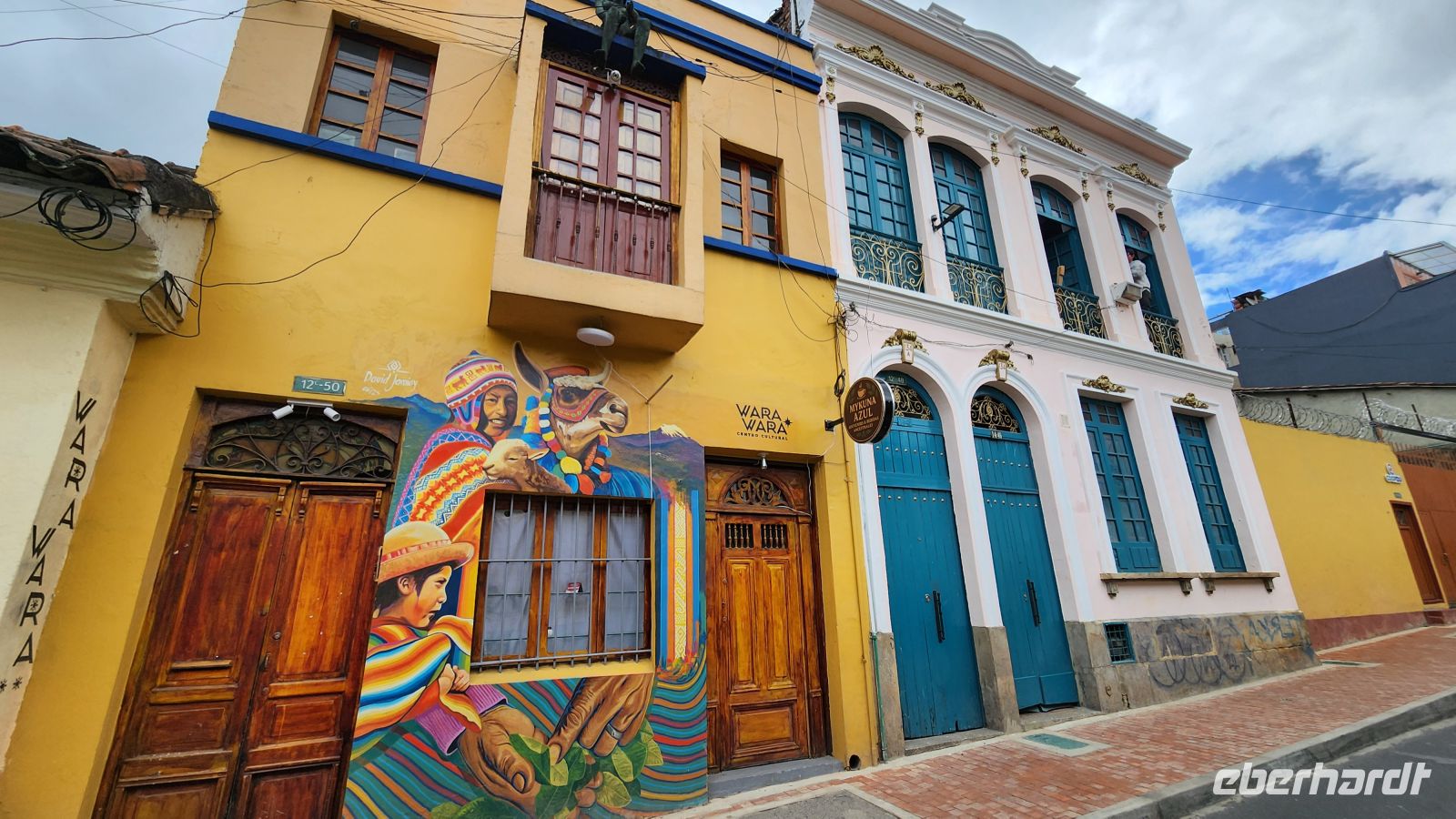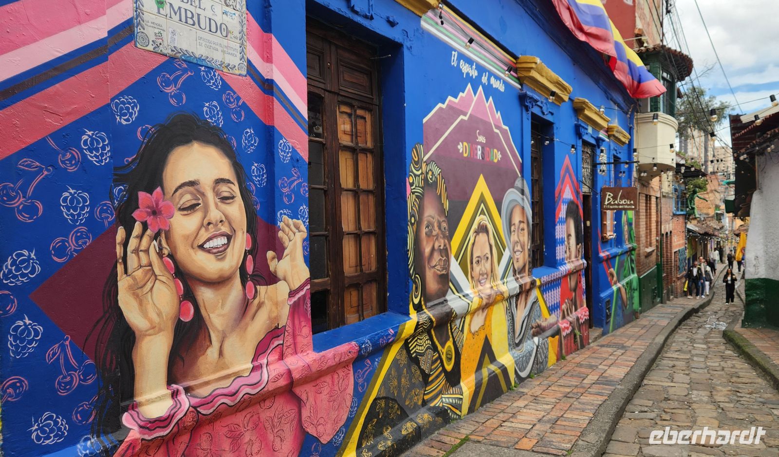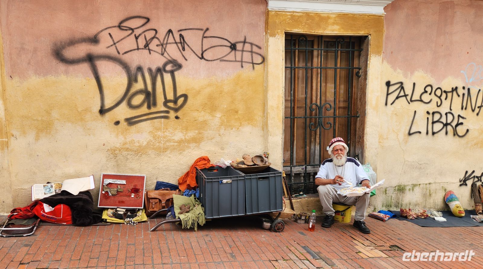 Im Anschluss spazieren wir durch La Candelaria, das historische Herz Bogotás. Das Viertel ist bekannt für seine farbenfrohen Kolonialhäuser, Kopfsteinpflaster, kleinen Cafés und Straßenkünstler. Zwischen Graffitis, Kunsthandwerk und lebendigem Straßenleben bekommen wir ein Gefühl für den Charakter der Stadt.
