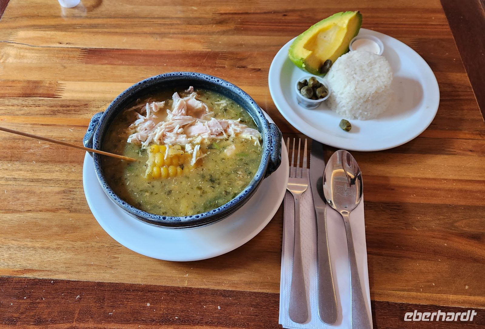 Zum Mittagessen kehren wir in ein sehr hübsches Restaurant ein. Heute probieren wir alle ein typisches kolumbianisches Gericht, das unser Reiseleiter Cesar empfiehlt: Ajiaco, eine herzhafte Suppe aus drei Kartoffelsorten, Maiskolben, Hähnchenfleisch, Guascas-Kräutern und Sahne, die mit Kapern und Reis serviert wird. Ein echtes Wohlfühlgericht – perfekt für die Höhenlage Bogotás.