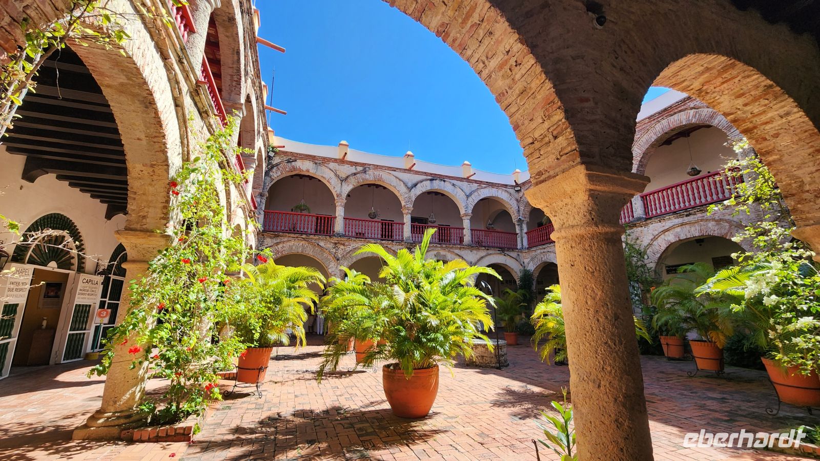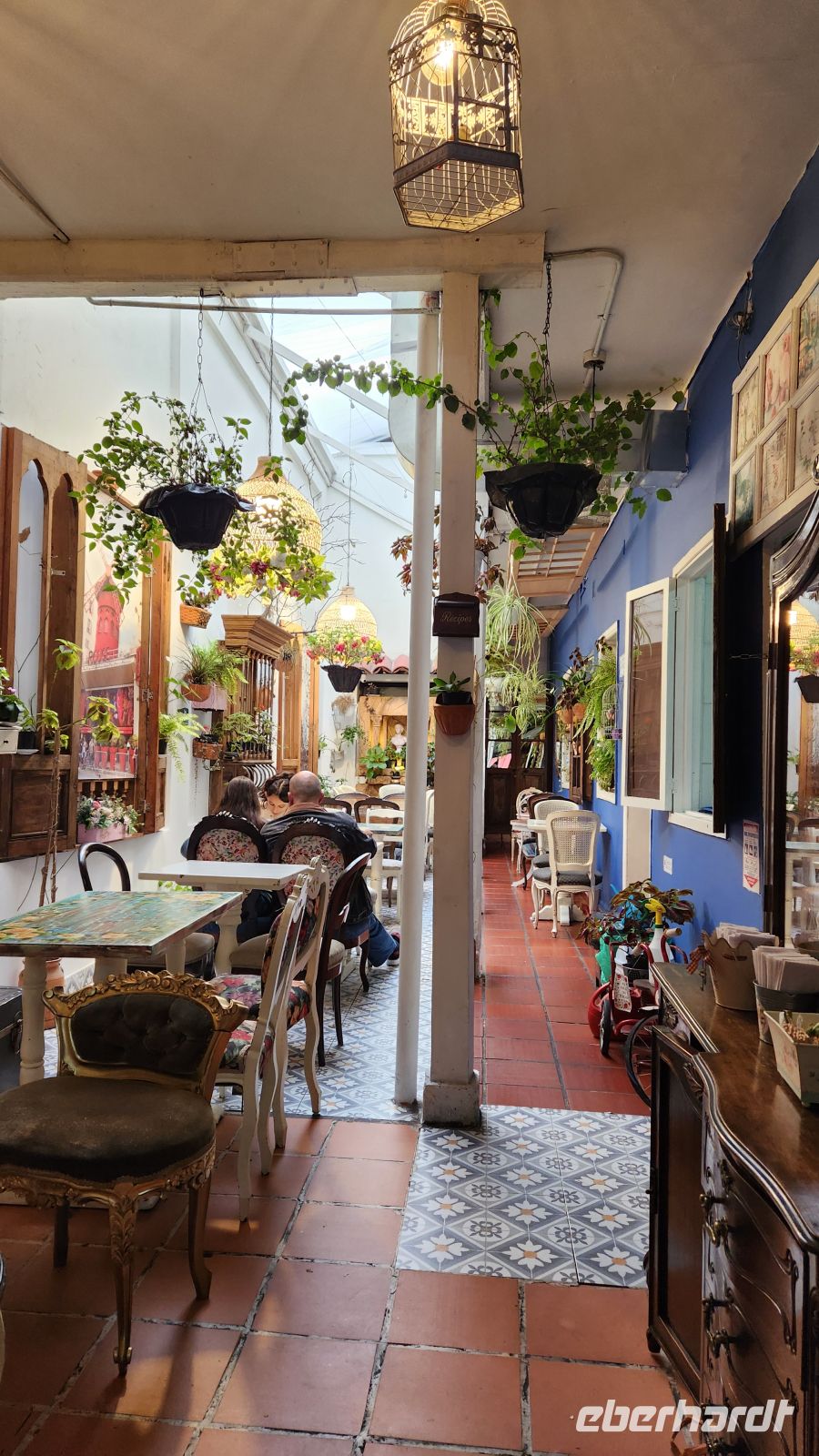 Zu Mittag essen wir in einem sehr schönen Restaurant im Kolonialstil – hohe Decken, Holzbalken, bunte Fliesen. Danach checken wir in unser hübsches Hotel ein, ebenfalls ein Haus im Kolonialstil. Im Innenhof befindet sich ein kleiner Pool, umgeben von Pflanzen – eine ruhige kleine Oase mitten in der Stadt.