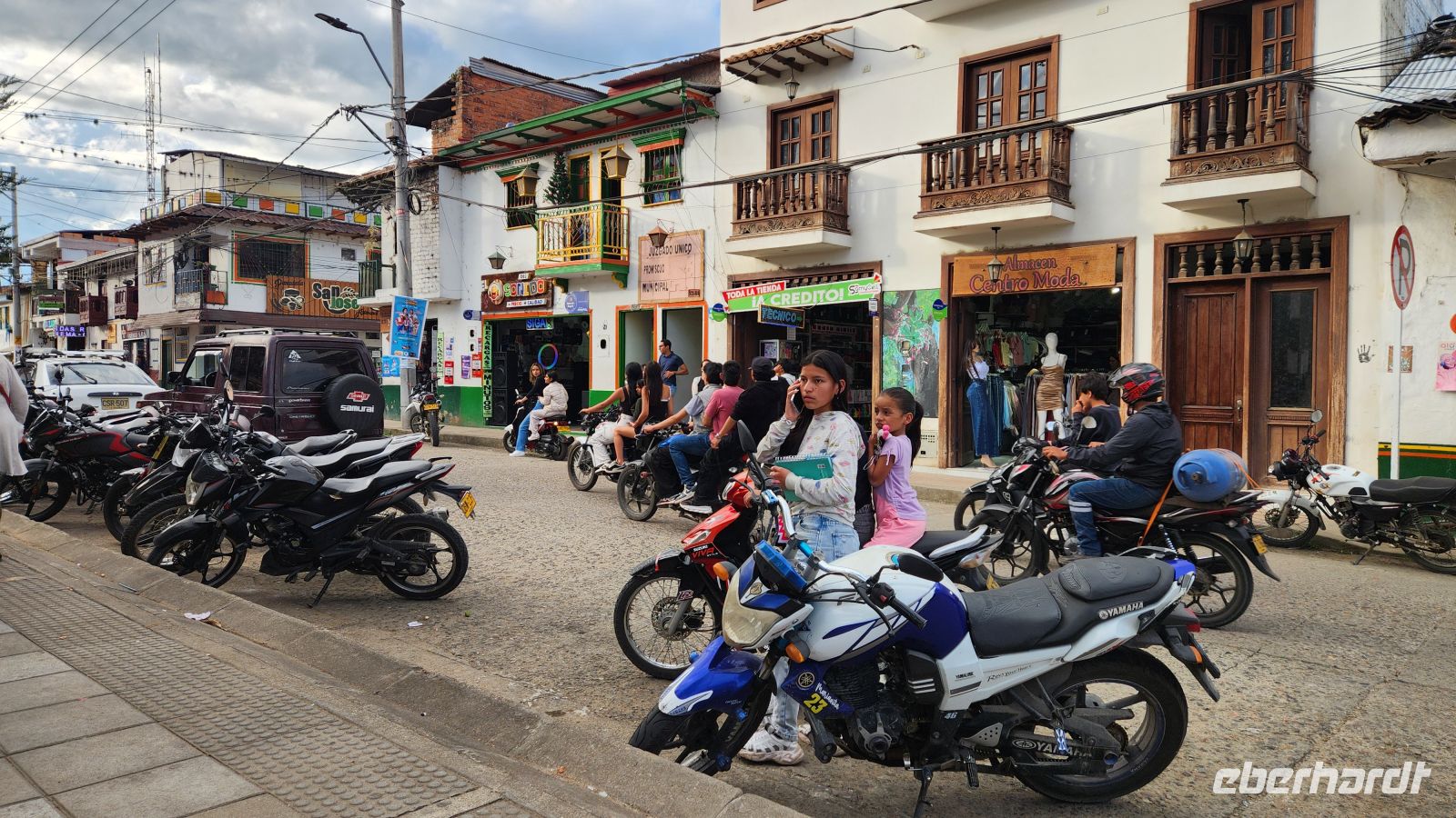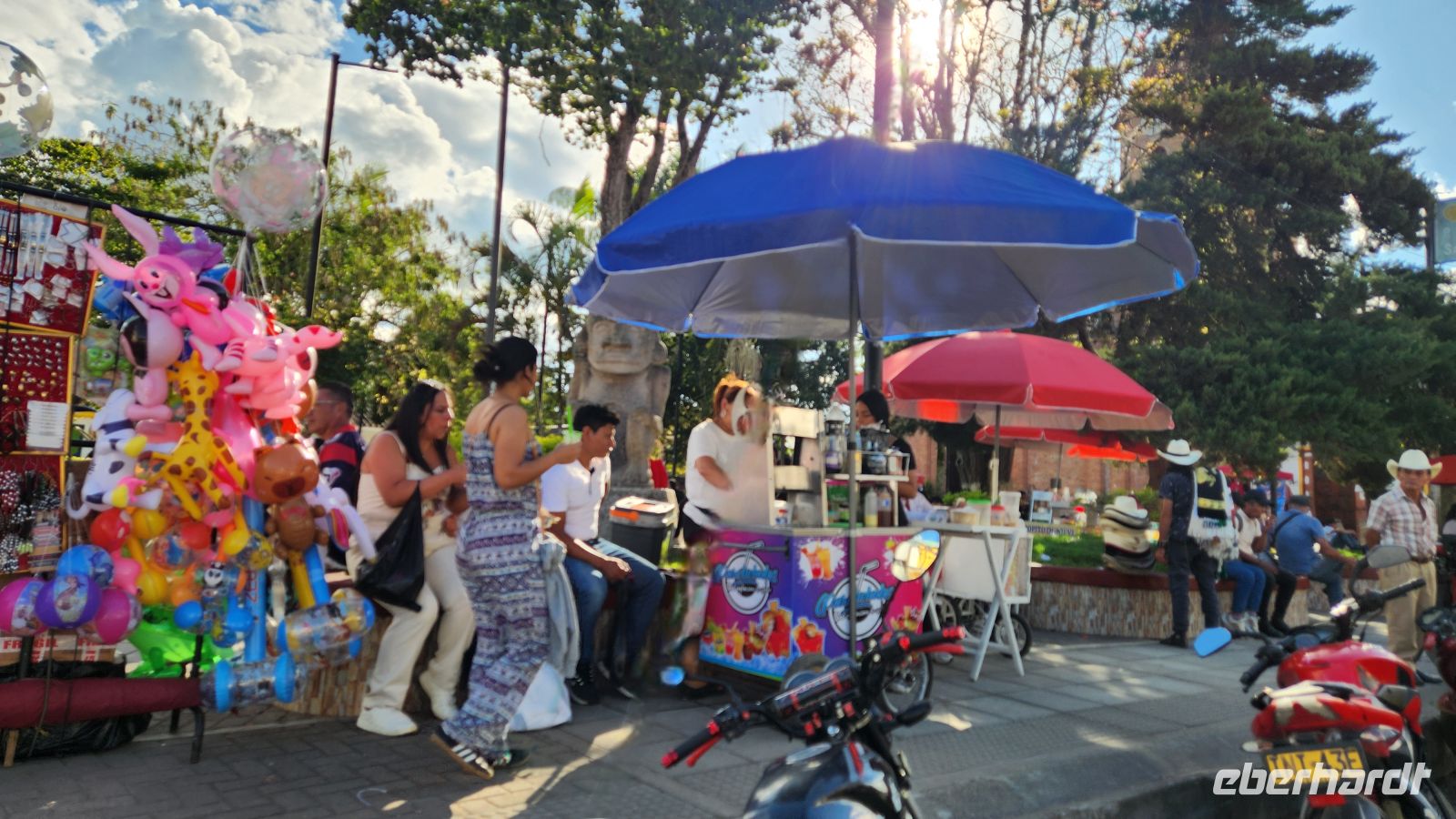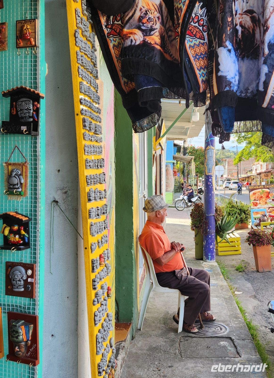 Zuerst setzen wir uns gemeinsam in ein sehr einfaches Lokal und beobachten von unserem Tisch aus lange das Treiben der Stadt: Mopeds, auf denen 3 Freunde oder ganze Familien sitzen, Kinder, ältere Herrschaften und auch ein Kolumbianer mit vielen Hüten auf dem Kopf und einem stolzen Lama an der Leine, laufen an unserem Cafe vorbei. Danach bummeln wir durch die kleinen Geschäfte, schauen uns Handwerkskunst und Souvenirs an und genießen einfach die entspannte Atmosphäre.