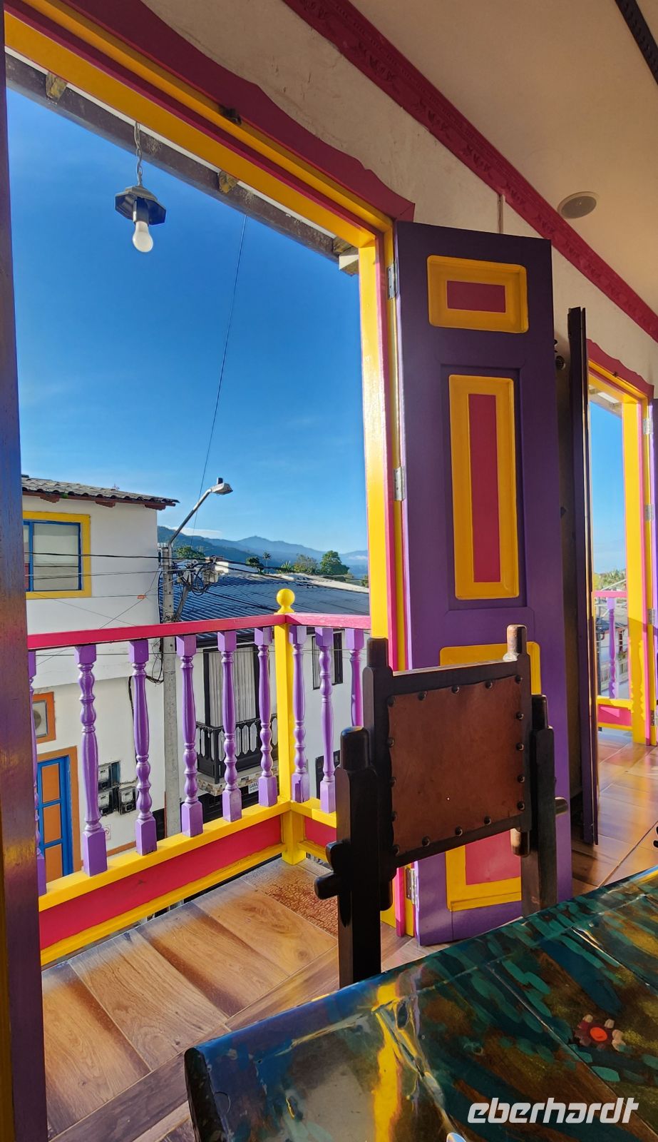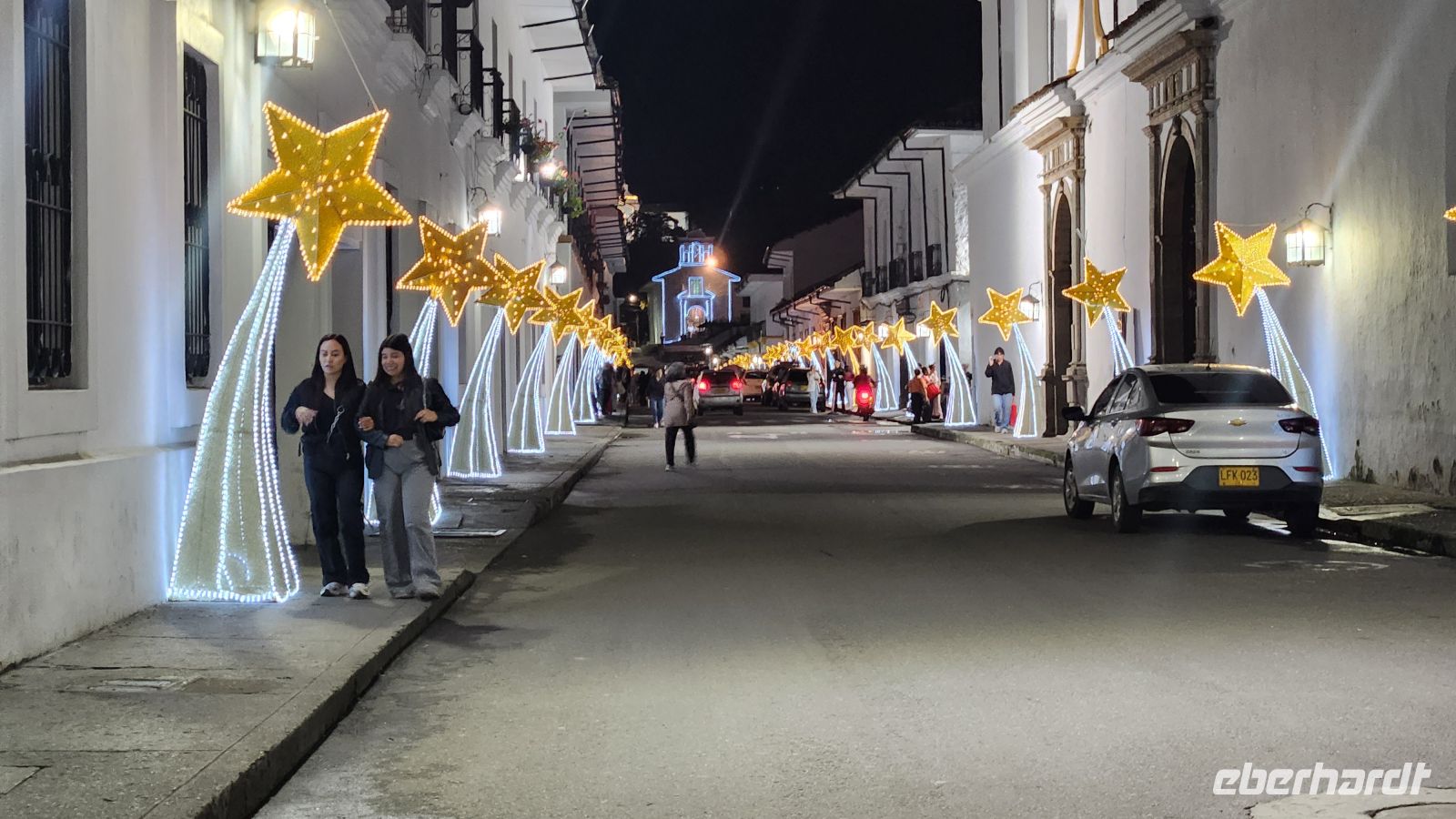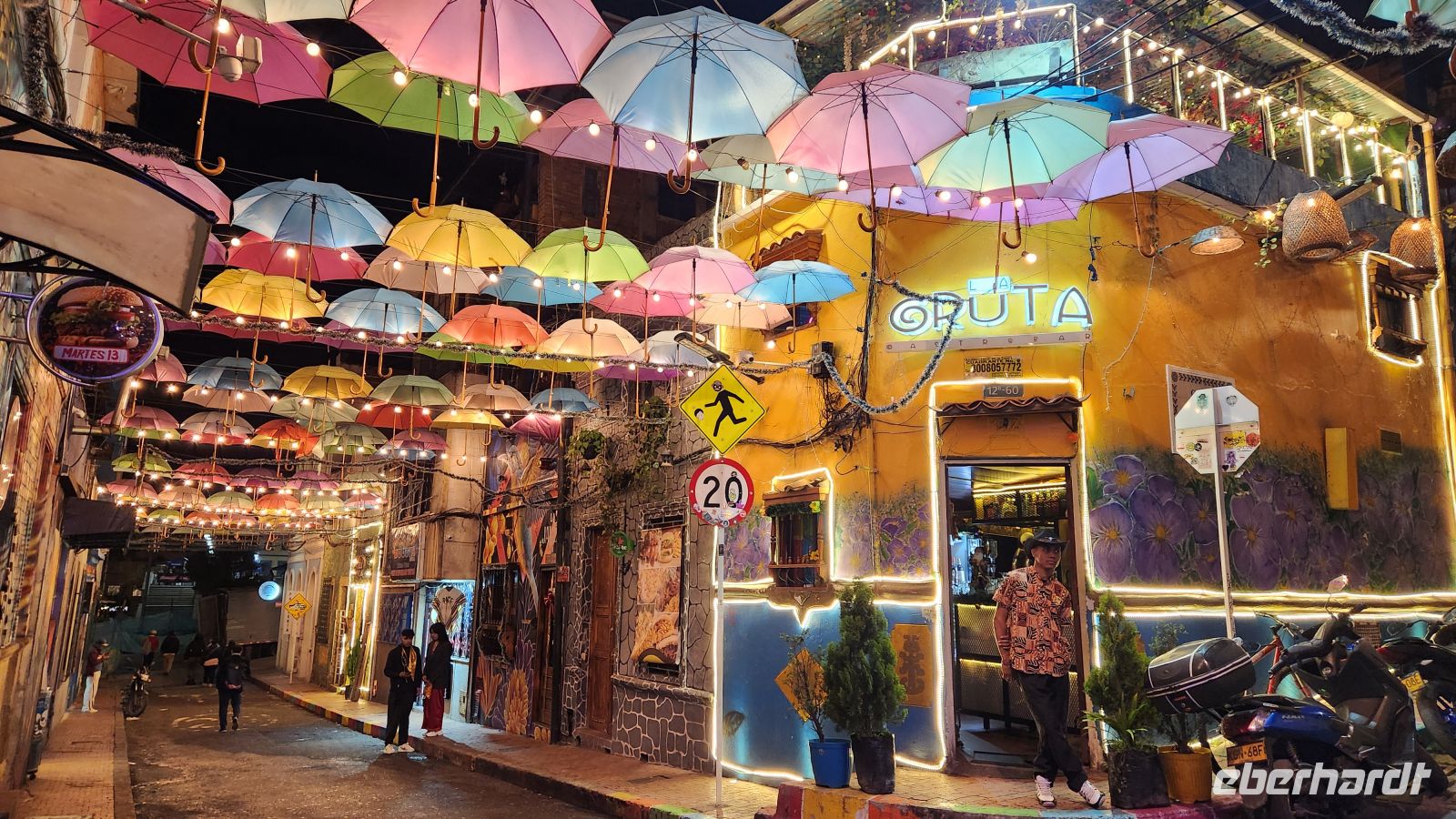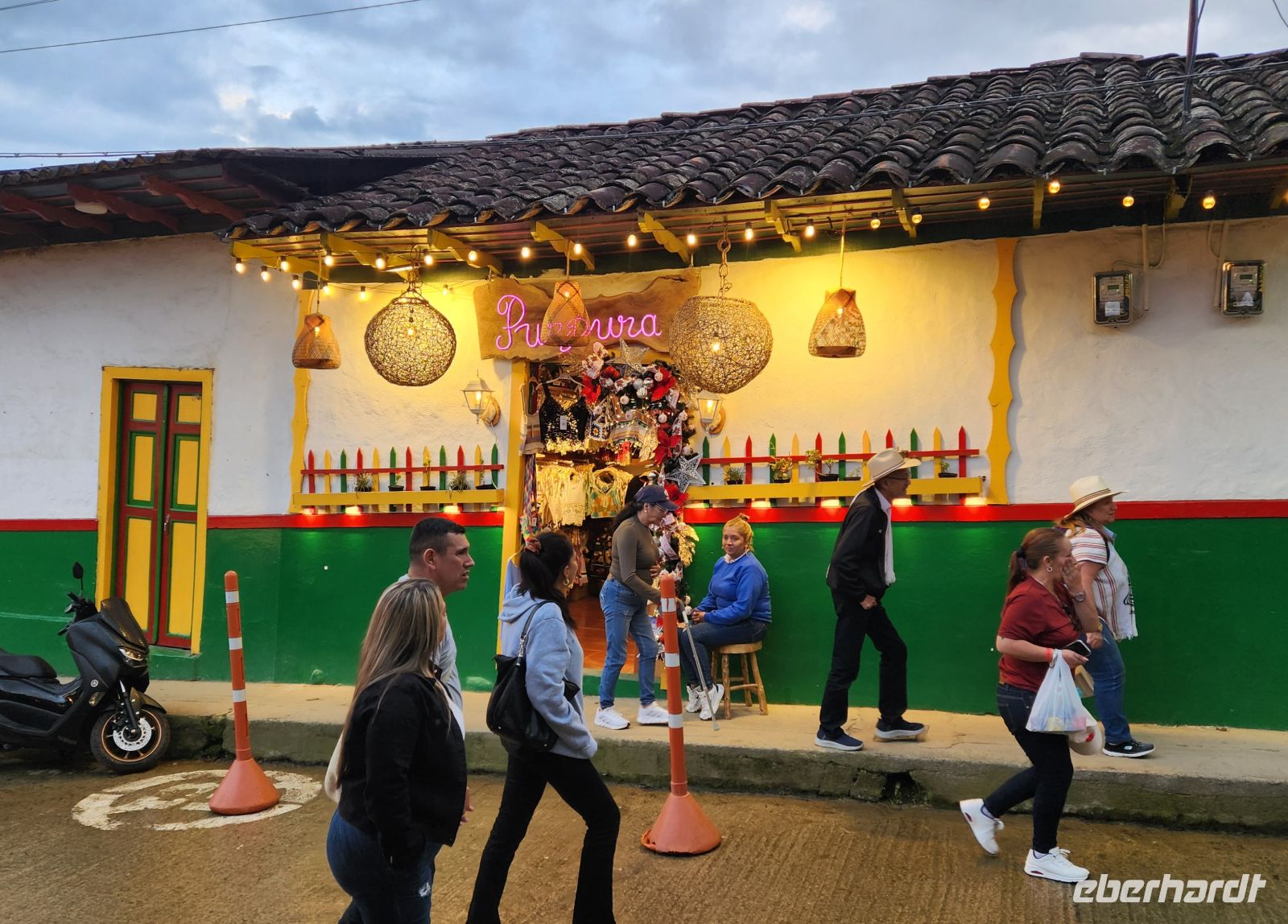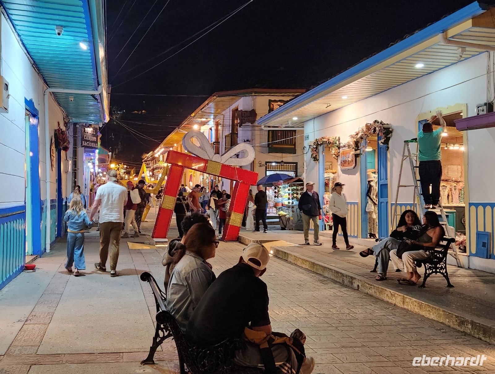Nach dem Essen schlendern wir durch die beleuchteten Straßen. Überall gibt es kleine Läden, Cafés und Bars, alle bunt, kreativ und voller Details dekoriert. Wir gelangen zum Plaza Bolívar, dem zentralen Platz des Ortes, und setzen uns draußen in eine lebhafte Kneipe. Laute Musik dringt auf die Straße, die Gäste sind ausgelassen und fröhlich.