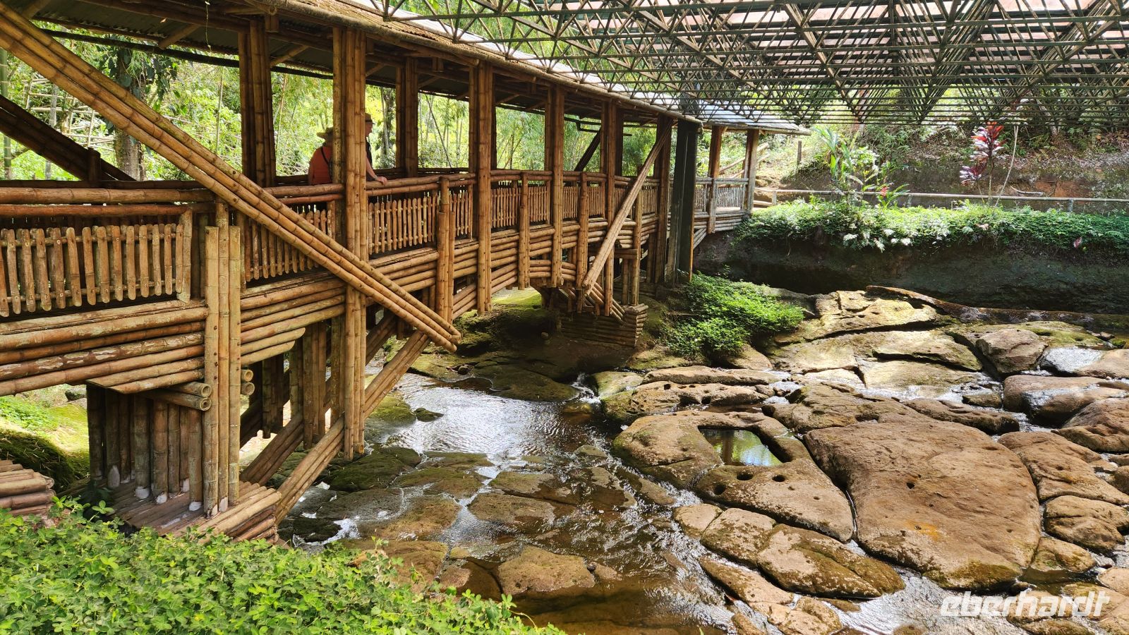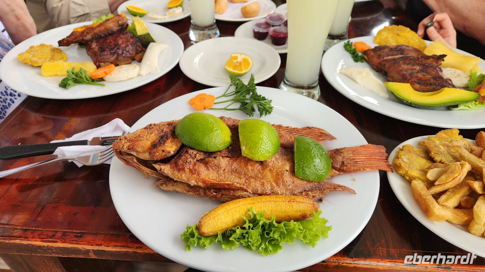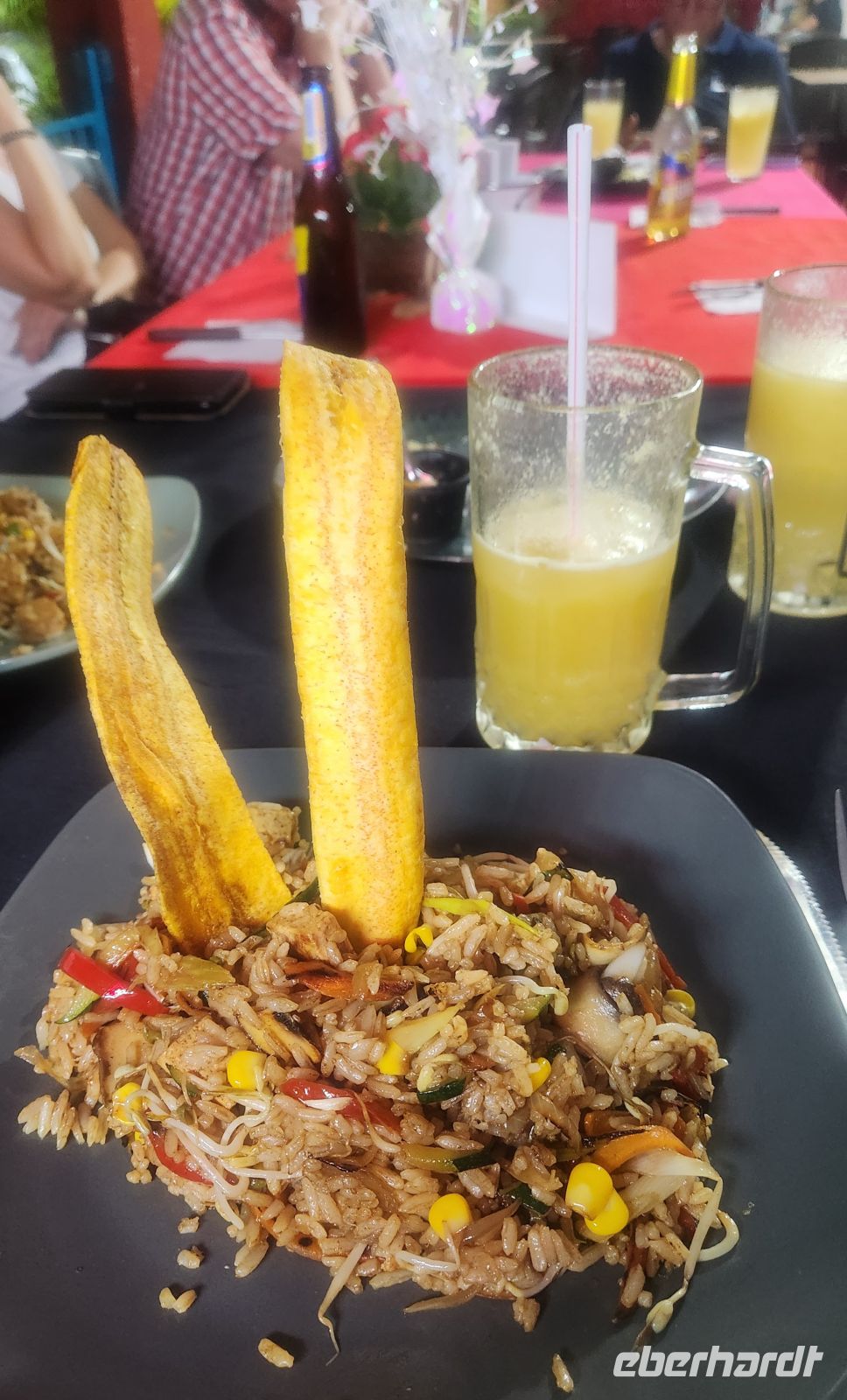 Zum Mittagessen kehren wir in ein großes, farbenfrohes, familiengeführtes Restaurant ein. Kaum sitzen wir, setzt plötzlich starker Regen ein – ein typischer Tropenregen, so wie man es sich auch vorstellt Wir freuen uns umso mehr über unser Wetterglück, denn während wir oben am Aussichtspunkt waren, schien die Sonne und der Himmel war frei.