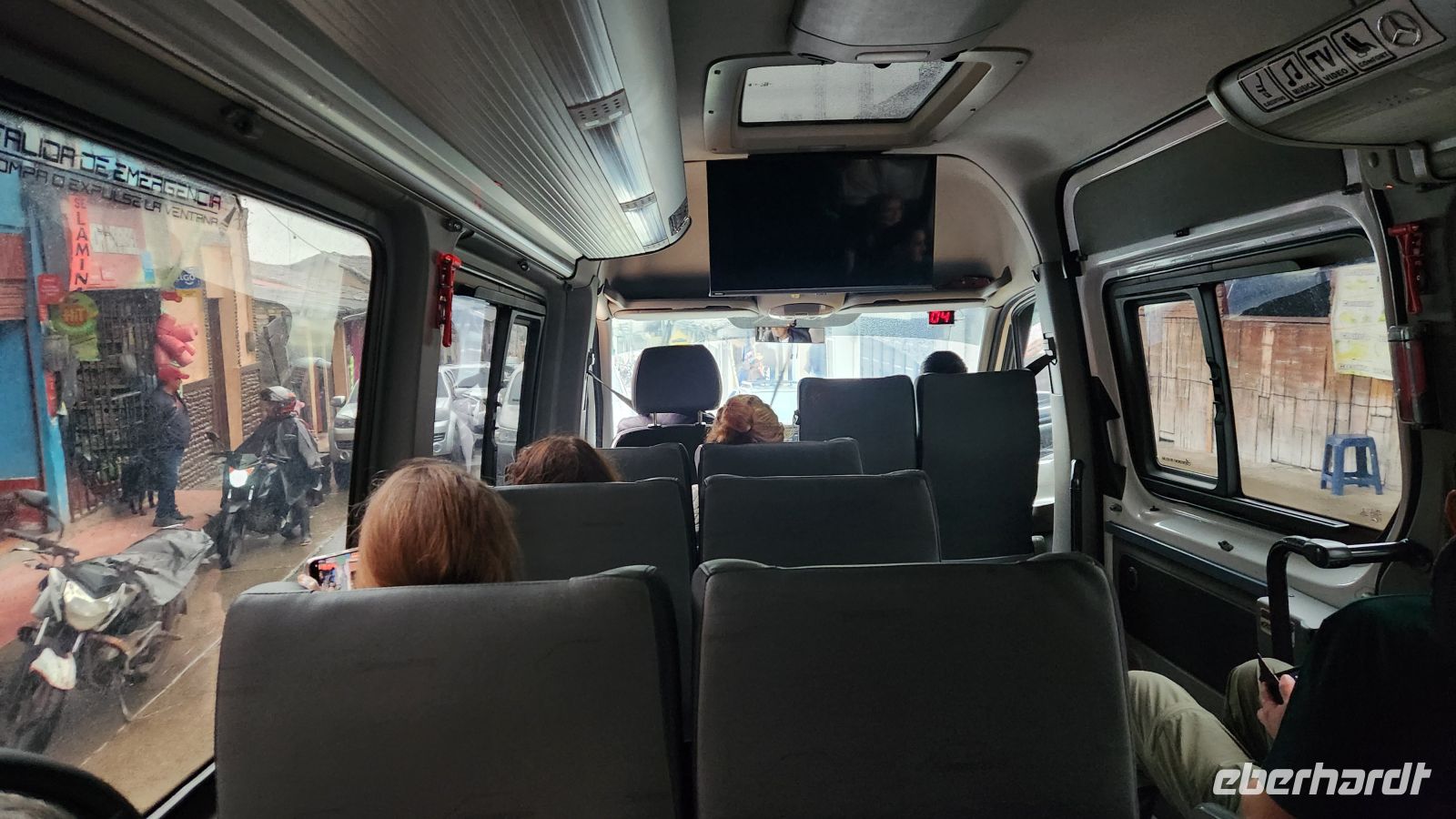 Ein großer Teil der Strecke führt über eine nicht asphaltierte Straße, voller Schlaglöcher und steiler Passagen. Rodolfo, unser Busfahrer, manövriert uns mit viel Erfahrung und Ruhe durch die bergige Landschaft. Unser höchster Punkt liegt heute bei rund 3.000 Metern, und zeitweise fahren wir direkt durch Wolken – die Sicht wird milchig, die Atmosphäre fast mystisch.