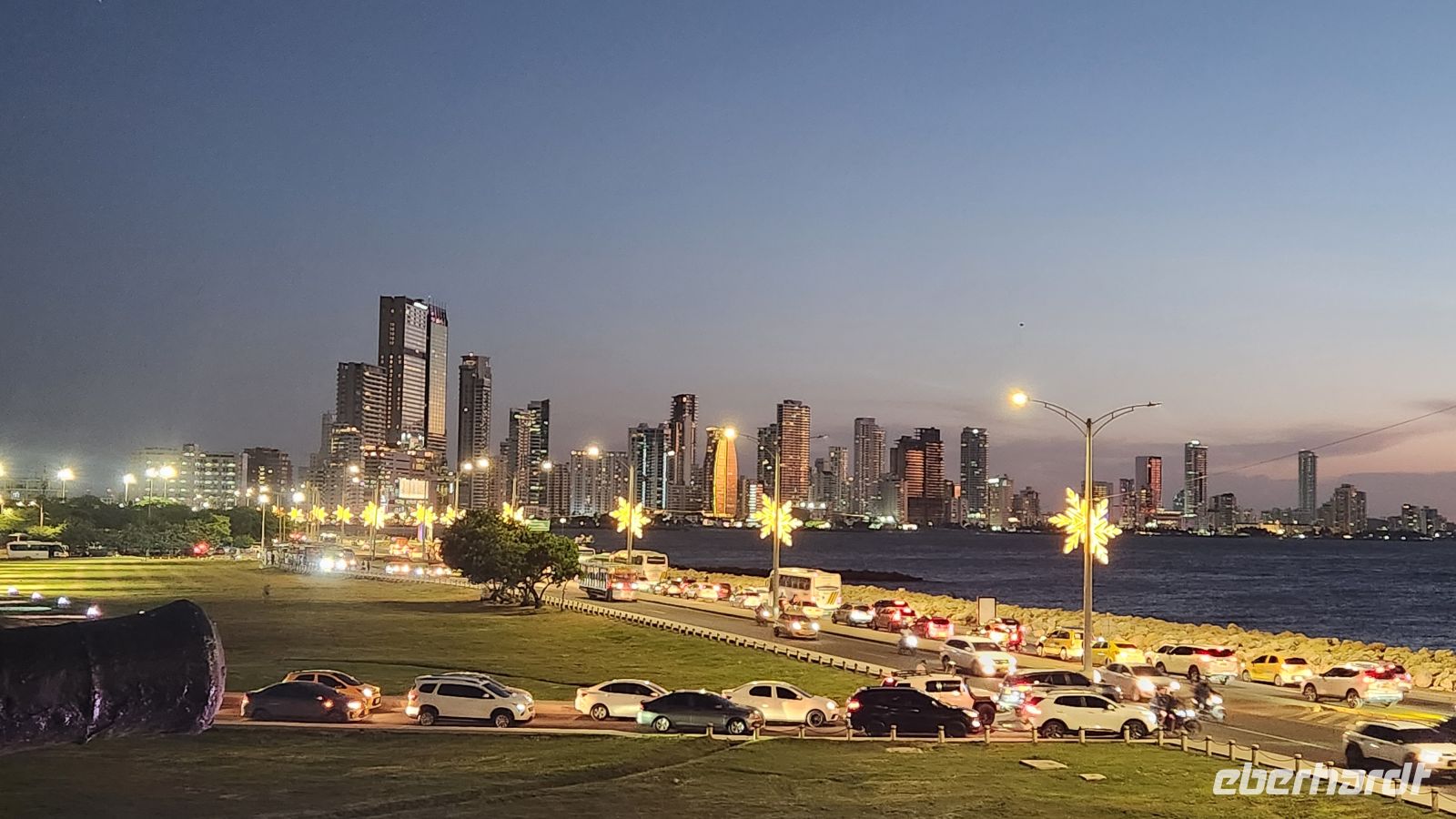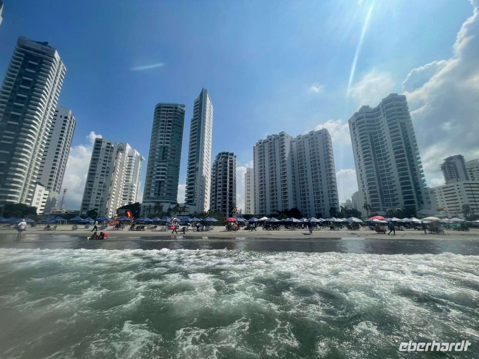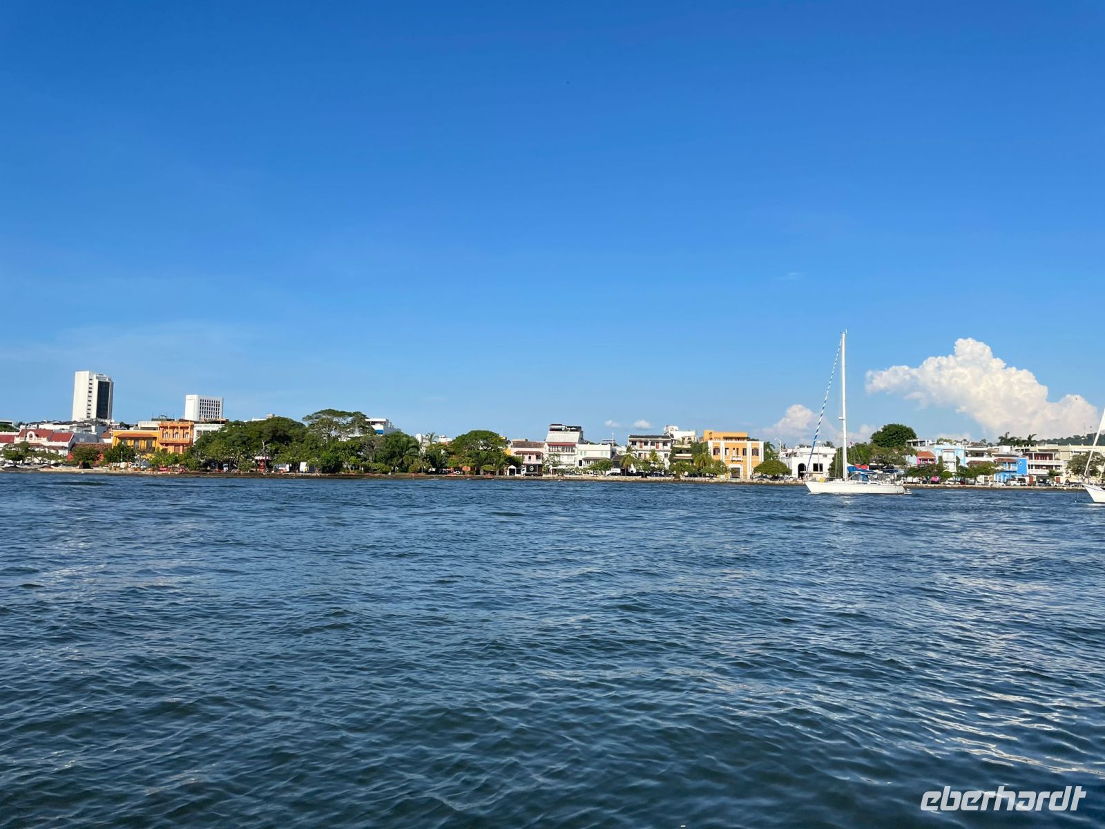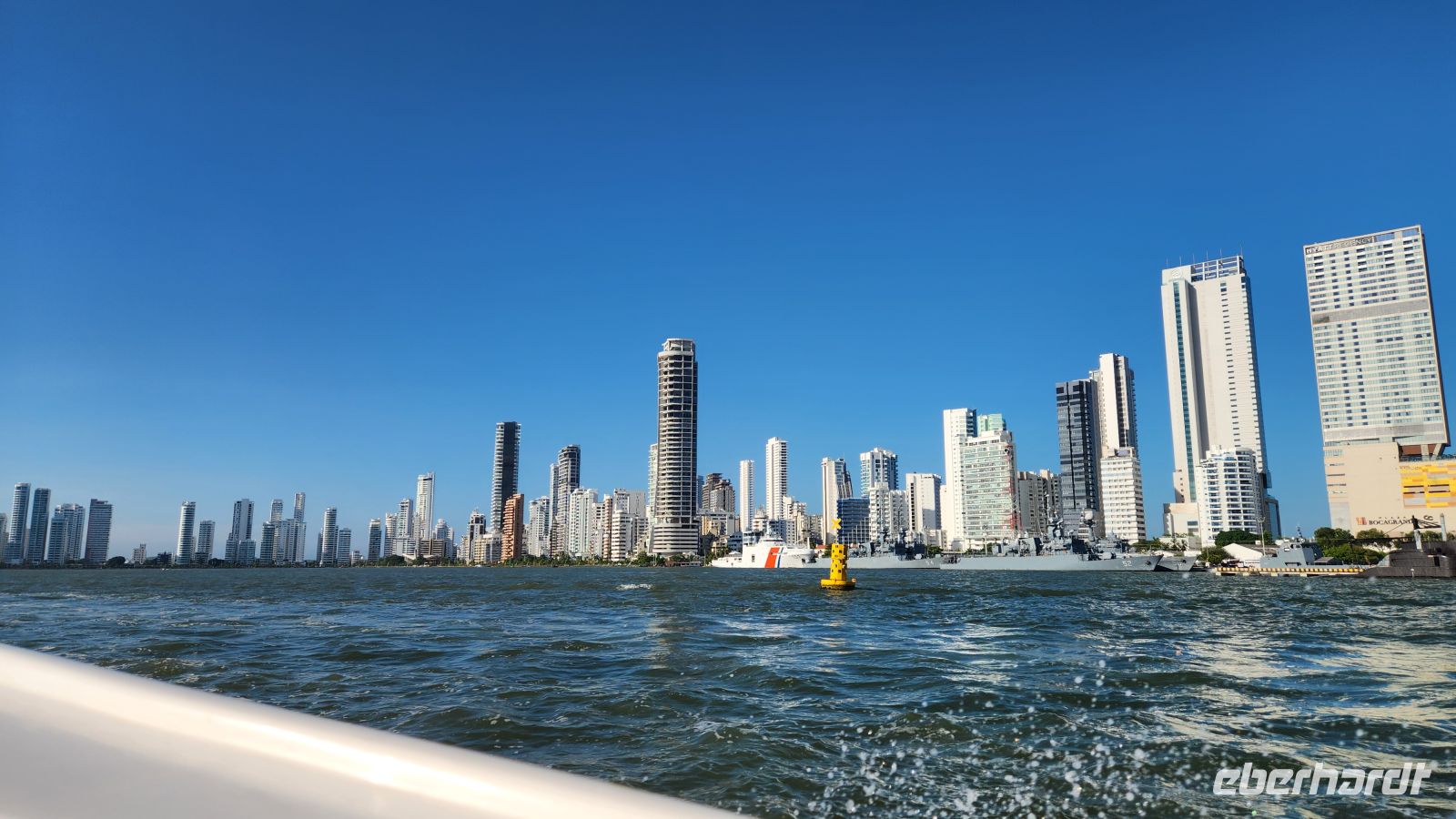 Bei der Rückfahrt mit dem Schnellboot fährt man direkt auf die atemberaubende Skyline Cartagenas zu – die weißen Hochhäuser der modernen Stadt und dahinter die Kirchtürme der Altstadt. Ein beeindruckender Anblick, dazu laute Musik, die gute Laune macht.