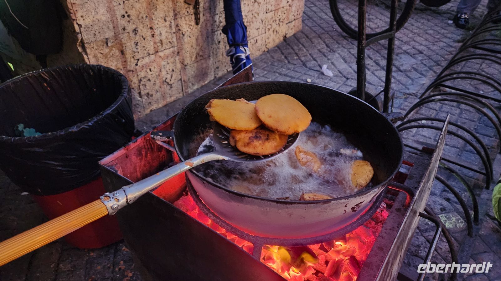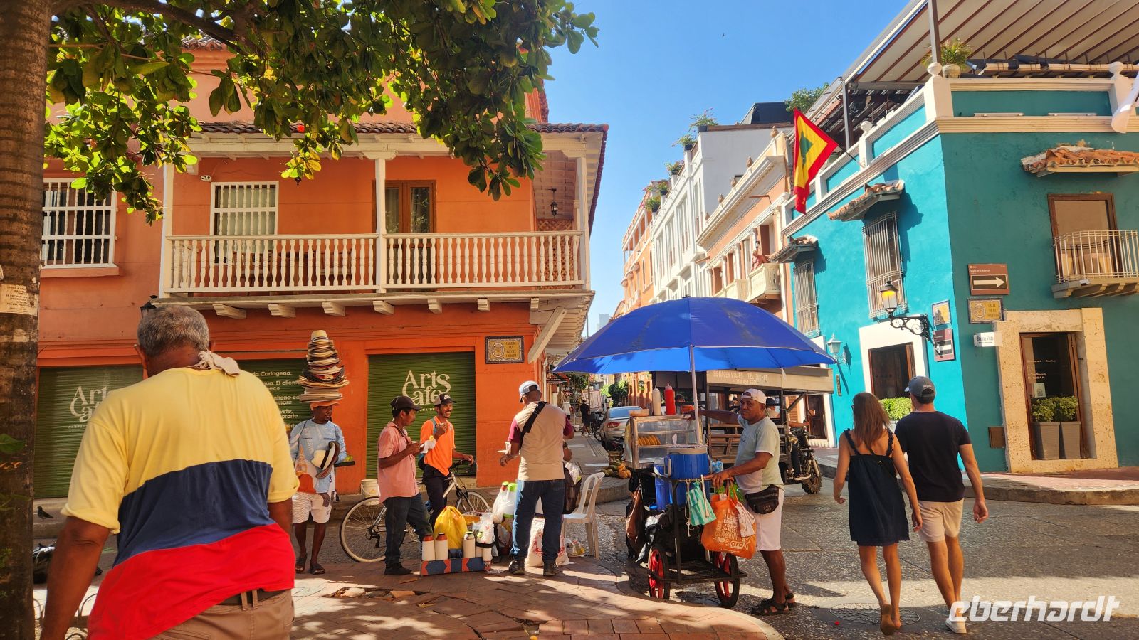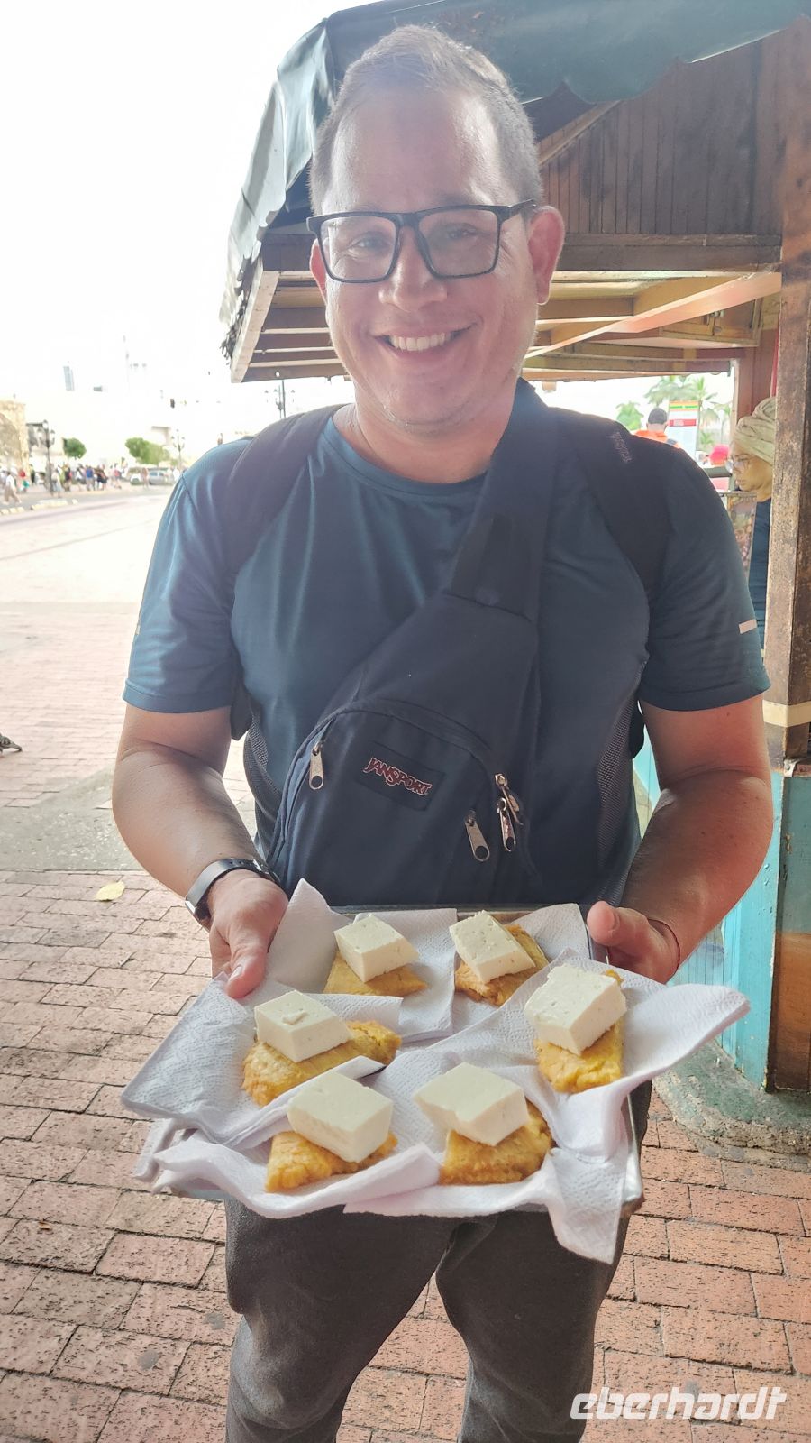 Am frühen Abend unternehmen wir eine Streetfood-Tour mit Carlos. Er erklärt uns die kleinen Snacks und Getränke, die man an jeder Ecke findet – Arepas, Empanadas, Meeresfrüchte, frische Säfte, Süßigkeiten und vieles mehr. Wir probieren viele dieser Köstlichkeiten und entdecken ganz nebenbei neue, kleine Ecken in der Altstadt von Cartagena, in die wir sonst nie gekommen wären.
