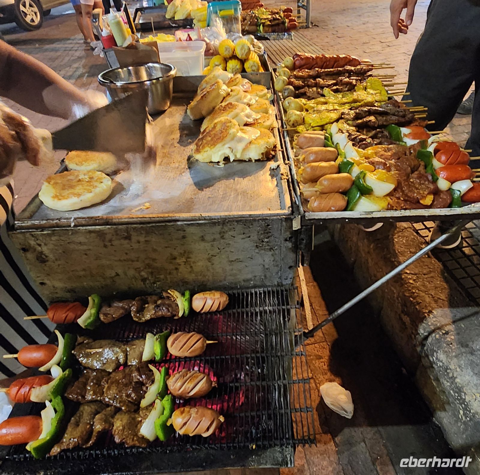 Wir laufen durch die beleuchteten Straßen, und in einer kleinen Straße sehen wir eine große Menschengruppe tanzen. Einer aus der Menge macht die Bewegungen vor, und alle tanzen im gleichen Rhythmus – ein traditioneller Straßentanz, der jeden Freitag stattfindet. Natürlich machen wir sofort mit, lachen und bewegen uns im Takt.