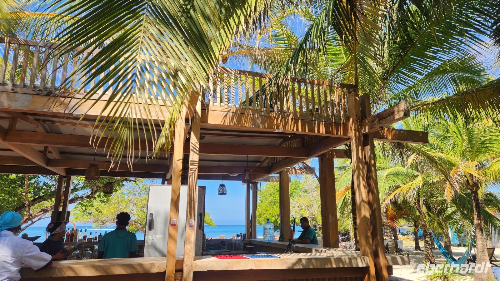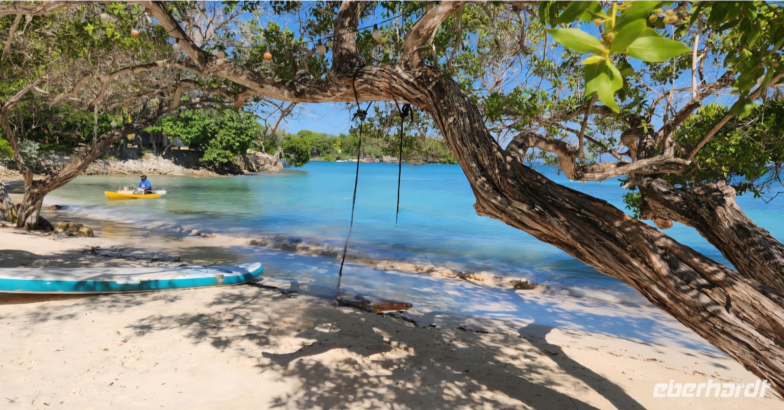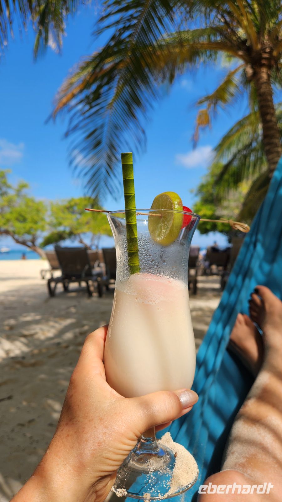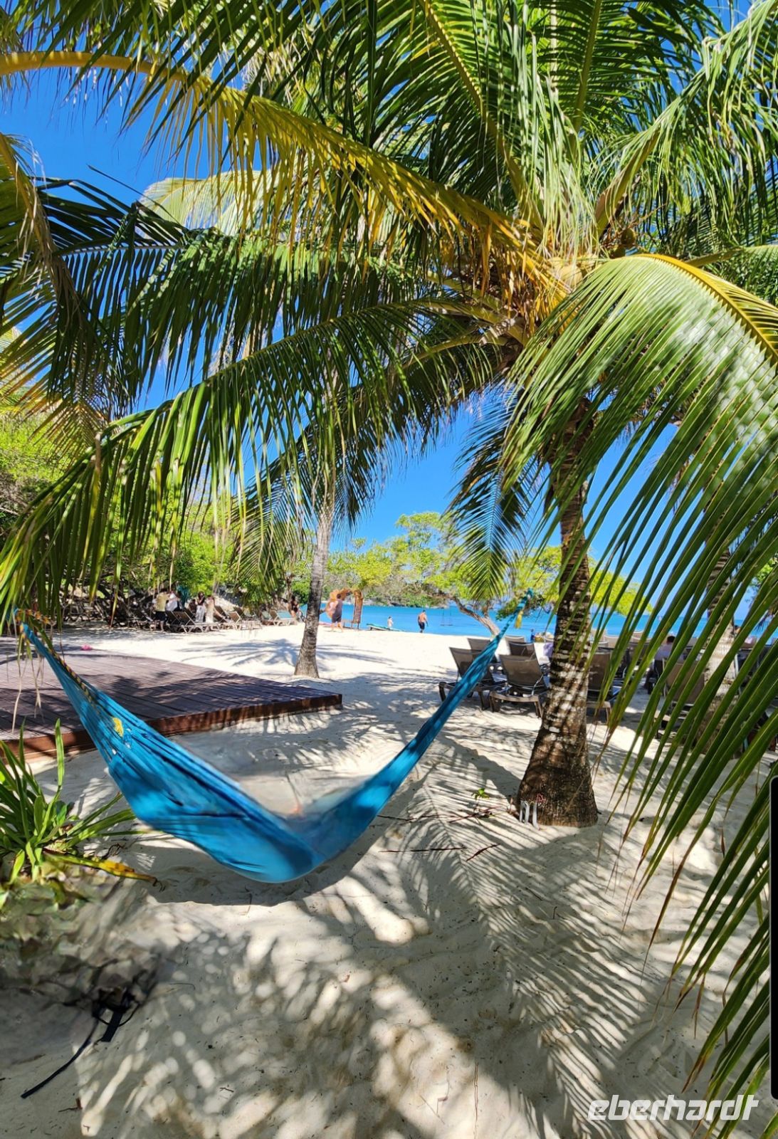 Dort verbringen wir einen traumhaften Tag. Viele Liegen und Hängematten stehen im Schatten von Bäumen und Kokospalmen bereit und laden zum Entspannen ein. Das klare Wasser ist perfekt zum Baden und Schnorcheln, und man sieht viele bunte Fische. Eine hübsche Strandbar bietet leckere Cocktails und frische Säfte an. Es ist wirklich genauso, wie man sich die Karibik vorstellt: entspannt, warm und wunderschön.