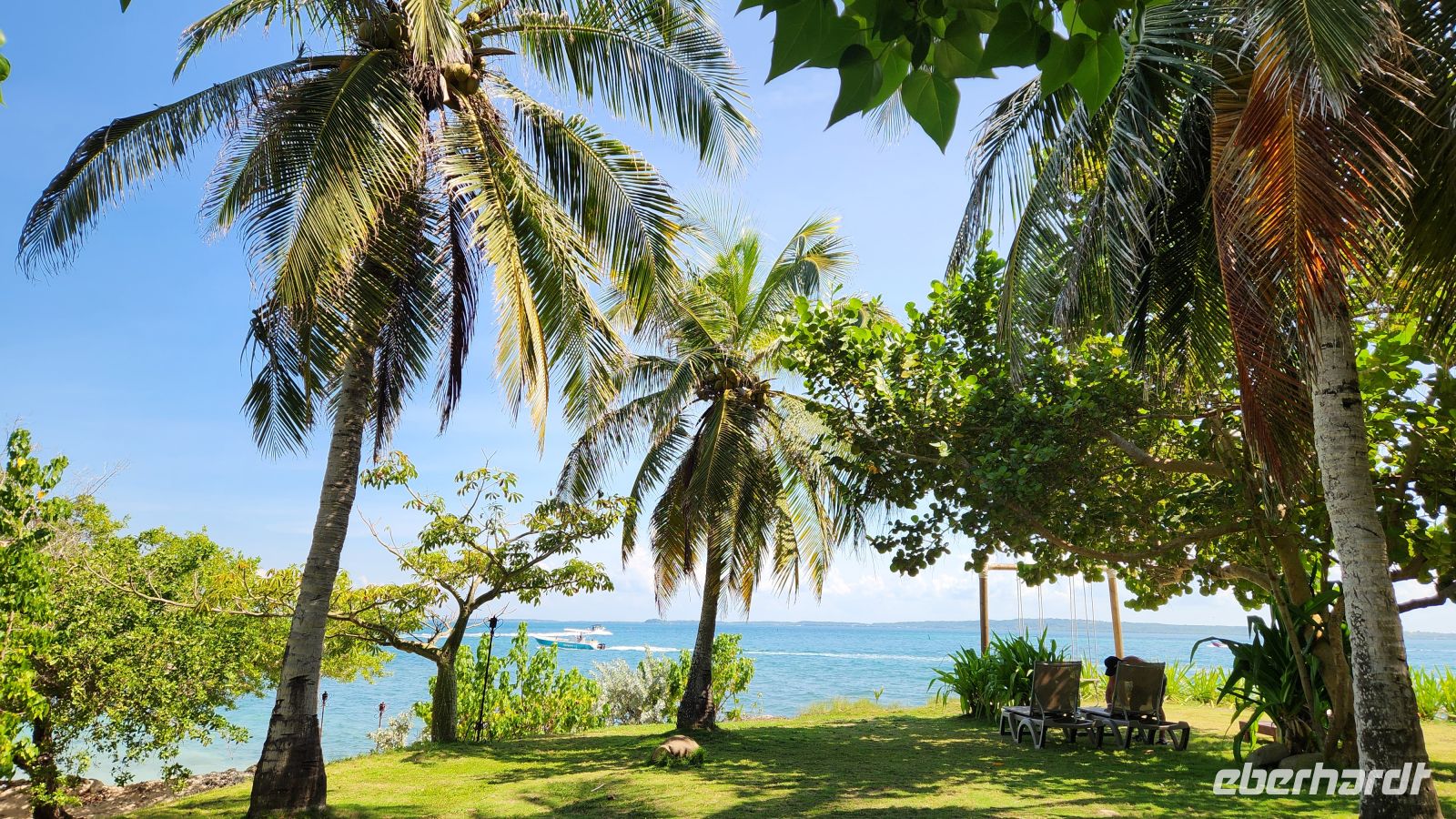 Zum Mittagessen bekommen wir ein sehr leckeres, frisch zubereitetes Essen. Wer möchte, kann sich im Schatten auf bequemen Liegen massieren lassen oder mit dem Kajak eine kleine Runde über das stille Wasser drehen.