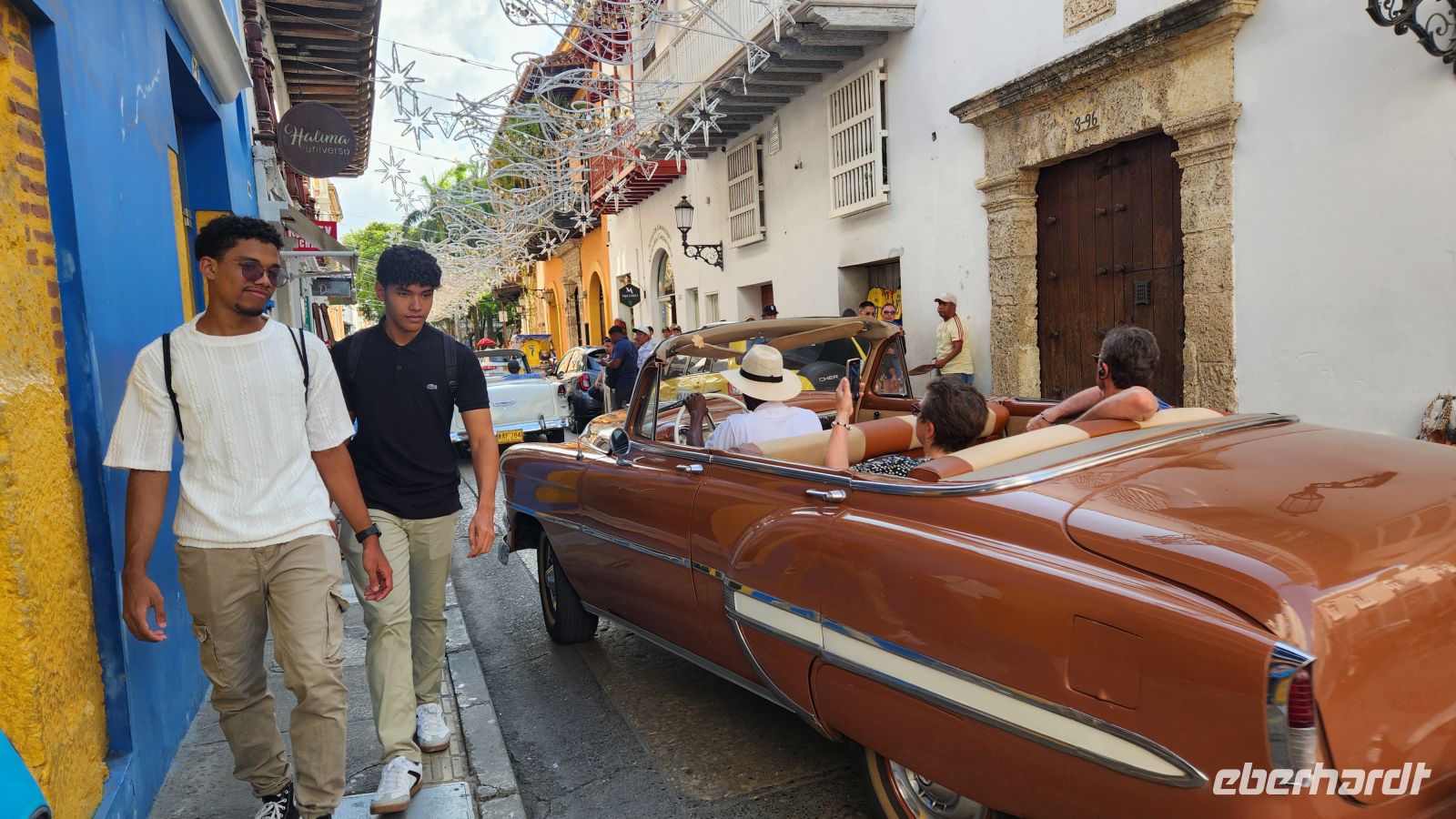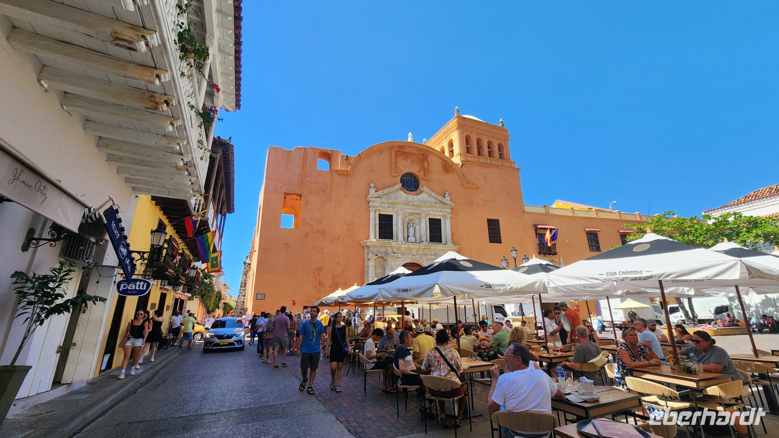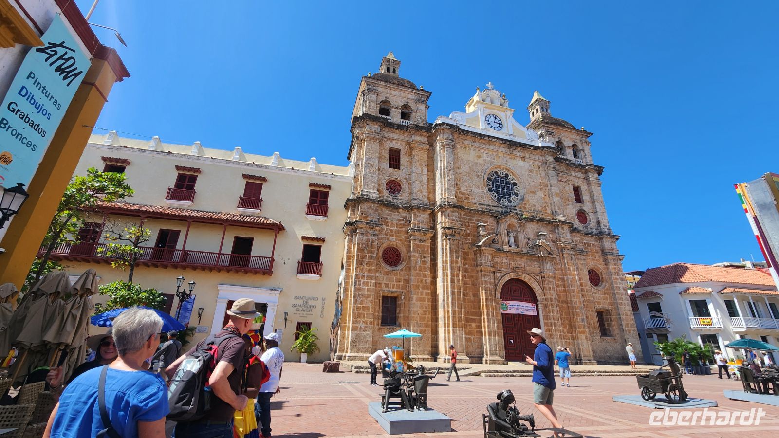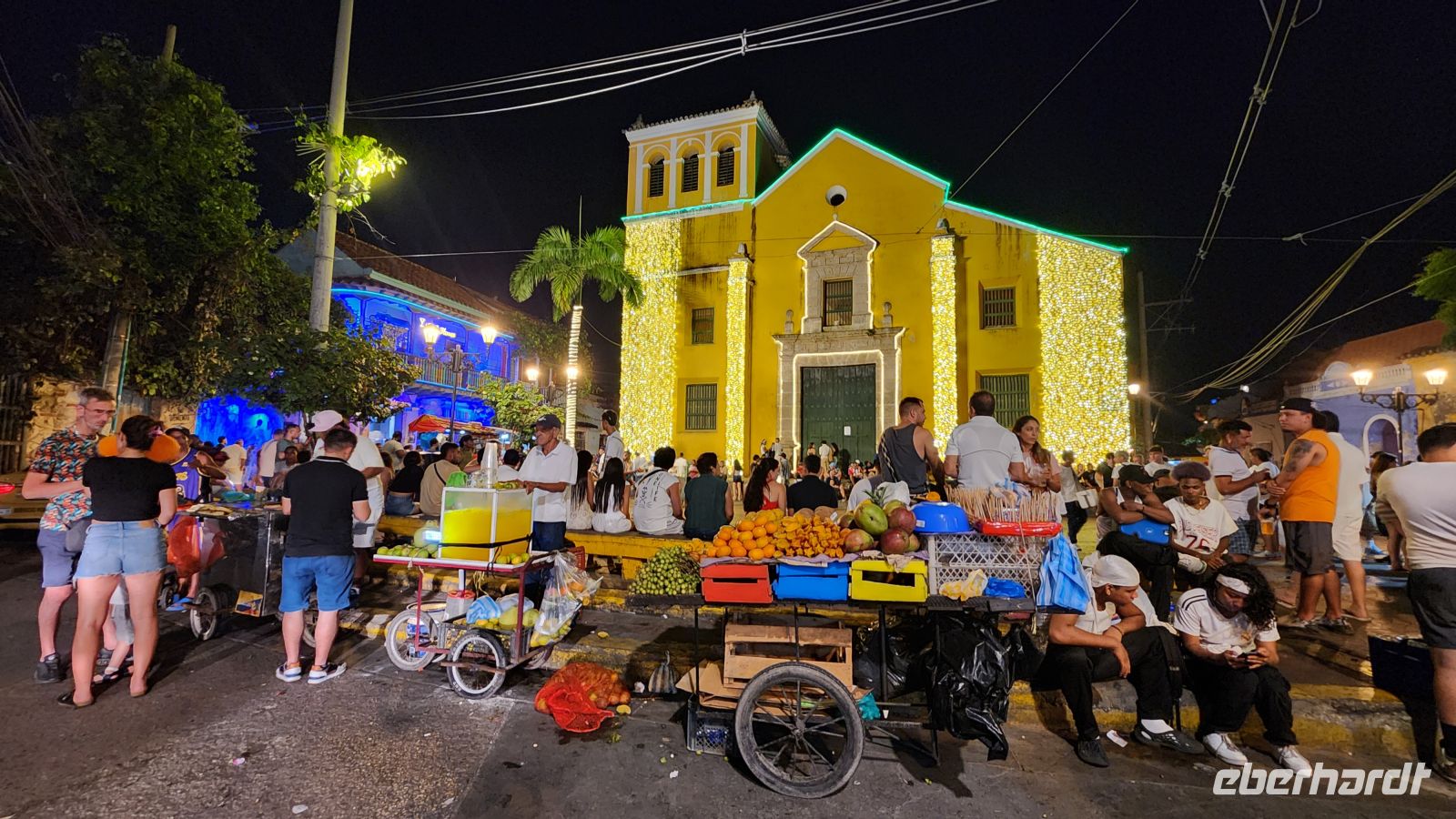 Danach geht es hinunter in die Altstadt, die zum UNESCO-Weltkulturerbe gehört. Bei unserem Rundgang sehen wir den Uhrturm, das Wahrzeichen der Stadt, die Iglesia San Pedro Claver, mehrere wunderschöne Kirchen und den Palast der Inquisition. Wir bewundern die bunten Häuser im Kolonialstil, die Blumen an den Balkonen und das geschäftige Treiben in den Straßen. Unterwegs probieren wir typische Süßigkeiten und frische Früchte, die an kleinen Ständen verkauft werden – lecker und perfekt bei der Hitze.