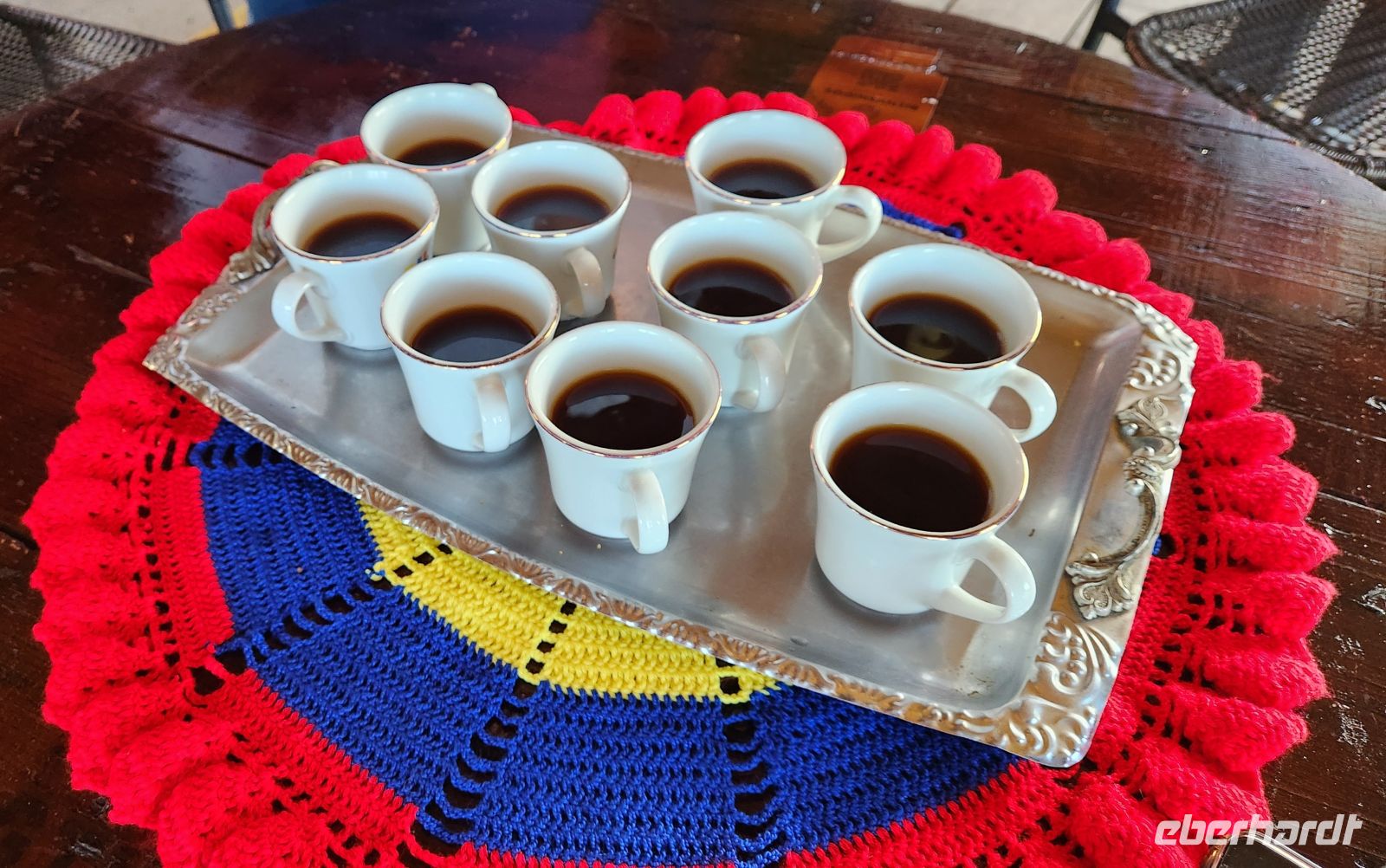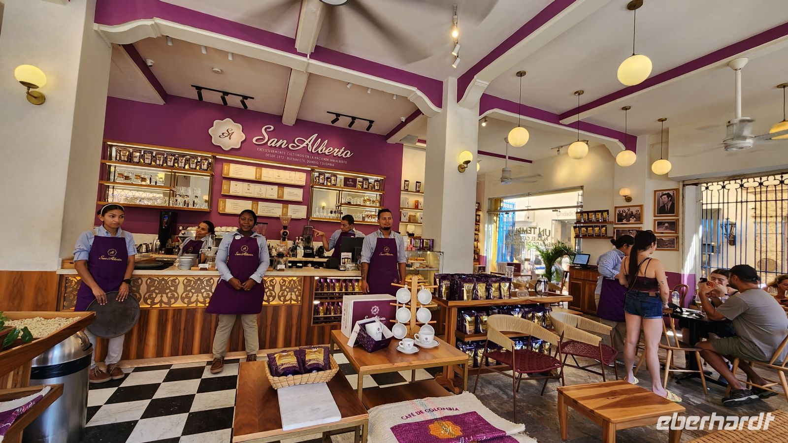 Im Café Alberto, „der ersten Adresse am Platz“, gönnen wir uns nach der Stadtbesichtigung einen sehr guten kolumbianischen Kaffee.