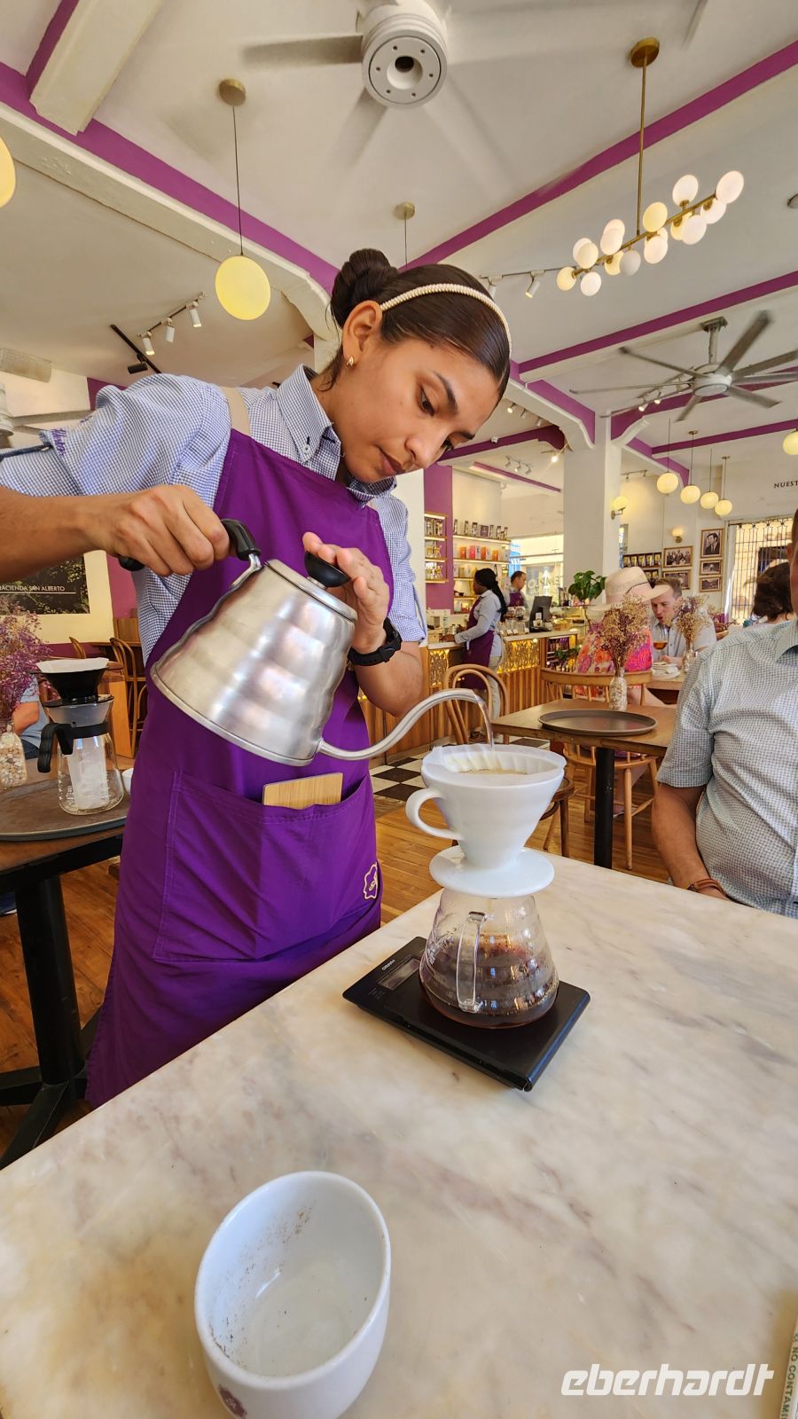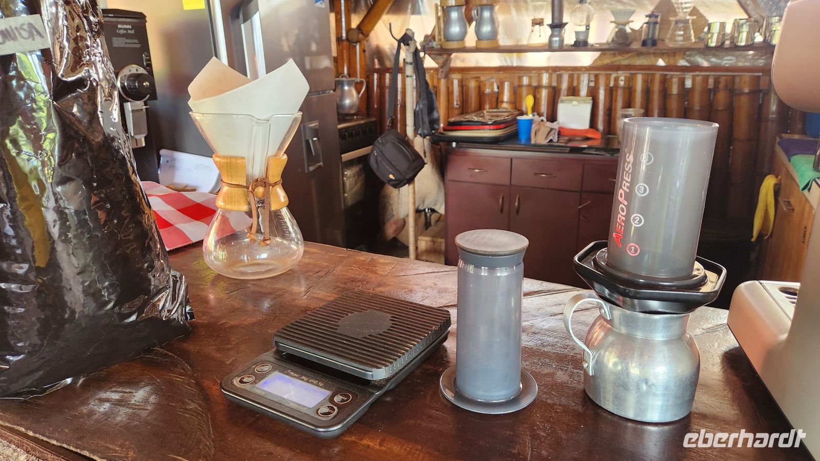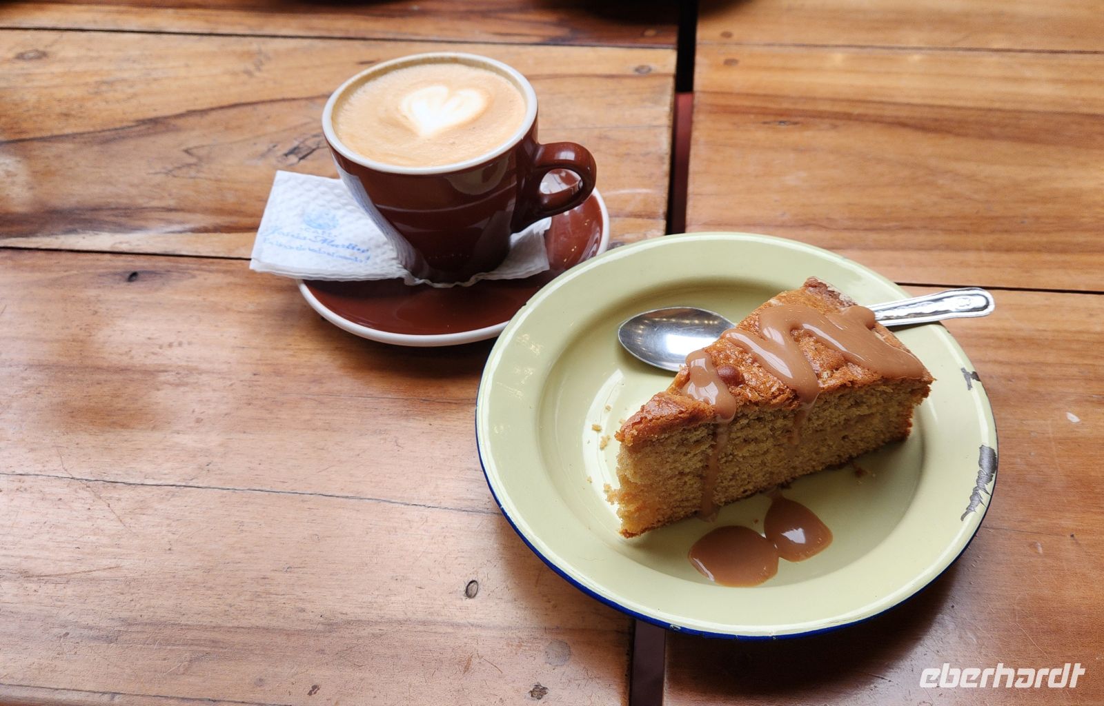 Uns wird der gesamte Prozess erklärt – vom Setzling bis zur Bohne – und dieses Mal erfahren wir auch viel über das Brühen: wie sehr der Geschmack vom Filter, vom Mahlgrad und von kleinen Handgriffen abhängt. Zum Abschluss sitzen wir auf der Terrasse und bekommen zu unserer Tasse Kaffee ein Stück frisch gebackenen Möhrenkuchen. Ein perfekter Moment.