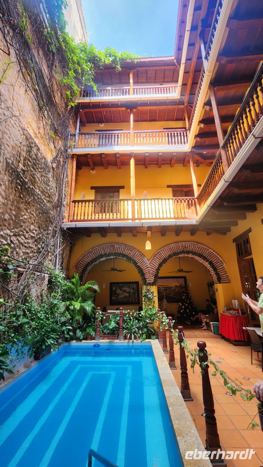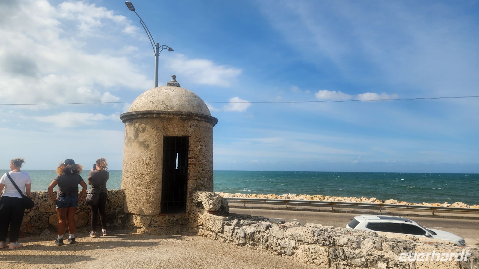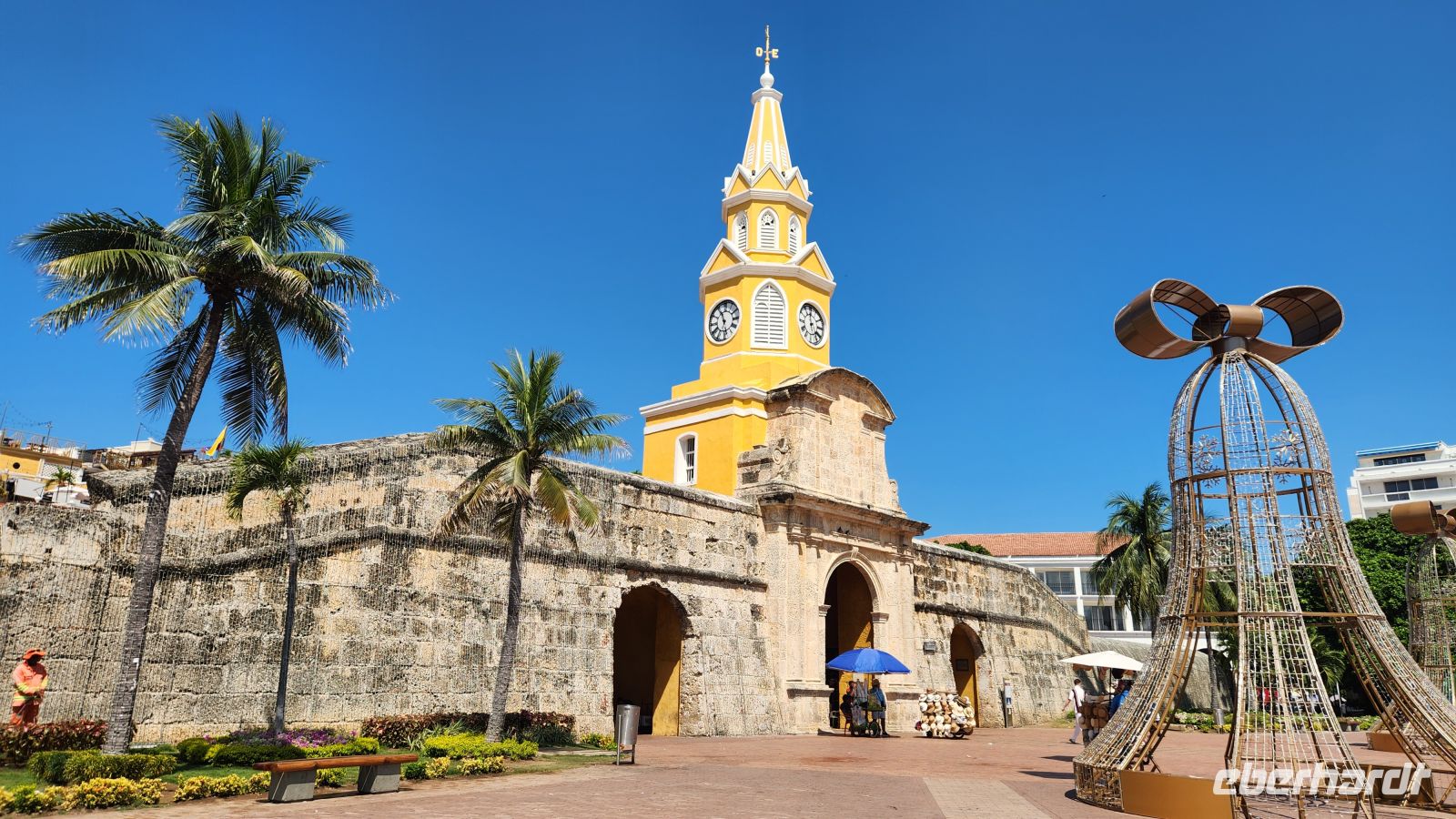 Heute lernen wir Cartagena bei einer Stadtbesichtigung kennen. Die Stadt gehört zu den schönsten Orten Kolumbiens – farbenfrohe Kolonialhäuser, enge Gassen, alte Kirchen und die mächtige Stadtmauer aus der Kolonialzeit prägen ihr Bild. Unser Reiseleiter Carlos erzählt uns spannend und locker von der bewegten Geschichte: von den indigenen Völkern, die hier ursprünglich lebten, den Spaniern, die die Stadt gründeten, den Piraten und Freibeutern, die Cartagena immer wieder überfielen, und der großen Bedeutung des Hafens während der Kolonialzeit.
