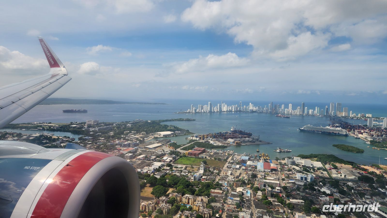 Wir landen mittags bei strahlendem Sonnenschein und 30 Grad. Was für eine andere Welt! Schon aus dem Flugzeug sehen wir die Skyline mit modernen Hochhäusern, daneben die kleinen bunten, alten Häuser – ein beeindruckender Kontrast, der typisch für Cartagena ist.