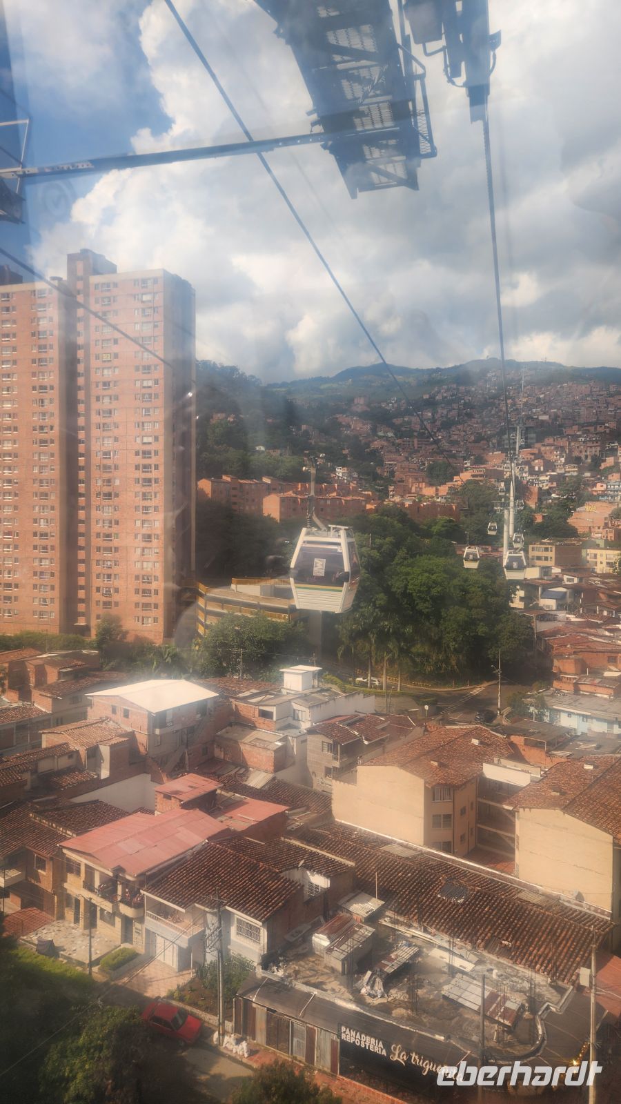 Anschließend fahren wir mit der Metroseilbahn, einem modernen Verkehrsmittel, das viele höher gelegene Stadtteile mit der Metro verbindet. Die Fahrt ist ruhig und gleichzeitig beeindruckend – wir genießen den weiten Blick über Medellín, seine Berge und die unzähligen Häuser, die sich an die Hänge schmiegen.