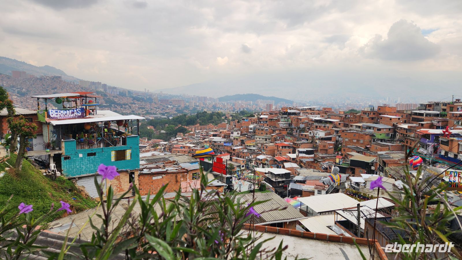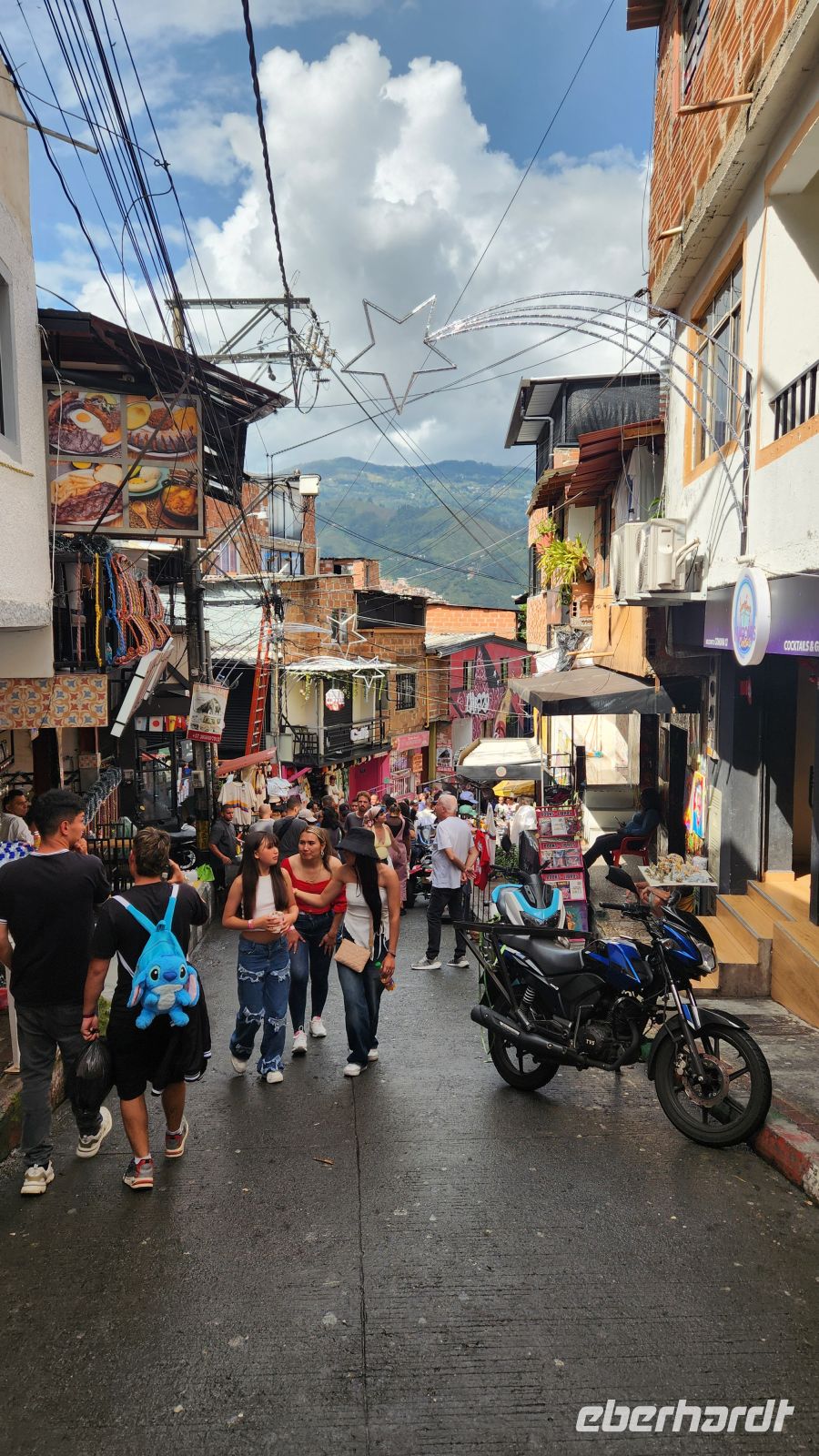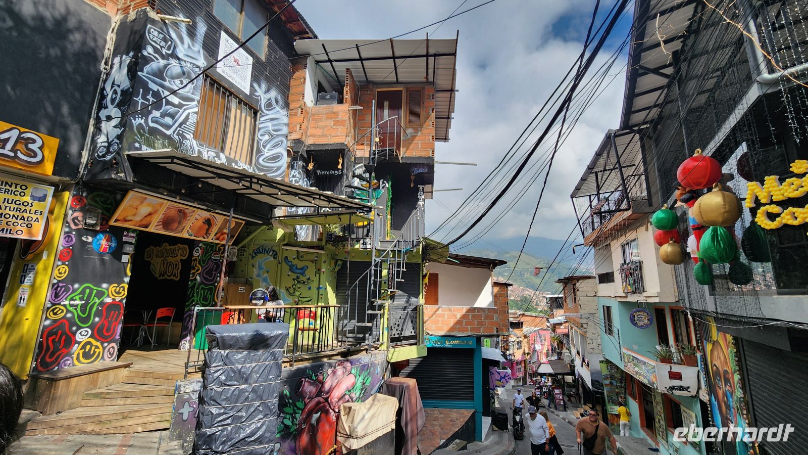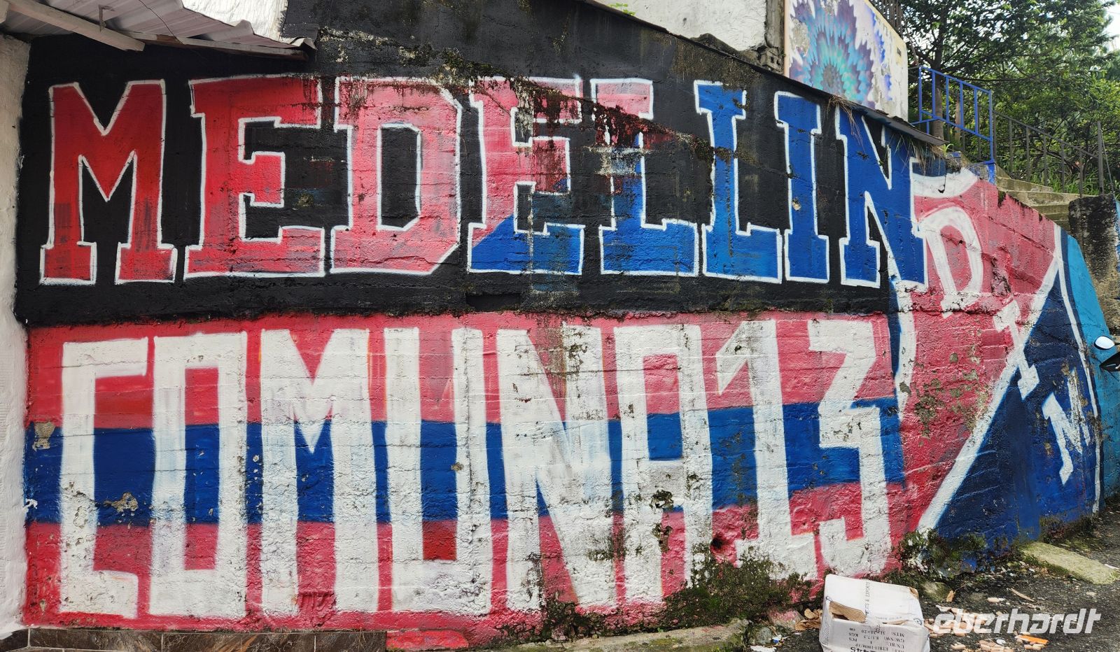 Am Vormittag besuchen wir La Comuna 13, ein Viertel, das früher zu den gefährlichsten Orten Medellíns gehörte. In den 80er- und 90er-Jahren kontrollierten hier Guerilla-Gruppen, Paramilitärs und das Medellín-Kartell große Teile des Alltags. Gewalt, Drogenhandel und ständige Auseinandersetzungen prägten das Leben der Bewohner.