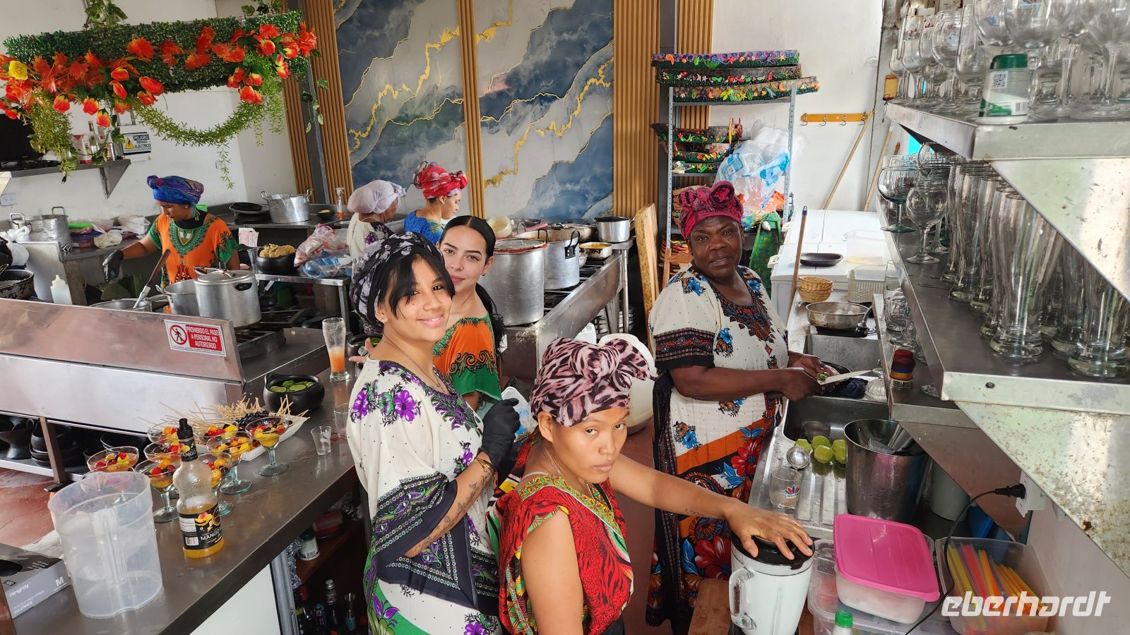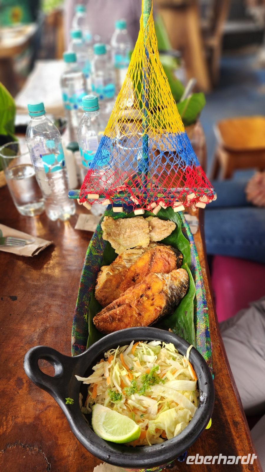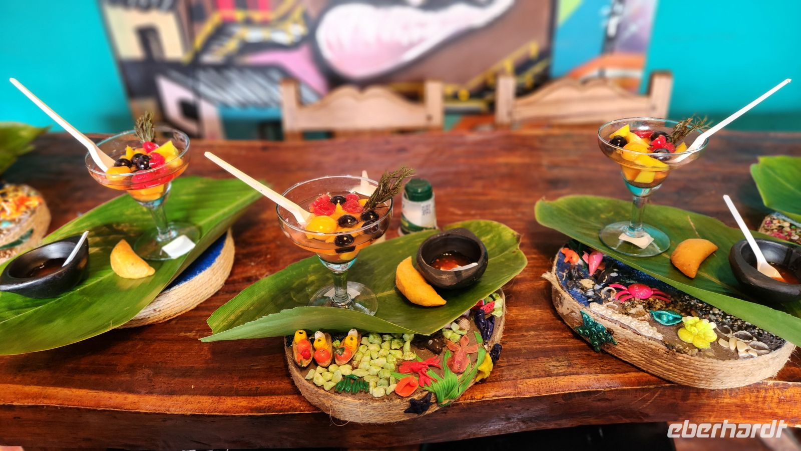 Zu Mittag essen wir im Restaurant Berracas. Hier arbeiten ausschließlich Frauen, viele aus benachteiligten Vierteln, die mit Stolz traditionelle afrikanische Kleidung tragen – ein Hinweis auf die afro-kolumbianischen Wurzeln vieler Bewohner. Die Gerichte sind nicht nur köstlich, sondern werden mit unglaublich viel Liebe und sehr kunstvoll angerichtet. Ein Ort voller Herz und Wärme.
