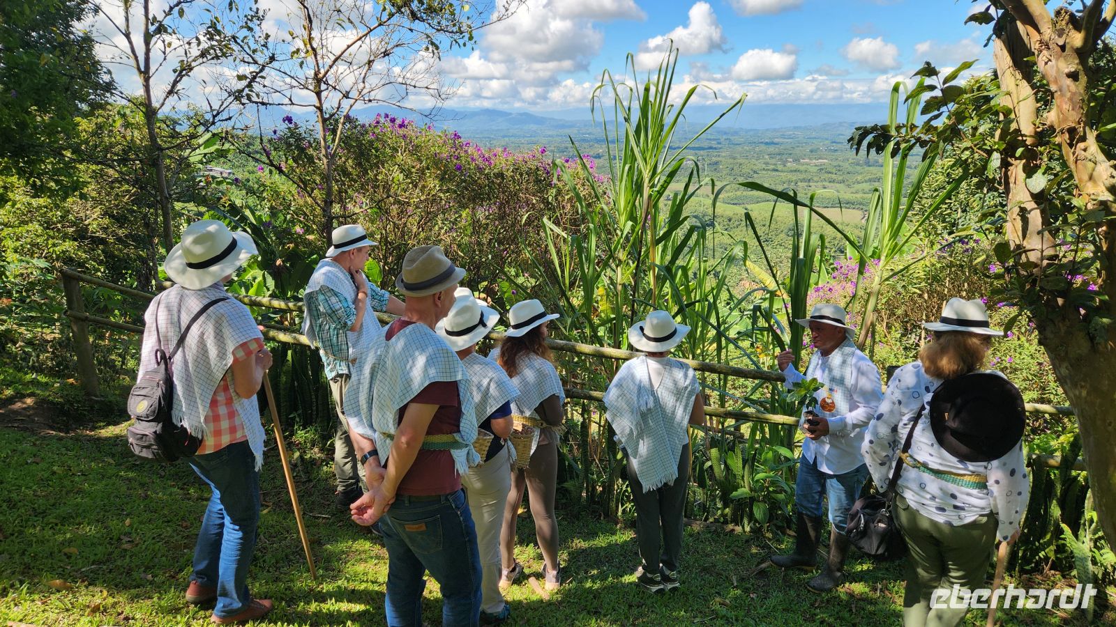 Wir bekommen Ponchos und typische Hüte – ein kleines Detail, das der Führung ein besonderes Ambiente verleiht. Wieder dürfen wir Kaffeekirschen pflücken und sammeln sie in kleinen Körbchen, die wir um den Bauch tragen. Die Sonne scheint, der Himmel ist klar, und zwischen den grünen Reihen der Pflanzen genießen wir jeden Augenblick.