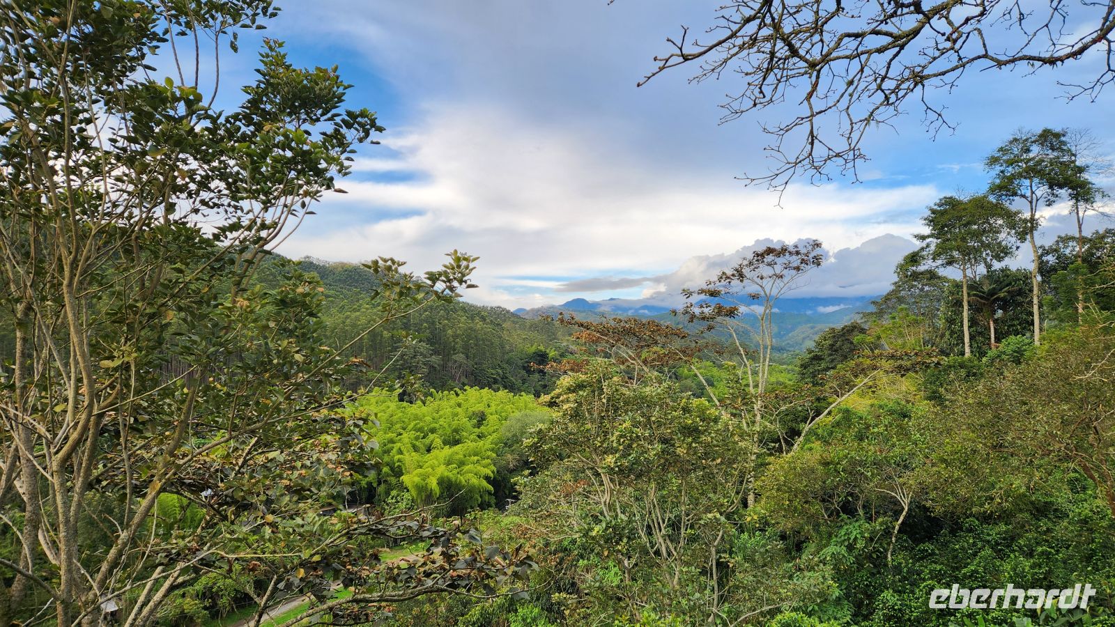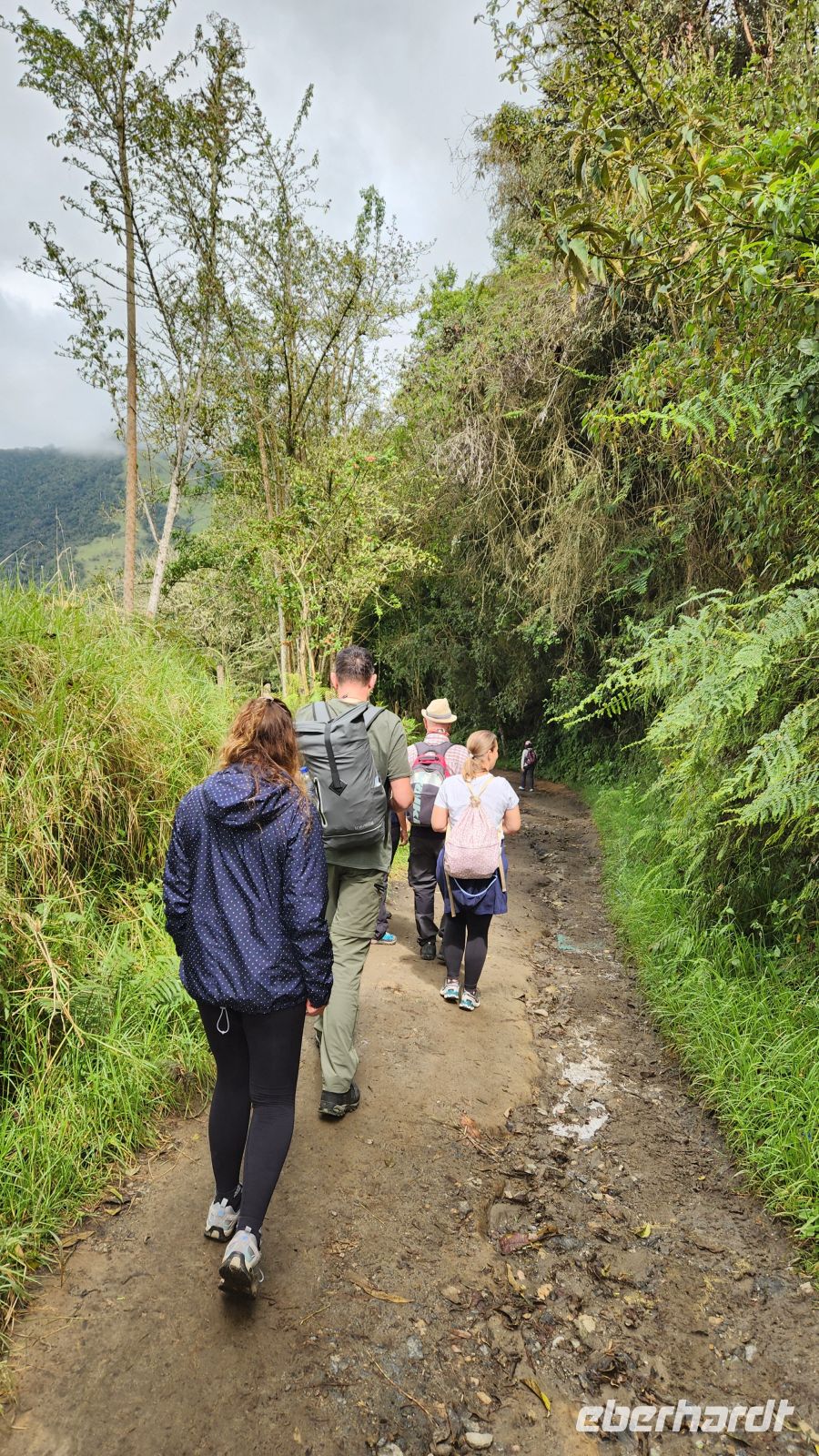 Für den Rückweg steigen wir ab und wandern zu Fuß wieder hinunter – eine schöne Abwechslung. Unsere Reiseleiterin Francy bleibt immer wieder stehen, zeigt uns Pflanzen und Vögel und erzählt viel über die Natur und ihre Heimatregion.