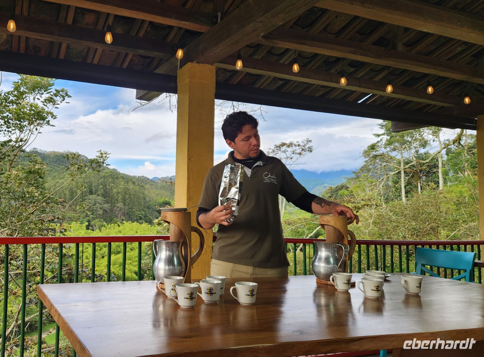Die Kaffeeplantage ist weitläufig und wunderschön: ein Kolonialhaus mit Veranda, Gärten und weiten Feldern voller Kaffeepflanzen. Wir pflücken sogar selbst ein paar reife Kaffeekirschen, und uns wird der gesamte Prozess erklärt – vom Samen bis zur getrockneten Bohne. Zum Abschluss probieren wir natürlich den frisch zubereiteten Kaffee, aromatisch und unvergleichlich gut.
