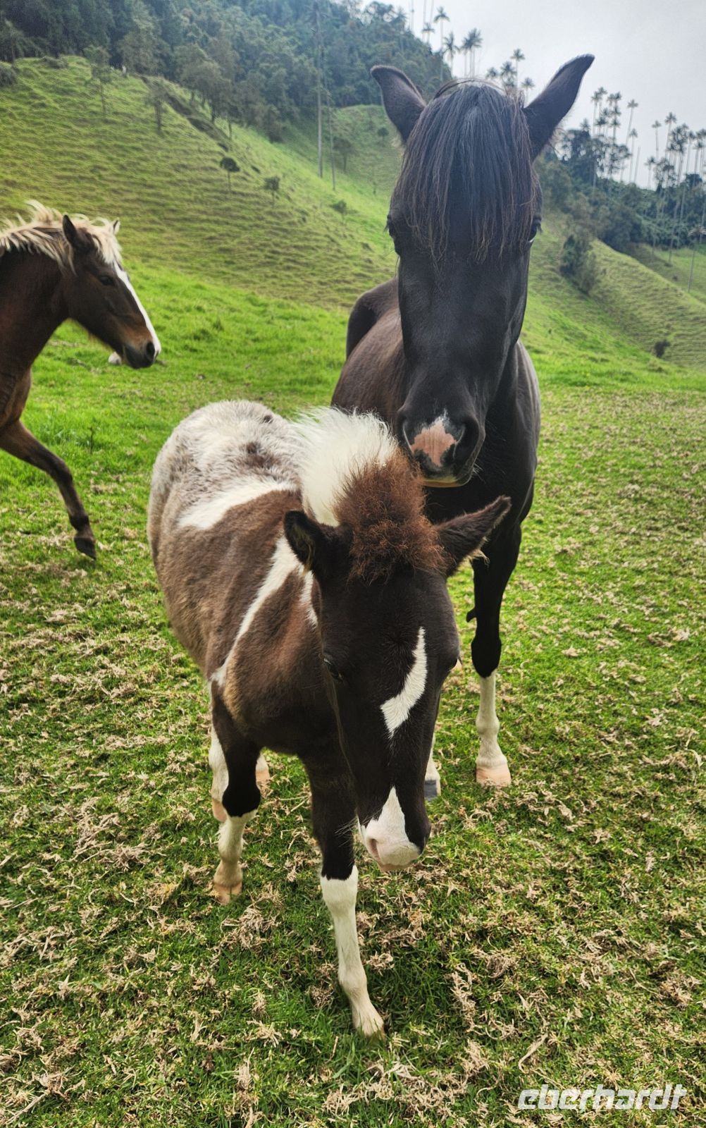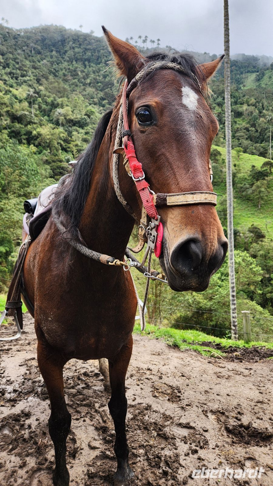 Die Pferde bringen uns bis zu einem Aussichtspunkt. Dort oben haben wir unglaubliches Glück: Das Cocora-Tal ist an vielen Tagen in dichte Wolken gehüllt, doch heute zeigt sich die Landschaft offen und weit. Die langen Wachspalmen stehen klar und majestätisch vor uns, und wir können den Blick bis tief ins Tal schweifen lassen. Natürlich halten wir diesen Moment mit Erinnerungsfotos fest.
