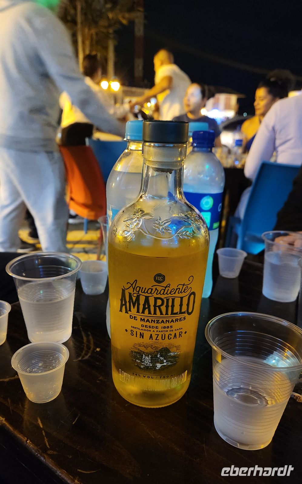 Wie alle hier bestellen wir eine Flasche Aguardiente Amarillo, den typischen Anisschnaps der Region, der gerne in Gesellschaft getrunken wird – leicht süßlich und ideal für lange Abende.