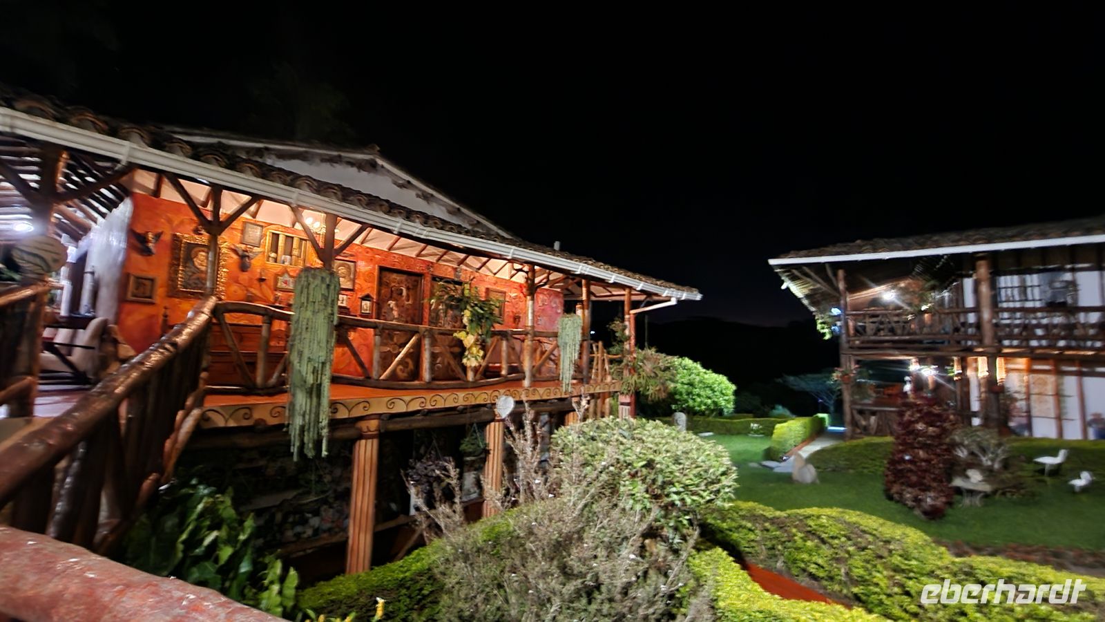 Die Lodge liegt malerisch am Hang, umgeben von Gärten, Bäumen und üppigem Grün. Von hier aus haben wir einen traumhaften Blick über das Tal und auf San Agustín, das tief unten zwischen den Hügeln liegt.