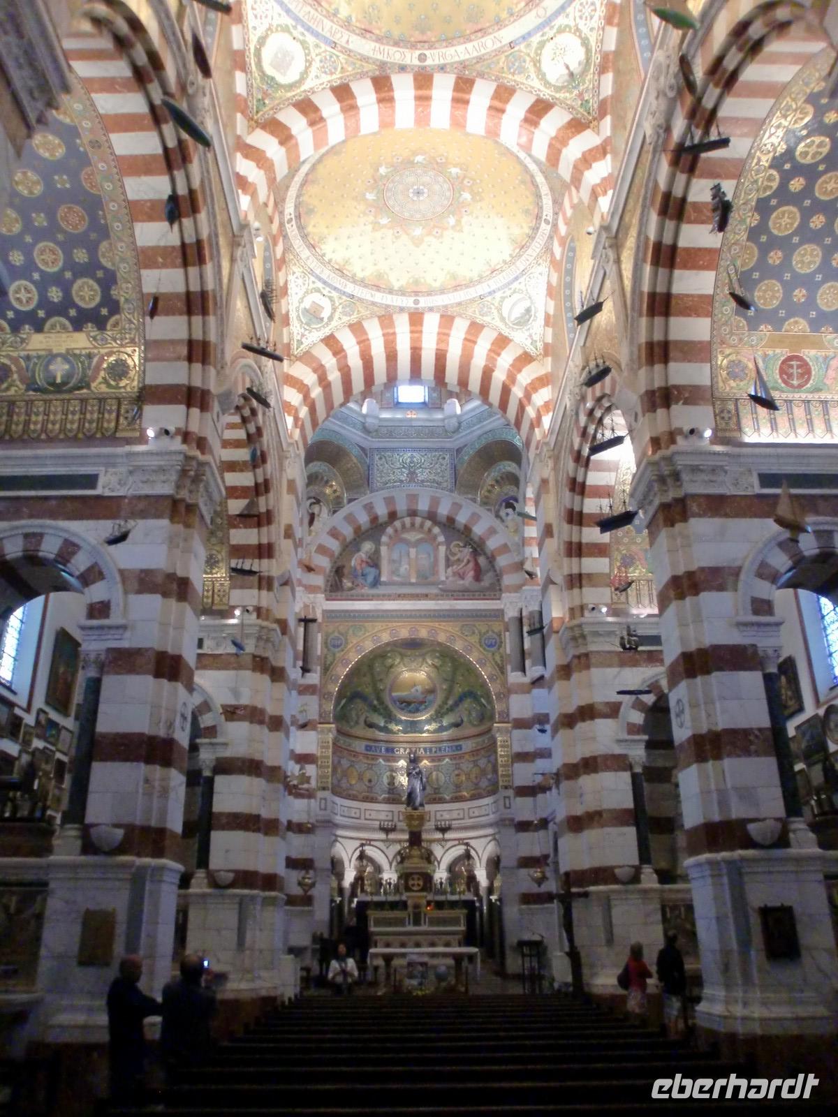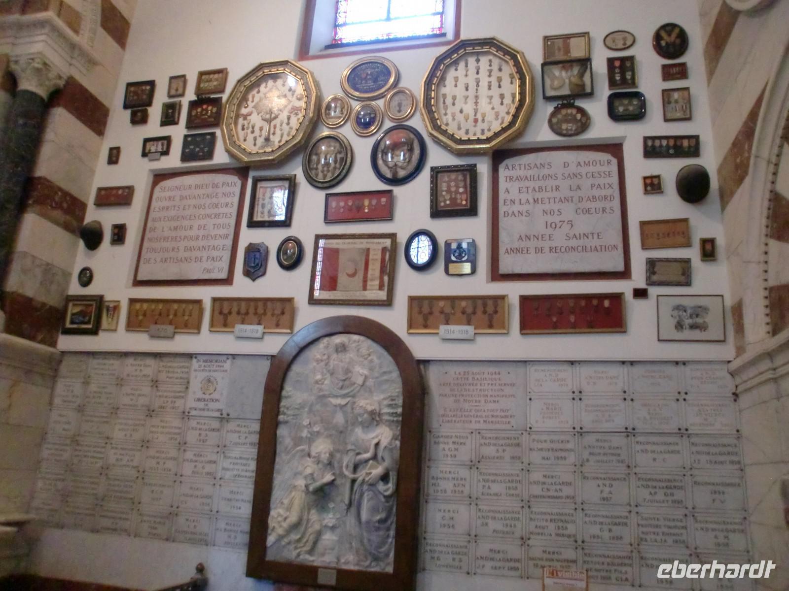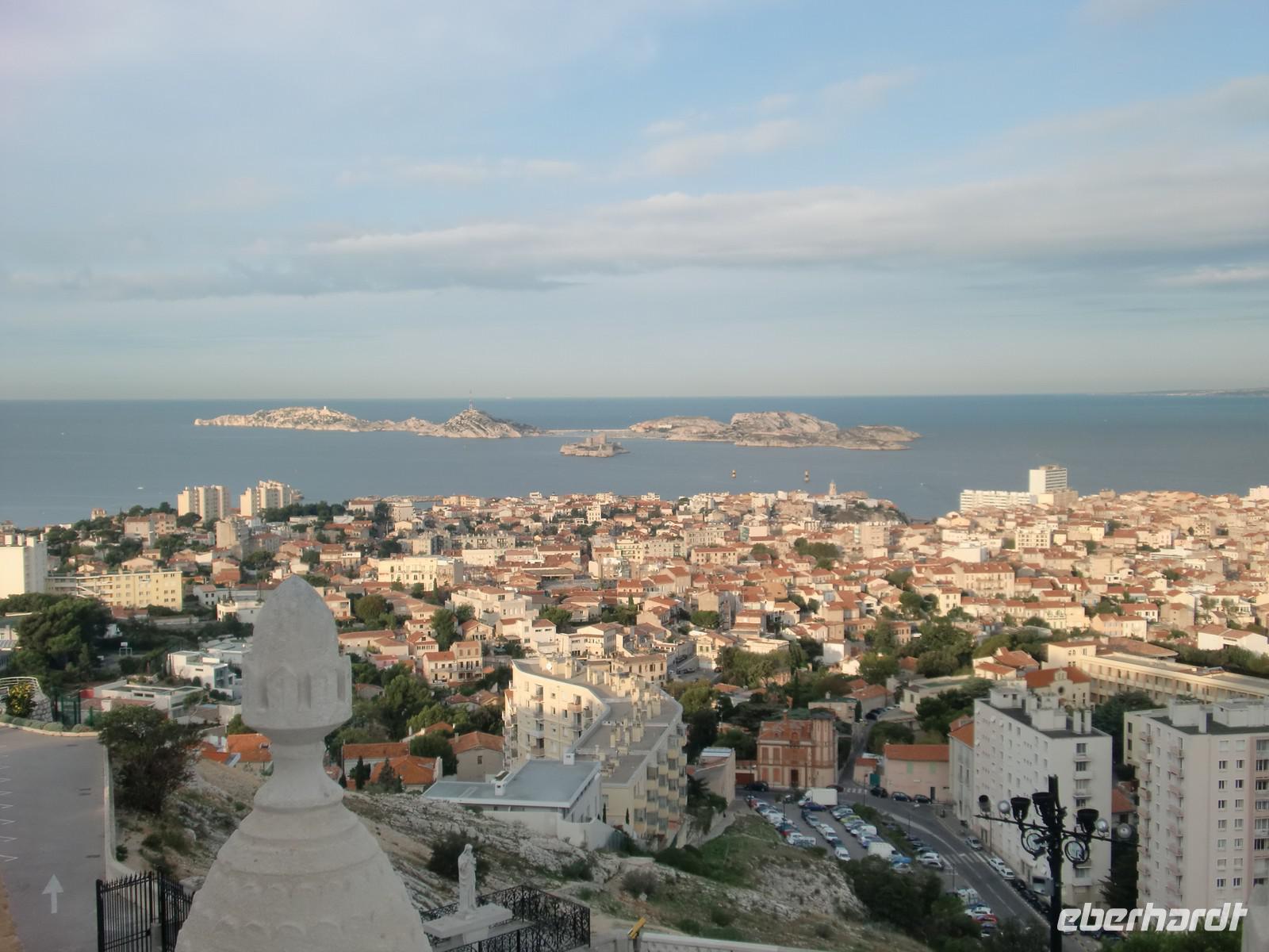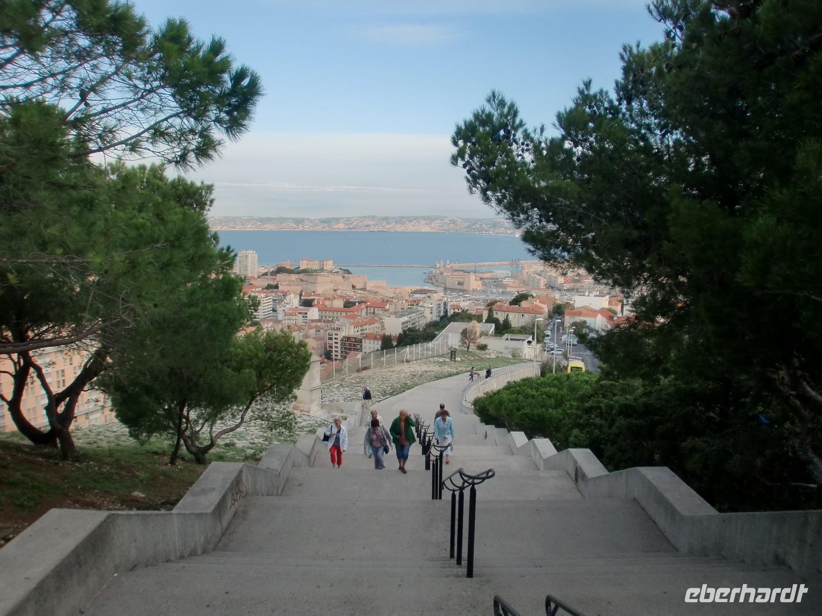 Nachdem wir durch enge Strassen etwas außerhalb von Marseille die Notre Dame de la Garde errreichten, eröffnete sich nach einigen Treppenstufen und einem steilen Aufstieg ein fantastischer Blick über Marseille. Sicherlich ist das auch einer Hauptgründe, warum man hier her kommt. So hat man schon viele schöne Kirchen während der Reise gesehen.