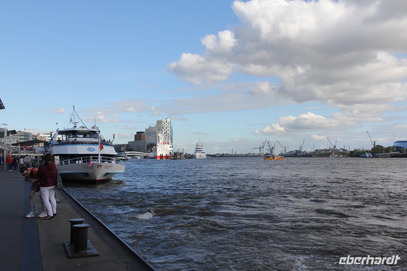 Um 11 Uhr verlassen wir unsere Zimmer und verladen wir unsere Sieben Sachen im Bus. Dann geht es runter zu den Landungsbrücken. Mit einem Glas Wackerbarth Sekt in der einen und einem Fischbrötchen in der anderen Hand versuchen wir die Queen Mary 2 von weitem am Terminal Steinwerder auszumachen. Voller Erwartungen steigen wir in den Bus, der uns zum Schiff bringt.