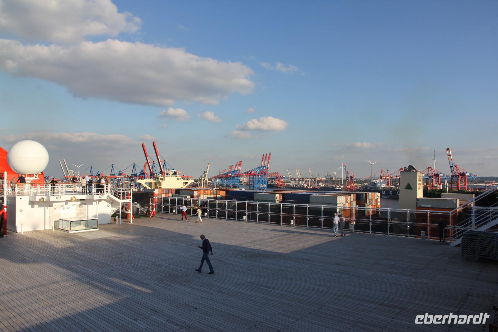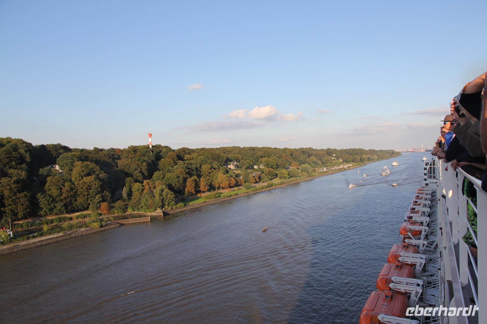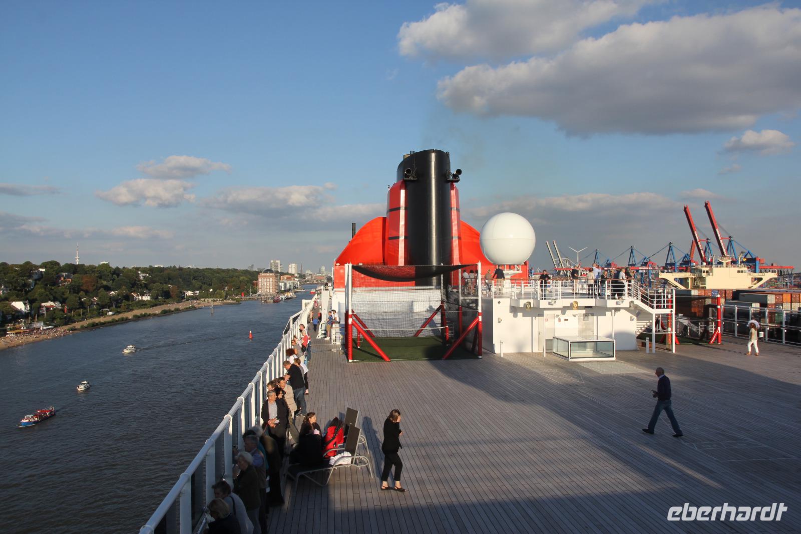 Im Terminal, welches von den 15 Etagen der Königin der Meere überragt wird, werden unsere Koffer hilfsbereit aus dem Bus geholt und reihen wir uns brav in die Schlange zum Einchecken ein. Trotzdem sind wir so zeitig an Bord und in unserer Kabine, dass wir noch fast 2 Stunden Zeit zum Erkunden und Bestaunen der Einrichtungen des Schiffs haben, bevor wir zur Seenotrettungsübung gerufen werden. Dann ertönt dreimal das ohrenbetäubende Schiffshorn beim Ablegen. Viele von uns stehen auf dem Lookout des obersten Decks begleiten fast 2 Stunden die Vorbeifahrt an Hamburg, an den Vororten Hamburgs und den villengesäumten Hängen des Elbufers. Wir winken den Farewell-Sängern und tausenden Grüßenden, die am Ufer stehen und dem Schiff die Ehre erweisen.